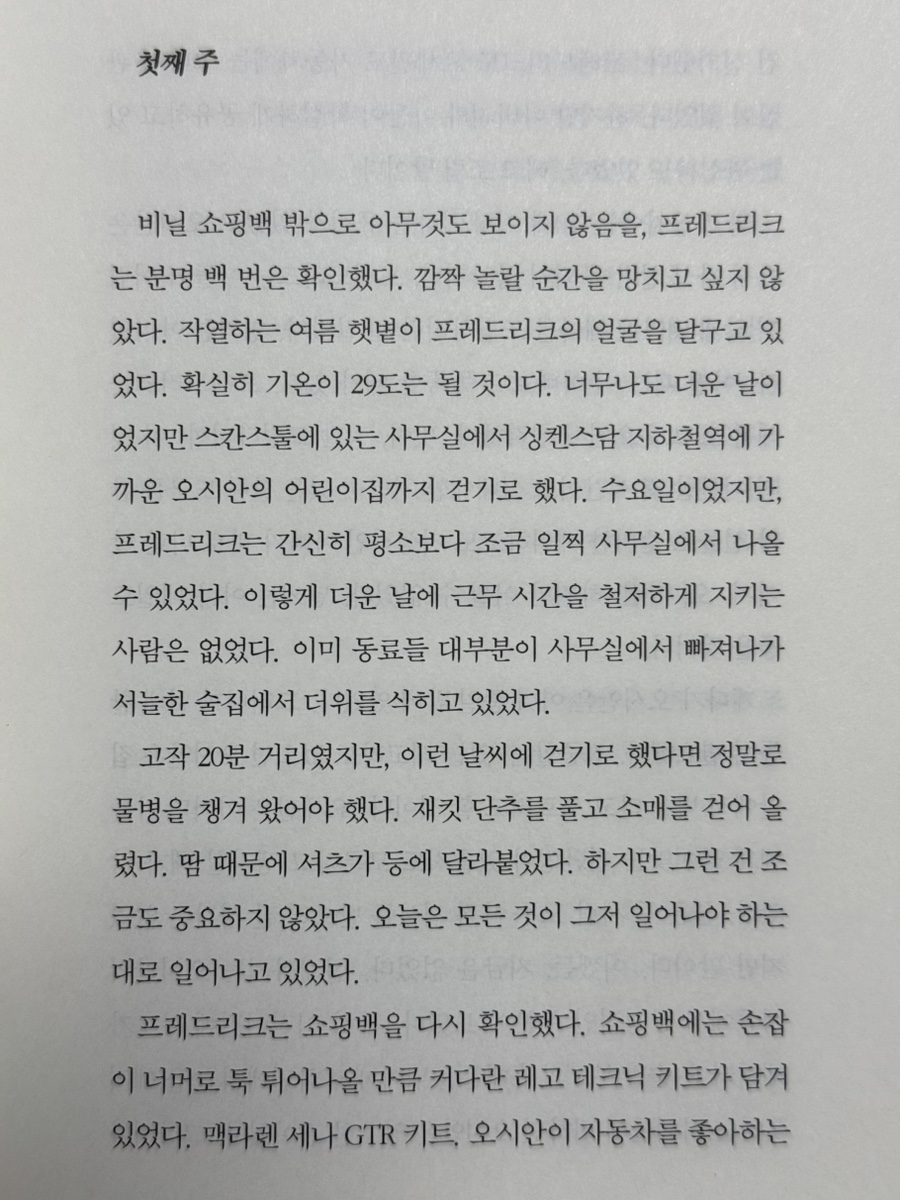 미스터리 스릴러물의 책을 오랜만에 읽었다. 이런 장르의 책을 접한 것은 너무 오래되어 기억조차 가물가물하다. 책의 표지가 재미있다. 무언가 궁금증을 유발하는 디자인이다. 그래서 더 끌렸던 것 같다. 어떤 책일까? 궁금했다. 무슨 이야기를 하고 있을까 더 기대되었다. 이 책은 목차도 없이 바로 내용으로 시작된다. 조금은 의아하기도 했지만 서서히 읽어나가기 시작했다.