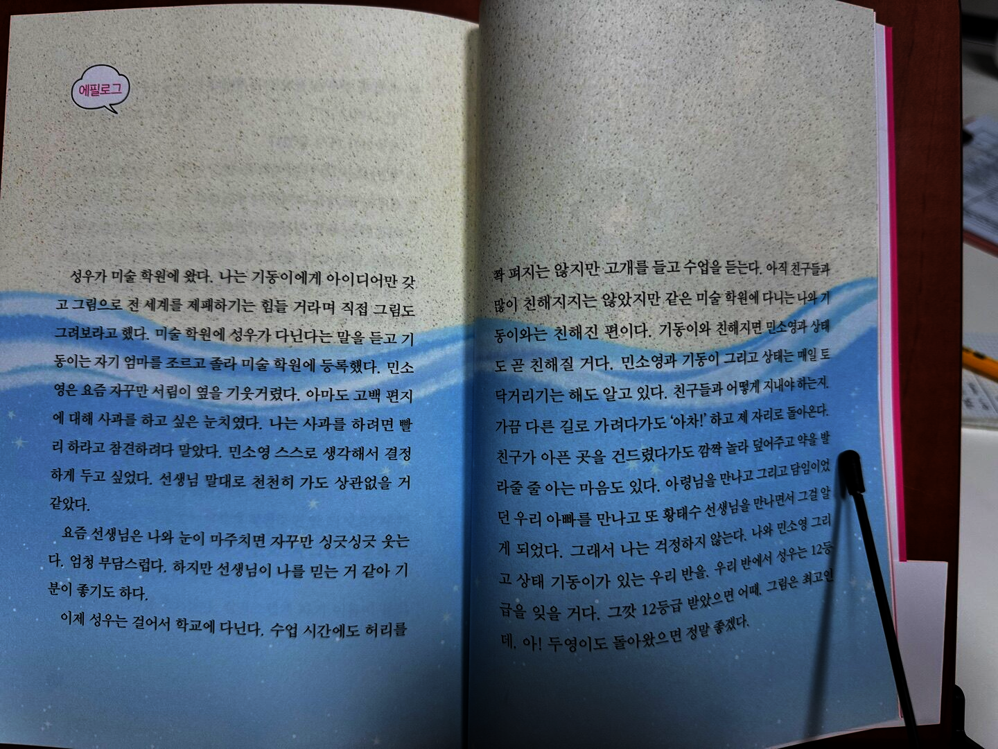 그리고 선생님께서 책갈피의 행방에 대한 힌트를 주시고, 아이들이 책갈피를 찾게 되지요. 이렇게 아이들의 오해는 서로 풀리게 됩니다.