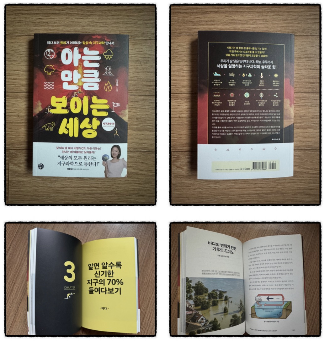 *본 포스팅은 책은 무상으로 제공받고 개인적으로 솔직하게 작성한것 입니다안녕하세요 리엔토 입니다. 오늘 서평책은 [아는 만큼 보이는 세상] 입니다. 이책의 저자는 양은혜 작가님으로 현재 고등학교 지구과학 선생님이십니다 EBSi 강사 이시기도 하구요. 대중들에게 쉽고 체계적으로 지구과학을 흥미롭게 접근하도록 노력하는 분이세요 책의 목차는 아래와 같습니다. CHAPTER1.내 발 밑에서 시작하는 지구 탐구 - 지질 CHAPTER2.날씨부터 태풍까지 공기와 바람의 비밀 - 대기 CHAPTER3.알면 알수록 신기한 지구의 70% 들여다보기 - 바다 CHAPTER4.지구를 넘어 더 넓은 세상으로 나아가기 - 우주 크게 4챕터로 나뉘며 소제목으로는 질문의 형태로 많이 되어 있습니다. 물음표가 참 많네요 ㅎ 확실히 현직 교사분께서 쓰신 내용이라 학생들의 질문을 모아서 쓰신거 같기도 합니다 - 사실 이 책을 선택한 계기는 따로 있습니다. 바로 아이가 부모랑 같이 생활을 하다보면 다양한 질문이 생깁니다. 이건 뭐야 저건 뭐야 특히 6살을 향해가는 아이에게 모든 것들이 다 궁금합니다. 그래서 이 책이 유용하다고 생각합니다. 최근에 가족이 함께 비행기를 타고 이동하였습니다. 그거 아시죠? 이륙할때 귀가 먹먹해지는거 아이가 어릴때는 귀를 막고 입에 먹을꺼 주면서 귀 먹먹함을 못느끼게 해줬지만 이제는 특별히 액션을 하지 않습니다. 그리고 이렇게 질문 할수 있죠. 아빠 왜 비행기를 타면 귀가 먹먹해지는거야? 라고 ㅎㅎ 그럴때 어떻게 이야기 해주시겠습니까 기압이라는 다소 아이에게 어려운 단어가 있지만 이 파트를 읽으면 적어도 아이에게 설명은 해줄수 있습니다. 이책은 본인 스스로 지식을 쌓는 책이라기보다는 아이와 함께 읽거나 아이가 있는 부모가 읽어야 하는 책인거 같습니다 - 오로라도 마찬가지 입니다. 영화나 티비를 보면 유럽의 북쪽 지역에서나 볼수 있는 오로라 입니다. 아이는 그 오로라를 보면서 이렇게 질문할수 있죠 아빠 왜 오로라는 한국에서 볼수 없어? 라고 ㅎㅎ 물론 아직 6살이라 이런 질문이 어렵겠지만 초등학교 올라가면 분명히 할수 있는 질문이라 생각합니다. 그에 대한 해답도 이책에는 있습니다. 오로라를 한국에서 보는것이 전혀 불가능은 아니라고 합니다. 이미 관측된 사례도 있구요 알고 계셨나요? 오늘 읽은책은 일상생활에서 발생하는 과학 이야기를 재미있고 쉽고 편하고 읽히기 좋게 풀어낸 책 입니다. 가벼운 지식 쌓기 좋은 책 재밌게 잘 읽었습니다~ 리엔토 였습니다 감사합니다. |