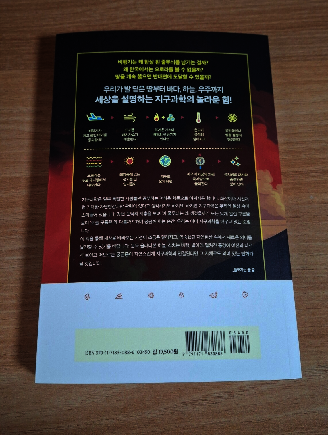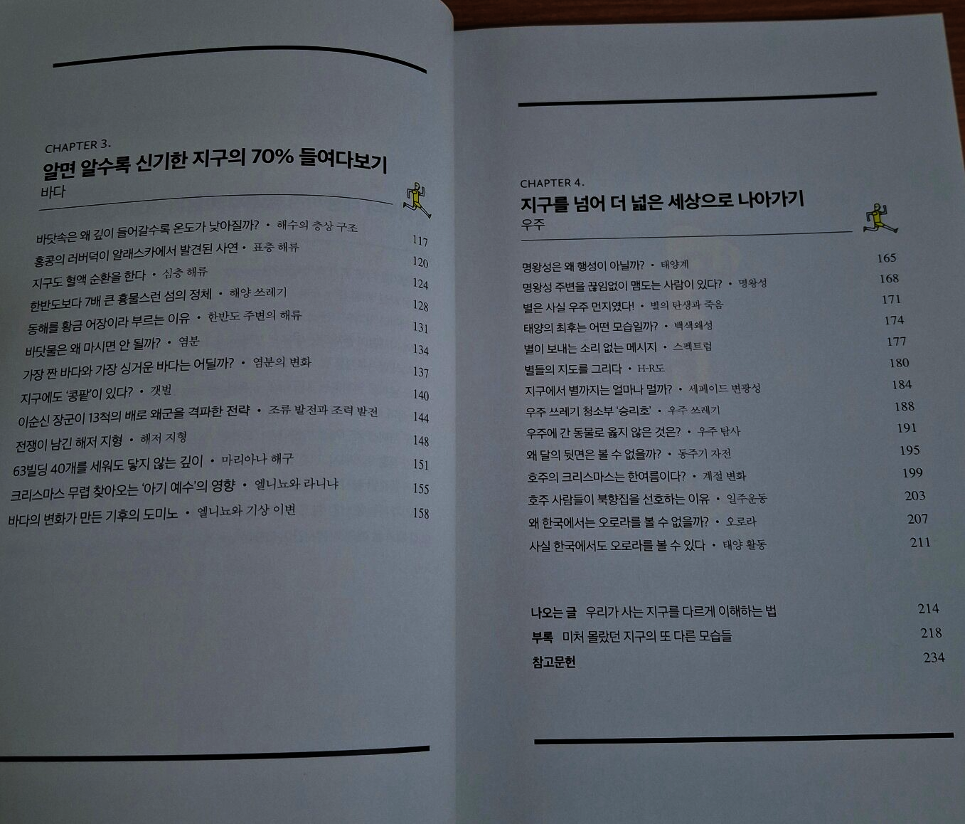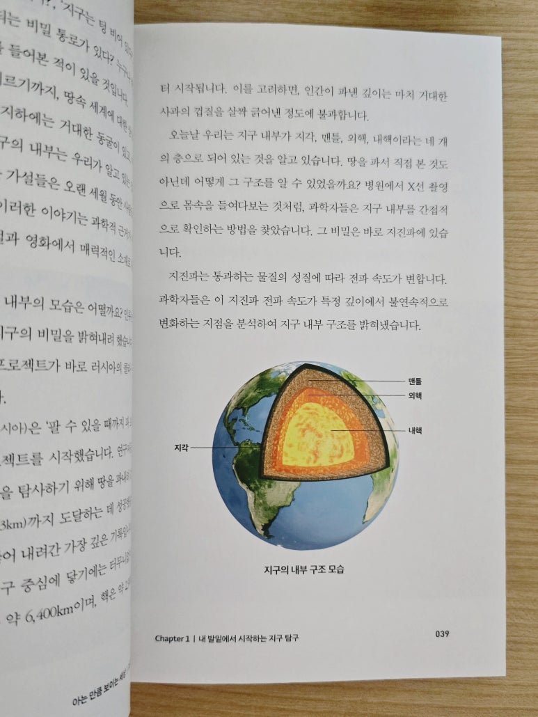 지구 형성 초기 마그마의 바다 상태에서 철, 니켈 등의 무거운 금속 성분들은 중심 쪽으로 가라앉아 핵이 되었고, 규소, 산소 등의 밀도가 작은 원소들은 표면쪽으로 이동하여 맨틀이 되었다. 지구는 지각, 맨틀, 핵으로 이루어졌다. 미행성체의 충돌이 줄어들면서 지구가 서서히 식어감에 따라 표면이 단단히 굳었다. 대기의 수증기가 물방울이 되어 구름을 만들었다. 구름에서 내린 비가 땅에 고여 최초의 바다가 되었다. 땅, 대기, 바다가 갖추어진 것이다. 선(先) 캄브리아 시대의 지층에서는 화석이 거의 발견되지 않아 당시 환경이나 생물을 알기 어렵다. 긴 시간 동안 여러 차례 지각 변동을 받아 화석이 변형되거나 사라졌기 때문이다. 고생대 석탄기에는 양치식물이 거대한 삼림을 이루었고 이로 인해 대기 중 산소 함량이 약 35%로 급격히 증가했다. 현재의 21%에 비하면 아주 높은 함량이다. 인류가 수직으로 가장 깊게 뚫은 구멍의 깊이는 12km에 지나지 않는다. 이 길이는 지구 반지름(6400km)을 감안하면 사과 표면을 살짝 긁어낸 정도에 지나지 않는다. 지진파는 통과하는 물질의 성질에 따라 전파 속도가 변한다. 과학자들은 지진파의 전파 속도가 특정 깊이에서 불연속적으로 변하는 지점을 분석하여 지구 내부 구조를 밝혔다. 암석을 이루는 다양한 알갱이들을 광물이라 한다. 지금까지 알려진 광물의 종류는 4,000여종이고 매년 새 것들이 발견된다. 실제로 암석을 구성하는 주요 광물은 30여종이다. 이들을 조암(造巖) 광물이라 한다. 석영(quartz)은 전기 에너지를 받으면 일정하고 정확하게 초당 32, 768번 진동한다. 각 광물은 저마다 특정한 정출(晶出) 온도와 고유의 결정형을 갖는다. 암석들에는 수억년 동안 지구가 겪어온 변화와 사건의 흔적이 고스란히 새겨져 있다. 동굴은 형성 과정에 따라 석회동굴과 용암동굴로 나뉜다. 우리나라 용암동굴은 제주도에서만 존재한다. 용암동굴은 용암이 흘러가는 동안 표면은 차가운 공기와 만나 빠르게 굳고 내부의 용암은 빠져나가면서 형성된다. 지구 표면(판)은 여러 조각으로 이루어진 축구공 같으나 축구공과 달리 끊임없이 움직인다. 속도는 느리지만 거대한 판들의 움직임은 판의 경계에서 엄청난 사건을 만든다. 태평양 불의 고리에서 나타나는 판 경계는 대부분 섭입형 경계다. 이곳에서는 밀도가 큰 판이 밀도가 작은 판 아래로 들어가면서 지진과 화산 활동이 자주 일어난다. 현재 태평양은 좁아지고 있고 대서양은 넓어지고 있다. 이는 판구조론으로 설명할 수 있다. 태평양 가장자리에 수렴형 경계가 있고 대서양 한가운데 발산형 경계가 있다. 대서양을 이루는 판들이 서로 멀어짐에 따라 생긴 빈 공간으로 마그마가 올라와 새로운 해양 지각을 형성한다. 일상에서 우리에게 가해지는 대기압은 약 1기압이다. 대기압은 높은 곳으로 갈수록 낮아진다. 지구는 대기로 둘러싸여 있다. 대기의 무게로 인해 우리가 받는 힘을 대기압이라 한다. 1기압이란 해수면에서의 대기압이다. 높은 산에 올라가면 우리를 누르는 공기 무게가 줄어들어 1기압보다 낮아지고 깊은 물속에 들어가면 공기의 무게에 물의 무게가 더해져 1기압보다 높아진다. 높은 산에 오르면 과자 봉지 속 압력은 1기압이지만 대기압은 기압보다 낮아 기압 차이가 없어질 때까지 과자 봉지의 부피가 점점 부풀어 오른다. 하늘의 구름은 기체가 아닌 액체 상태다. 물방울의 반지름이 약 0.02mm로 매우 작기 때문에 하늘에 떠 있을 수 있다. 외부와 열 교환 없이 공기의 부피가 팽창하면 온도가 낮아진다. 이를 단열팽창이라 한다. 스프레이(에어로졸)를 뿌릴 경우가 예이다. 지구도 자외선 차단제를 바른다. 최초의 지구에는 자외선을 막아주는 오존층이 없었다. 바닷속 남세균의 광합성으로 대기 중 산소가 축적되면서 오존층이 생겨났다. 지구 최초의 생명체는 육지가 아닌 바다에서 생겨났을 것이다. 자외선으로부터 안전한 곳이기 때문이리라. 현재 지구 대기의 주성분은 질소와 산소다. 지구 탄생 초기 원시 대기에는 질소는 있었지만 산소는 거의 없었다. 산소는 바닷속 남세균의 광합성으로 만들어졌고 대기로 방출되어 산소가 쌓이기 시작했다. 이렇게 만들어진 대기 중 산소 분자는 태양으로부터 온 자외선과 반응하여 산소 원자 두 개로 분리된다. 산소 원자와 아직 분리되지 않은 산소 분자가 오존층을 형성하였다. 오존의 90% 이상은 고도 약 20~30km 사이에 모여 있다. 이를 오존층이라 한다. 해양 지각의 평균 두께는 5km이고 대륙 지각의 평균 두께는 35km이다. 그 아래 2900km까지가 맨틀이다. 핵은 그 아래에서 지구 중심까지로 암석이 아닌 금속으로 이루어져 있다. 바다의 평균 수심은 약 3,5km다. 해수는 깊이에 따라 수온이 달라지는 세 개의 층으로 나뉜다. 지구 표면의 70% 이상이 푸른 바다로 덮여 있다. 심해(深海)는 태양 복사 에너지가 도달하지 않아 차갑고 어둡다. 해수면에 도달한 태양 복사 에너지는 약 200미터 이내에서 모두 흡수되기에 그보다 깊은 바다에는 태양 복사에너지가 닿지 않는다. 해수 온도는 깊이가 깊어질수록 낮아질까? 대체로 그렇지만 해수는 깊이에 따라 수온이 일정하거나 