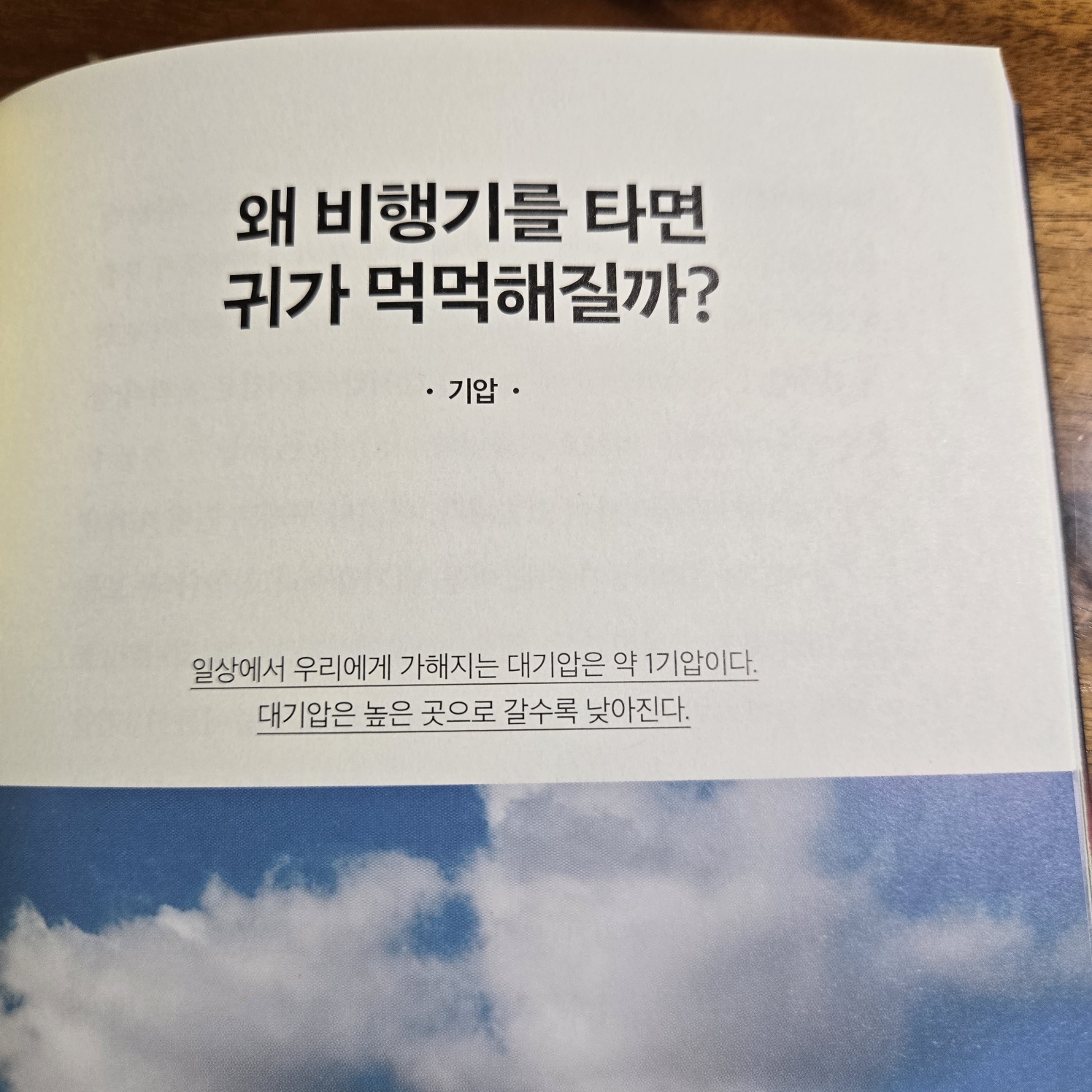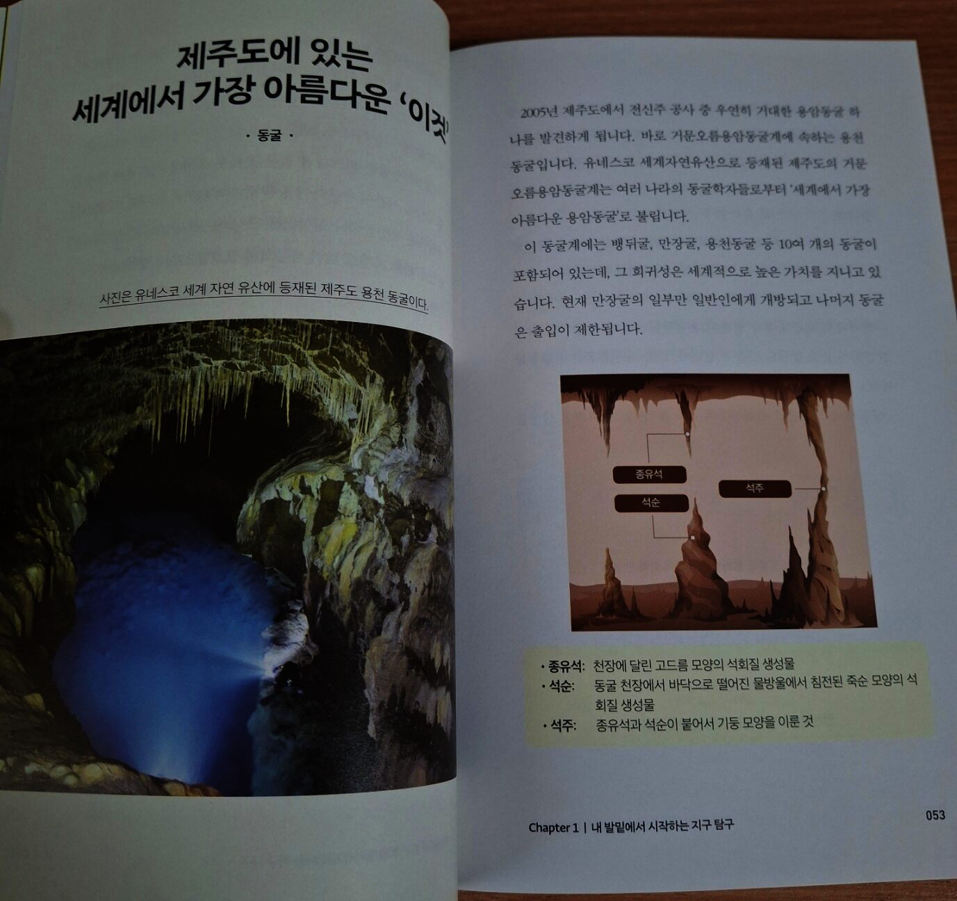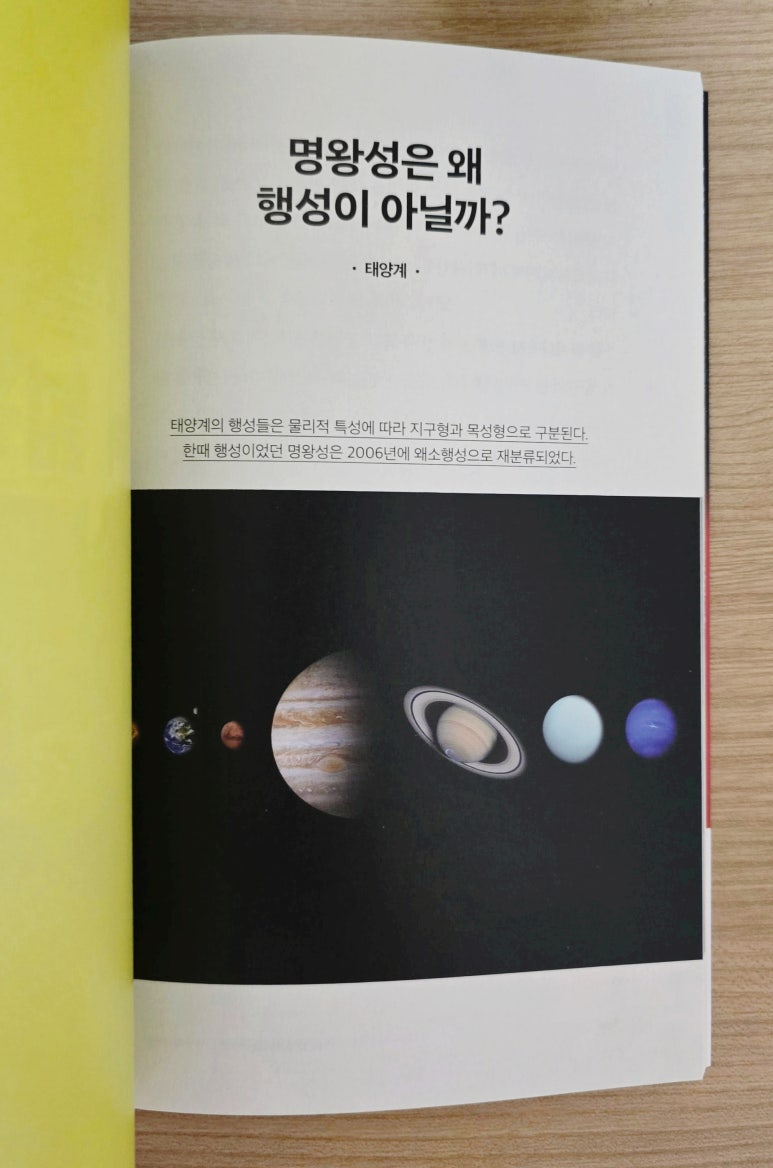 지구 형성 초기 마그마의 바다 상태에서 철, 니켈 등의 무거운 금속 성분들은 중심 쪽으로 가라앉아 핵이 되었고, 규소, 산소 등의 밀도가 작은 원소들은 표면쪽으로 이동하여 맨틀이 되었다. 지구는 지각, 맨틀, 핵으로 이루어졌다. 미행성체의 충돌이 줄어들면서 지구가 서서히 식어감에 따라 표면이 단단히 굳었다. 대기의 수증기가 물방울이 되어 구름을 만들었다. 구름에서 내린 비가 땅에 고여 최초의 바다가 되었다. 땅, 대기, 바다가 갖추어진 것이다. 선(先) 캄브리아 시대의 지층에서는 화석이 거의 발견되지 않아 당시 환경이나 생물을 알기 어렵다. 긴 시간 동안 여러 차례 지각 변동을 받아 화석이 변형되거나 사라졌기 때문이다. 고생대 석탄기에는 양치식물이 거대한 삼림을 이루었고 이로 인해 대기 중 산소 함량이 약 35%로 급격히 증가했다. 현재의 21%에 비하면 아주 높은 함량이다. 인류가 수직으로 가장 깊게 뚫은 구멍의 깊이는 12km에 지나지 않는다. 이 길이는 지구 반지름(6400km)을 감안하면 사과 표면을 살짝 긁어낸 정도에 지나지 않는다. 지진파는 통과하는 물질의 성질에 따라 전파 속도가 변한다. 과학자들은 지진파의 전파 속도가 특정 깊이에서 불연속적으로 변하는 지점을 분석하여 지구 내부 구조를 밝혔다. 암석을 이루는 다양한 알갱이들을 광물이라 한다. 지금까지 알려진 광물의 종류는 4,000여종이고 매년 새 것들이 발견된다. 실제로 암석을 구성하는 주요 광물은 30여종이다. 이들을 조암(造巖) 광물이라 한다. 석영(quartz)은 전기 에너지를 받으면 일정하고 정확하게 초당 32, 768번 진동한다. 각 광물은 저마다 특정한 정출(晶出) 온도와 고유의 결정형을 갖는다. 암석들에는 수억년 동안 지구가 겪어온 변화와 사건의 흔적이 고스란히 새겨져 있다. 동굴은 형성 과정에 따라 석회동굴과 용암동굴로 나뉜다. 우리나라 용암동굴은 제주도에서만 존재한다. 용암동굴은 용암이 흘러가는 동안 표면은 차가운 공기와 만나 빠르게 굳고 내부의 용암은 빠져나가면서 형성된다. 지구 표면(판)은 여러 조각으로 이루어진 축구공 같으나 축구공과 달리 끊임없이 움직인다. 속도는 느리지만 거대한 판들의 움직임은 판의 경계에서 엄청난 사건을 만든다. 태평양 불의 고리에서 나타나는 판 경계는 대부분 섭입형 경계다. 이곳에서는 밀도가 큰 판이 밀도가 작은 판 아래로 들어가면서 지진과 화산 활동이 자주 일어난다. 현재 태평양은 좁아지고 있고 대서양은 넓어지고 있다. 이는 판구조론으로 설명할 수 있다. 태평양 가장자리에 수렴형 경계가 있고 대서양 한가운데 발산형 경계가 있다. 대서양을 이루는 판들이 서로 멀어짐에 따라 생긴 빈 공간으로 마그마가 올라와 새로운 해양 지각을 형성한다. 일상에서 우리에게 가해지는 대기압은 약 1기압이다. 대기압은 높은 곳으로 갈수록 낮아진다. 지구는 대기로 둘러싸여 있다. 대기의 무게로 인해 우리가 받는 힘을 대기압이라 한다. 1기압이란 해수면에서의 대기압이다. 높은 산에 올라가면 우리를 누르는 공기 무게가 줄어들어 1기압보다 낮아지고 깊은 물속에 들어가면 공기의 무게에 물의 무게가 더해져 1기압보다 높아진다. 높은 산에 오르면 과자 봉지 속 압력은 1기압이지만 대기압은 기압보다 낮아 기압 차이가 없어질 때까지 과자 봉지의 부피가 점점 부풀어 오른다. 하늘의 구름은 기체가 아닌 액체 상태다. 물방울의 반지름이 약 0.02mm로 매우 작기 때문에 하늘에 떠 있을 수 있다. 외부와 열 교환 없이 공기의 부피가 팽창하면 온도가 낮아진다. 이를 단열팽창이라 한다. 스프레이(에어로졸)를 뿌릴 경우가 예이다. 지구도 자외선 차단제를 바른다. 최초의 지구에는 자외선을 막아주는 오존층이 없었다. 바닷속 남세균의 광합성으로 대기 중 산소가 축적되면서 오존층이 생겨났다. 지구 최초의 생명체는 육지가 아닌 바다에서 생겨났을 것이다. 자외선으로부터 안전한 곳이기 때문이리라. 현재 지구 대기의 주성분은 질소와 산소다. 지구 탄생 초기 원시 대기에는 질소는 있었지만 산소는 거의 없었다. 산소는 바닷속 남세균의 광합성으로 만들어졌고 대기로 방출되어 산소가 쌓이기 시작했다. 이렇게 만들어진 대기 중 산소 분자는 태양으로부터 온 자외선과 반응하여 산소 원자 두 개로 분리된다. 산소 원자와 아직 분리되지 않은 산소 분자가 오존층을 형성하였다. 오존의 90% 이상은 고도 약 20~30km 사이에 모여 있다. 이를 오존층이라 한다. 해양 지각의 평균 두께는 5km이고 대륙 지각의 평균 두께는 35km이다. 그 아래 2900km까지가 맨틀이다. 핵은 그 아래에서 지구 중심까지로 암석이 아닌 금속으로 이루어져 있다. 바다의 평균 수심은 약 3,5km다. 해수는 깊이에 따라 수온이 달라지는 세 개의 층으로 나뉜다. 지구 표면의 70% 이상이 푸른 바다로 덮여 있다. 심해(深海)는 태양 복사 에너지가 도달하지 않아 차갑고 어둡다. 해수면에 도달한 태양 복사 에너지는 약 200미터 이내에서 모두 흡수되기에 그보다 깊은 바다에는 태양 복사에너지가 닿지 않는다. 해수 온도는 깊이가 깊어질수록 낮아질까? 대체로 그렇지만 해수는 깊이에 따라 수온이 일정하거나 