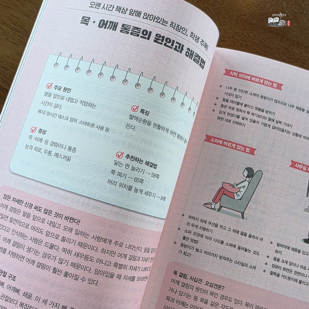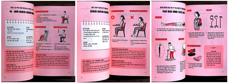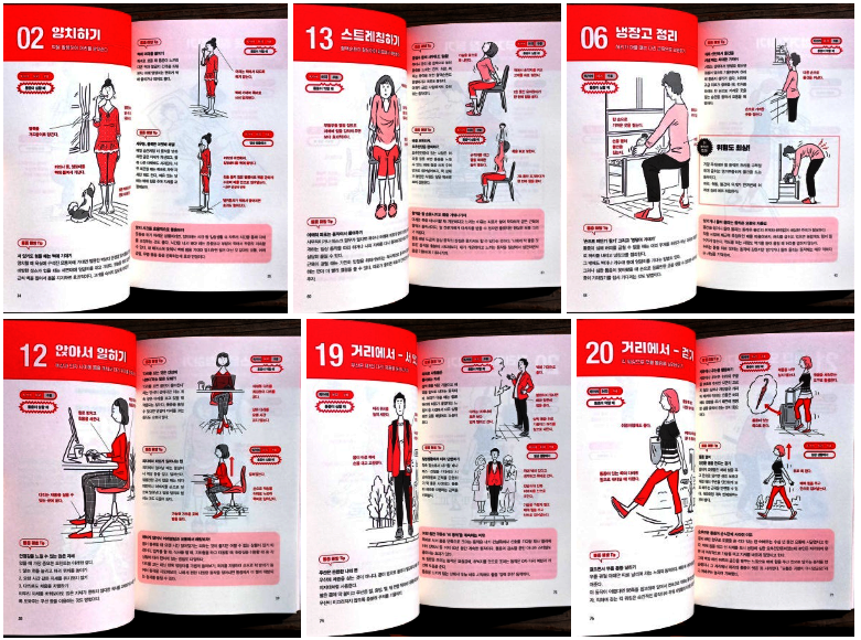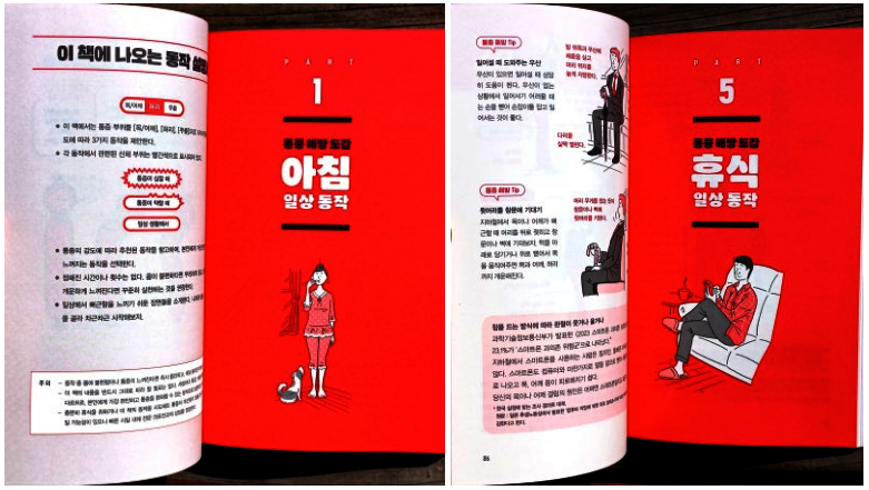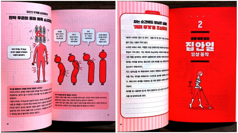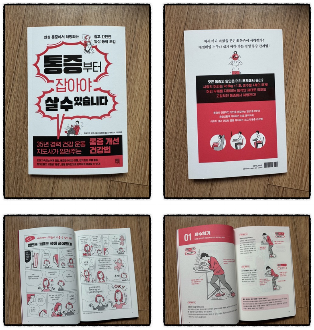 하루종일 결리는 어깨와 어떤 자세를 취해도 뻐근한 허리, 잘못된 자세로 인해 힘들어서 골반이 놀라질 않나, 기지개를 피다가 종아리가 쥐나는 경우 등등 여러 통증을 겪을 때면 어떤 동작을 해도 이미 망가진 몸이 되어 어떤 동작을 취해야 할지 난감하다. 나름 어깨 펴고, 기지개 펴려고 해도 이미 몸 안의 혈액이 막혀 있고, 근육이 여기저기 뭉친 곳이 많은데다 더불어 몸의 균형이 맞지 않아 통증이 쉽게 사라지지 않는다. 이러한 문제를 말끔히 해결해주는 특별한 의료 처방전이 담아진 책을 발견하게 되었다.![]() 『통증부터 잡아야 살 수 있습니다』은 35년간 건강 운동 지도사로 활용하면서 수많은 사람들의 건강을 되찾아준 경험담을 바탕으로 하여 통증 해소법(어깨 결림, 허리통증, 요통, 무릎통증, 고질병 등등)을 알려주는 건강 도서다. 요즘에 매번 어느 부분이 통증이 자주 오는가. 평소에 머리를 제대로 들고 다니는가. 새우등과 거북목으로 생활하고 있는 건 아닌가. 등등 평소에 해왔던 잘못된 습관을 되돌아보면서 이 책을 접근하는 것이 좋을 거 같다. 내 몸에 일어나는 문제는 언제나 가까이 존재하고 있다. 이러한 건강 문제가 제대로 풀리지 않는다고 무작정 병원가서 의사로부터 해결책을 받을 수 있을 거 같아도 소용없을 때가 있다. 좋은 의사를 만날 수 있을 거 같아도, 사람을 잘못 만나면 돈도 잃고, 목숨도 잃을 수 있는 상황이기에 더더욱 내 몸에 대한 관심을 가지고 이 책에서 무엇이 잘못되었는지를 먼저 살펴보는 것이 좋을 거 같다. ![]() 사람의 머리가 얼마나 무거운지 알고 있는가. 이 책에서 전해주기를, 인간의 머리는 약 6kg = 1.5L 생수병 4개의 무게라고 밝혀졌다. 스마트기기를 사용하는 현대인들에게는 늘 머리는 밑으로 숙이는 일이 많다. 계속 숙이면 숙일수록 2배~6배까지 무게가 나간다. 머리를 숙인다고 해서 그걸 안일하게 생각하다간 몸 전체의 치명적인 위험이 닥쳐온다는 것을 이 책을 보면 알 수 있다. 겉보기에는 내 머리가 그리 크지도 않다고 생각할지라도, 실제 내 몸은 그리 감당할 수 있는 상태가 아니라는 걸 이 책을 보면 알 수 있다. 무슨 일이 있어도 머리를 너무 숙이는 일은 자제할 것. 내 몸의 축으로 불리는 척추와 연결된 뇌가 흐트러질 경우 자세는 금방 비틀어지기 마련이므로, 절대로 스마트기기를 쓸 때는 디스크가 생기지 않기 위한 통증을 해방하려는 해결책을 생각해야 할 거 같다. 앞으로 사는 동안까지는 평생 쓸 몸이라면 더더욱 자신의 몸에 대한 통증의 원인을 제대로 각인하고 바꿀 생각으로 이 책을 접해야 할 거 같다. ![]() 몸이라는 건 무조건 팍팍한다고 한다고 해서 좋은 건 절대 아니다. 바른 자세를 안한다고 해서 당장은 내 몸이 아무렇지 않을 거 같아도 실제 상황은 그 잘못된 행동으로 인해 매일같이 똑같이 누적되어 쌓여져서 통증이 발생되어진 것이지, 한번에 통증이 오는 건 없다. 또는 절대 하지 말아야 할 자세를 취한 상태로 물건을 들려고 했다간 크나큰 아픔이 오래도록 지속될 수 있다는 점이다. 천천히 움직여야 할 때, 급한다고 한다고 막 몸을 함부로 쓰다간 큰 코 다치는 일이라는 점을 이 책을 알 수 있다. 이건 스스로가 문제를 크게 만들어낸 거나 다름 없다는 것이다. 이러한 점을 생각하면 더더욱 자신의 문제점을 직면해야 한다고 봐야 한다. 이 책에서는 일상 동작뿐만 아니라 응급 상황 시 치료 동작까지 알려주고 있어서 내가 어떤 동작을 할 때마다 끔뻑하고 통증이 일어나는지 개선점을 각 상황별로 주의할 점을 하나하나 알려주고 있어서 효용성이 좋은 정보를 얻을 수 있다. ![]() 『통증부터 잡아야 살 수 있습니다』라는 도서는 35년 경력 건강 운동 지도사가 알려주는 통증 개선 건강법으로 전해주는 일상 습관 개선서로 만들어진 것이 아주 좋은 실용서로 제작된 것으로 느껴진다. 시중에 판매되고 있는 도서들이 대부분 스트레칭이나 각종 운동기구로 하는 운동법이 담아진 건강정보가 수두룩한데..이 책은 참으로 독특하다. 일본에서 만들어진 도서는 참 재밌게 구성이 잘 되어 있다. 한 장 한 장 넘길 때마다 눈길을 사로잡도록 만화같은 구성으로 건강관련 상식을 전해주고 있어서 통증 완화할 수 있는 방법을 쉽게 따라할 수 있을 거 같아 더더욱 흥미롭게 접근할 수 있다. 근본적으로 내 몸의 통증에 대한 원인을 제대로 알고 생활습관을 고치라는 의도가 확실히 잘 담아져서 오히려 이 책으로 개선하기에 좋은 건강정보라고 생각한다. 하루에 내가 운동을 얼마나 할지 모르겠으나, 대부분 하루가 다르게 바쁜 일상을 보내고 있다보니 운동하는 걸 꺼리는 현대인들이 상당하다. 운동을 하기 싫은 생각이 너무나도 앞선 나머지 통증이 와도 이를 꾹 참을 뿐, 고칠 생각을 하지 않는 것도 있다보니 오히려 이 책이 확실하게 일상생활에서부터 하게 되는 행동을 고치는 게 가장 우선순위로 봐야하는 거라는 걸 알게 된다. ![]() 우리에게 주어진 하루 24시간 동안 대체 운동할 시간이 얼마나 있는가. 요즘은 자기관리한다고 많이들 운동하는 거 같아도, 그렇지 않는 사람들도 수두룩하다. 바삐 생활하는 현대인에게는 당장의