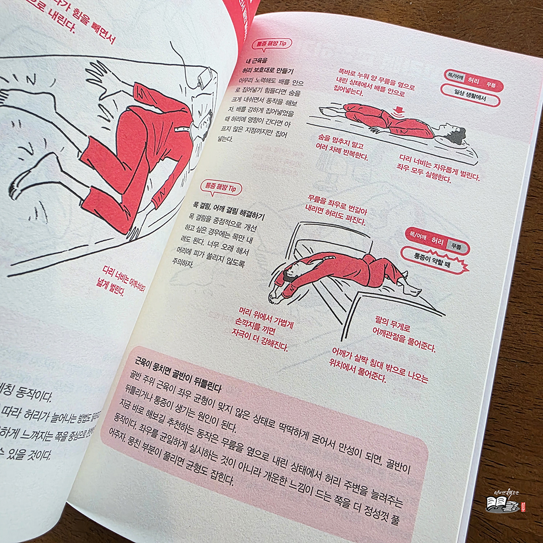 우에모리 미오는 35년 경력의 운동 지도사이자 일본 드로인 운동의 일인자입니다. 10년 동안 다이어트에 실패하면서 무리한 운동으로 인해 허리를 다쳤다고 해요. 의사는 수술까지는 하지 않아도 된다는 진단을 내렸지만 통증은 지속되었고 자세 교정 치료 등 온갖 치료를 받았음에도 좀처럼 통증은 나아지지 않았습니다. 저자는 어느 더운 날, 평소에 늘 차던 허리 보호대를 벗은 후 배를 집어넣고 힘을 주었더니 허리 통증이 줄어드는 경험을 합니다. 그 때 떠올랐던 생각은 '통증부터 잡아야 살 수 있겠구나!' 라는 것이였다고 합니다. 그 후로 생활 속에서 어려움 없이 실시할 수 있는 다이어트와 건강 유지법을 고안했고, 현재는 허리 통증을 극복하여 30년 이상 건강을 잘 유지하고 있다고 하네요. 첫 장을 펼치니 재밌는 만화가 펼쳐집니다. 후드가 달린 옷을 입고 자면 뒤척일 때 목을 자유롭게 움직일 수 없어서 어깨가 걸리는 요인이 된다는 내용이 나옵니다. 무릎 통증, 목 통증, 허리 통증 등 우리가 평소에 경험하는 통증의 사례를 만화로 풀어주니 이해가 쏙쏙 됩니다. 머리 무게를 잘 지탱하면 통증을 해결할 수 있다는 말을 들어보셨나요? 저자는 머리의 무게를 지탱하는 원리는 앉을 때든 걸을 때든 항상 적용된다고 말합니다. 사람에 따라 통증을 느끼는 부위나 정도가 다른 이유는 일상생활 속에서 머리를 지탱하는 방식과 자세가 서로 조금씩 다르기 때문이라고 해요. 몸이 아프거나 뻐근할 때, 턱의 각도를 바꿔보거나 등을 쭉 펴는 등 머리를 지탱하는 방식을 바꿔보는 것으로도 통증이 약화되고 몸이 편해진다는 것을 실감할 수 있다고 소개합니다. 이 책에서는 통증 부위를 목, 어깨, 허리, 무릎으로 나누어 통증 강도(통증이 심할 때, 약할 때, 일상 생활에서) 에 따라 3가지 동작을 제안합니다. 추천한 동작을 참고하여 나에게 가장 적합하다고 느껴지는 동작을 선택하면 됩니다. 이 책이 좋았던 점이라면 일상 안에서 통증에서 벗어나기 위한 자세와 수칙들을 소개하는데 있어서, 그림을 적극적으로 활용했다는 부분이였어요. 말로만 설명하는 것보다 그림을 곁들이면 시각적으로 확인할 수 있으니 실제로 자세를 따라하기에도 훨씬 수월하니까요. 아침 일상 동작, 집안일 일상 동작, 업무 일상 동작, 이동할때의 동작, 휴식 일상 동작, 취침과 기상 일상 동작 등 우리 삶의 전부분에서 취하게 되는 자세를 골고루 소개하고 있다는 부분도 매력적이였습니다. 특정 부위가 불편하다 싶을 때 이 책을 꺼내봐야겠습니다. 건강한 삶의 질은 통증이 없어야 하고 그 통증을 잡는 방법은 자세와 동작이라는 사실이 이 책의 핵심입니다.