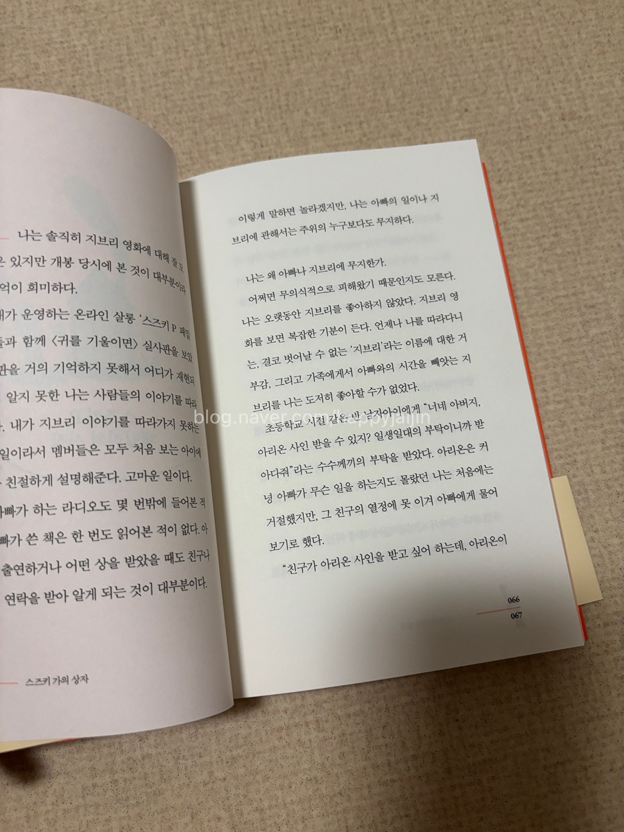 처음 이 책을 읽기 시작했을 때는 지브리 스튜디오에 관한 이야기가 주로 나올 줄 알았는데 이 책은 지브리에 대한 이야기가 아니고 스즈키 가에 대한 이야기였습니다 책을 읽을수록 지브리 영화 보다 더 영화 같은 스즈키 가의 일상에 점점 빠져들게 되었습니다 스즈키 가의 상자 같은 집이 있다면 얼마나 즐거울까요? 내가 없는 사이 내 친구와 나도 모르는 친구가 우리 집에서 우리 엄마가 해준 음식을 먹고 있다니 상상만으로도 정말 정말 재미있었습니다 스즈키 가의 이야기를 읽으며 나도 우리 집을 스즈키 가의 상자 같은 그런 곳으로 만들고 싶다는 생각이 들었습니다 지브리 스튜디오의 프로듀서로 유명한 아빠 주변 사람들이 어렸을 때부터 나를 대할 때 나를 통해 나를 보는 것이 아니라 아빠나 지브리만을 본다고 생각하면 어쩌면 나도 지브리를 별로 좋아하지 않았을 지도 모르겠ㅅ,ㅂㄴ;디 가끔은 원활하지 못했을 부녀와의 관계도 나이가 들면서 점점 부모를 이해하게 되고 스즈키 마미코는 스즈키 P 패밀리 온라인 살롱을 통해 지브리에 대해 그리고 아빠에 대해 더 알아갈 수 있었습니다 스즈키 마미코가 시작한 온라인 살롱이 뭔지 몰라 온라인 살롱에 대해 인터넷에 검색을 해봤습니다 온라인 살롱은 몇 년 전부터 일본에서 유행하는 회원제 방식의 커뮤니티 비즈니스라고 합니다