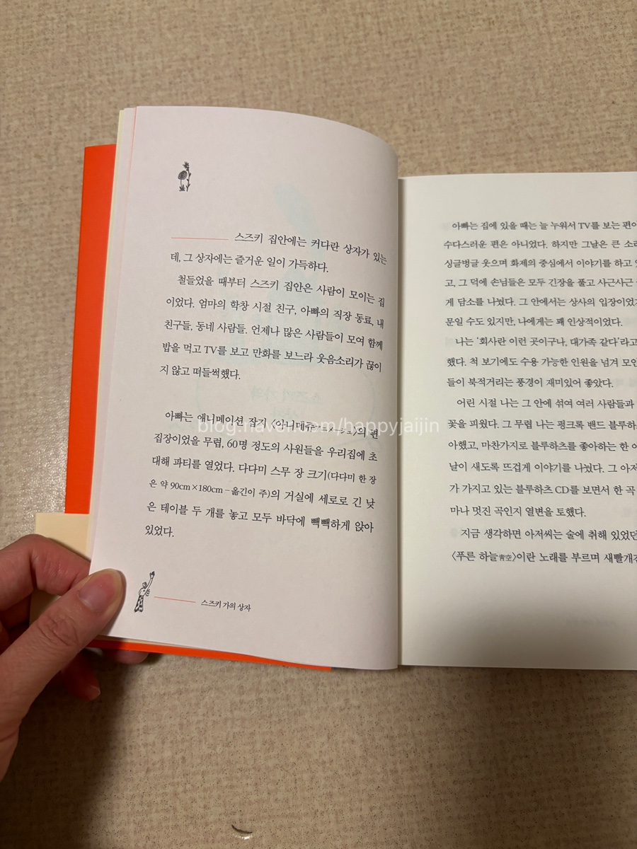 스튜디오 지브리 프로듀서 가족의 만화 영화 같은 일상 스즈키 마미코의 스즈키 가의 상자 나는 지브리 영화를 정말 좋아했습니다 처음으로 지브리 영화를 접한 건 센과 치히로의 행방불명이었는데 그 뒤로 지브리 영화가 좋아져서 새로 나온 영화들은 꼭 챙겨 보고 그전에 나왔던 영화들까지 찾아보곤 했습니다 스튜디오 지브리의 프로듀서인 스즈키 도시오의 딸 스즈키 마미코가 스즈키 가의 이야기를 쓴 책입니다 스즈키 마미코는 내가 제일 좋아하는 지브리 영화 센과 치히로의 행방불명의 삽입곡 중 또 다시의 작사를 맡기도 하여서 그녀의 이야기가 더 궁금하였습니다 타인과 가족의 경계가 모호하여 뭐든지 허용되는 재미있는 집 스즈키 가는 누구든지 자유롭게 드나들 수 있는 그런 공간이었습니다 오늘은 누가 있을까, 무슨 일이 생길까, 열어볼 때마다 와 하고 감격할 수 있는 상자 그런 상자 같은 스즈키 가의 집입니다 스즈키 가의 상자 속을 들여다봐요