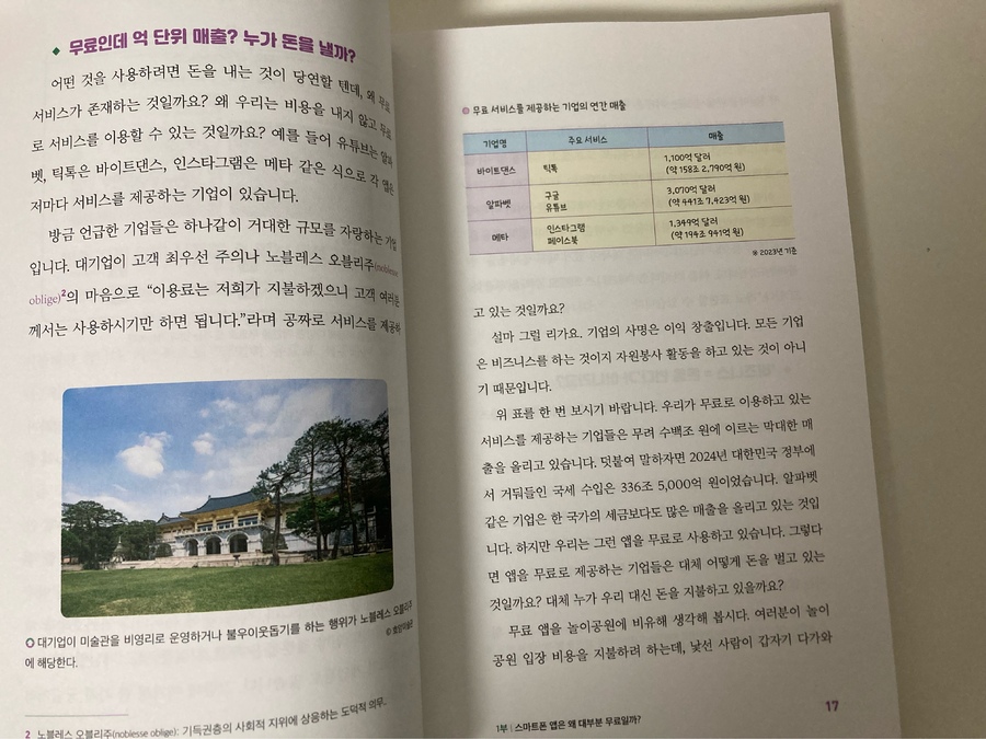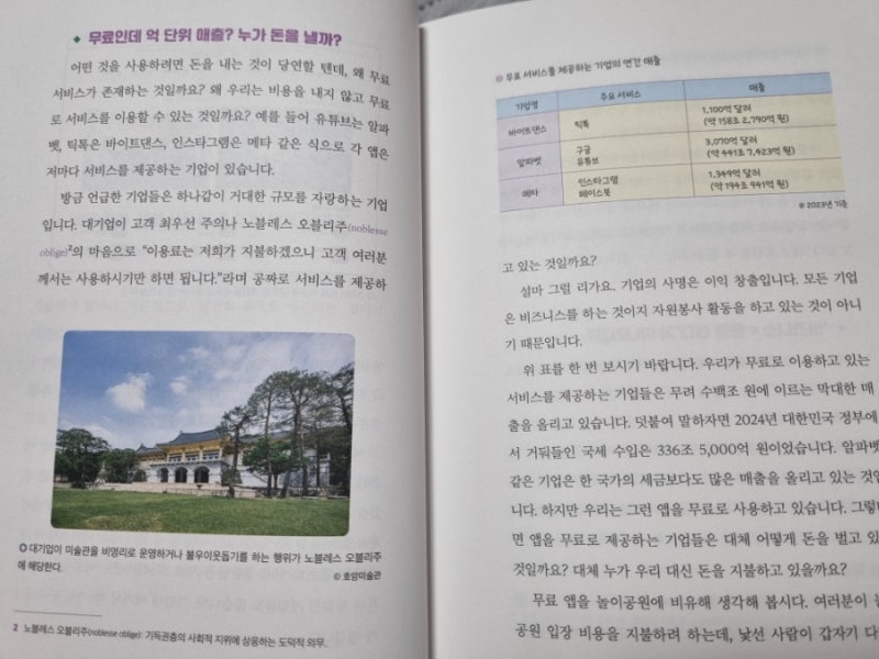 출판사로부터 도서를 제공받아 작성한 주관적인 후기입니다. 아이들과 함께 대화를 나누다 보면 가끔은 어른도 쉽게 답하지 못하는 질문을 받을 때가 있다. “왜 유튜브는 공짜인데 돈을 벌어?”, “앱은 다 공짜로 쓰는데 그 회사들은 어떻게 그렇게 돈을 많이 벌까?” 이런 질문 앞에서 막막함을 느낀 적 있다면, 『10대를 위한 공짜 경제학』이 꽤 든든한 안내자가 되어줄지도 모르겠어요. 디지털 시대에 익숙한 고등학생들을 위한 경제와 마케팅 입문서라고 봐도 될 것 같아요. ‘공짜’라는 키워드를 통해 자본주의 사회의 구조를 살짝 들춰보며, 우리가 평소 무심코 지나치는 현상들—예를 들면 스마트폰 무료 앱, 리셀 문화, 스타벅스 시즌 메뉴 가격 설정 등—속에 숨은 경제 논리를 하나하나 쉽게 풀어내고 있습니다.