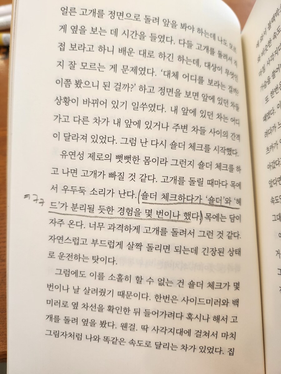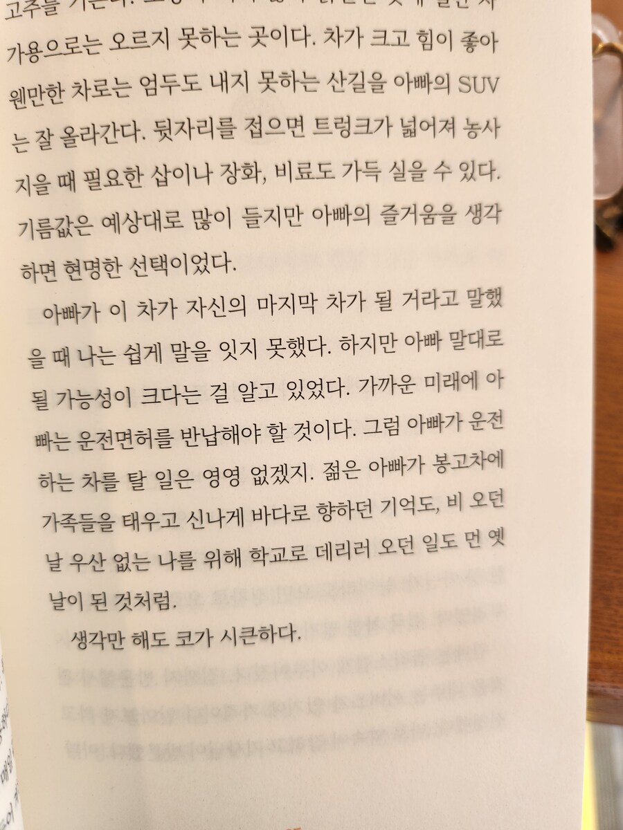 서를 제공받고 작성한 리뷰입니다. 카페에서 읽다가 몇 번씩 웃음이 터져 나왔어요. 엉뚱하지만 한 번쯤 해봤을 것 같은 생각들을 글자로 읽으니 공감이 되었던 탓일까요? 그렇게 웃으며 책장을 넘기다가는 또 눈시울이 붉어지기도 하고 운전을 망설이며 주저했던 이유도, 운전하면 이런 게 진짜 좋을 텐데 했던 생생한 장면들도 무척이나 공감이 되는 책이었습니다. 웃음 포인트를 몇 가지만 꼽아보자면 첫 고속도로 장거리 운전으로 친정에 가기 전에 남편에게 유서를 써놓고 공인인증서 비밀번호까지 알려줬다는 부분, 숄더체크 하느라 숄더와 해드가 분리될 뻔했다는 이야기 ㅎㅎㅎ 입에 머금고 있던 게 아메리카노라 다행이었어요. 다른 거였으면 뿜다가 난감했을 뻔했네요 ㅎㅎ 어쩌면 아빠의 마지막 차가 될지도 모른다는 이야기, 그 차로 선산에 이것저것 심으며 지내신다는 아버지의 이야기에 얼마 전 차를 바꾸고 싶다고 넌지시 말씀하시던 아빠 생각도 났고요 빨간 티코를 타고 바다 보러 가지 않을래? 걸크러쉬 멋짐 뿜뿜 뽐내시던 작가님과 어머니와의 바다여행, 그리고 면허증 반납 이야기까지.... 저처럼 또 저자처럼 (그리고 이 책의 에디터처럼) 운전을 망설이는 분들이 읽는다면 격하게 공감하며 조용히 설득당할 책입니다. 운전에 관한 이야기지만 인생을 읽어주는 이야기 같기도 했어요. 해야지 해야지 망설이고 있는 예비 운전자분들 모두에게 추천하고 싶은 책이네요. "오늘도 무사히!" 처음에는 길 한 번 잘못 들면 세상이 무너지는 줄 알았다. 한지만 같은 다 연결되어 있고, 나에겐 내비게이션이 있다. 도착지에서 멀어져도 최선을 다해 다시 빠른 길을 알려주고 목적지를 코앞에 두고 다른 길로 빠져 도시화 내지 않는.... p.27 #리뷰어클럽리뷰 |