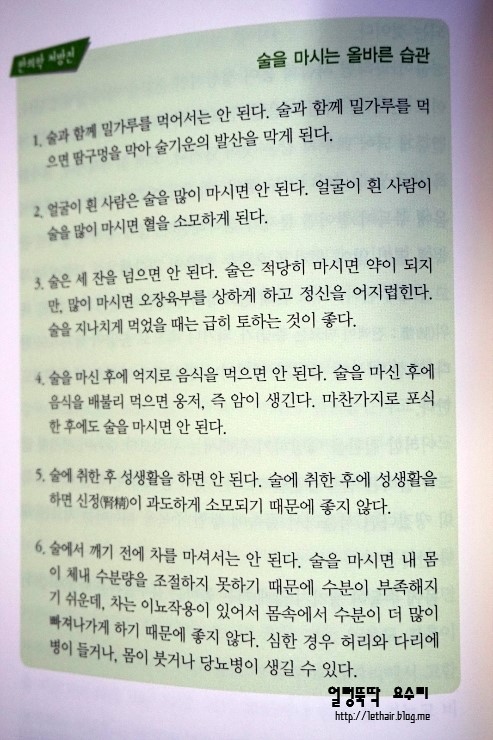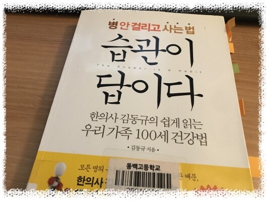 학교 도서관에서 재미있을것 같은 생각에 빌렸네요.. 방학이 되어버려서..이제 이번주 개학이니까..바로 반납하려구요^^ 한의학으로 바라본 건강지침서 좋은(?) 생활습관으로 건강한 삶을 살아라는 작가의 메세지!! 아플때..일단은 진통을 해결하기위해서 약을 먹곤합니다. 물론, 약을 먹기전에 습관을 점검하는 것이 중요하기는 하겠지만..