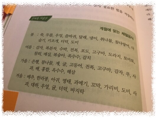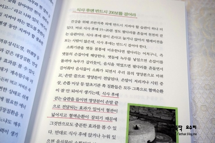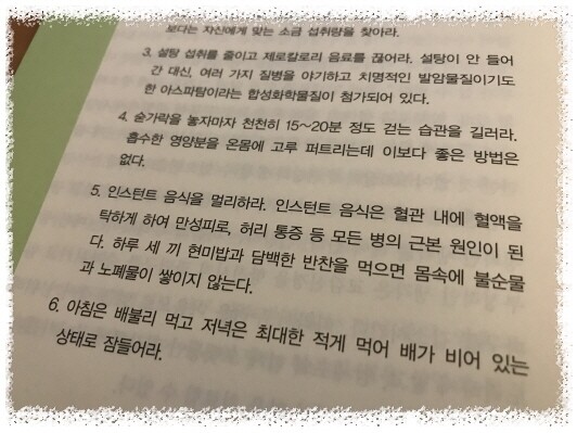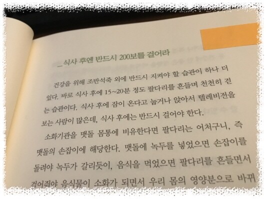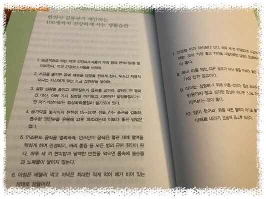 그래서 열이 심하지 않으면 그냥 버티곤 했던 기억도 나네요.. 수술은 필요할때만..음.. 친정엄마의 수술을 받으시고도 회복되는데 힘들어하시는걸 보면.. 회복력이 우선이 되야한다는 생각이 듭니다.. 늘 아침은 먹으려고 하는데.. 결혼하기전에는 엄마께서 해주시는 밥으로 아침을 먹었는데.. 아이낳고 기르면서는 그냥 가볍게 떼우곤 하네요^^; 그래도 거르지는 않으려고 한다는!! 식사후엔 200보를.. 학교에서는 점심먹고 주변을 산책하곤 하는데.. 2학기에도 꼭 해야겠네요^^ 계절에 맞는 제철음식!! 챙겨먹어야겠네요~~ 물을 무조건 많이 먹는것이 아니라 필요한 양을 적절히 먹어야한다는 메세지도 안내하고 있네요.. 100세까지 건강하는 사는 방법에 대한 작가의 메세지!! 특히, 와닿는 메세지는