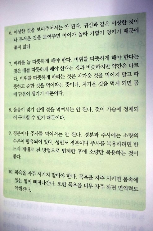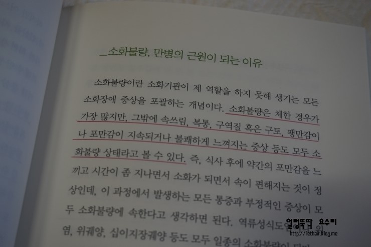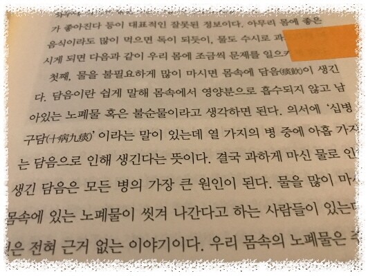 *소금을 줄이면 몸은 당분을 원하게 된다 *아침을 먹으면 만성 피로가 사라진다 식후에 항상 200~300보씩 걷는 습관을 들이는 것이 손끝과 발끝까지 에너지를 공급하는 가장 좋은 방법 (80~81) *기가 허한 사람에게 인삼은 최고의 약이 될 수 있지만, 그렇지 않은 사람이 인삼을 장기 복용하면 처음에는 기운이 나는 것처럼 느낄 수 있지만 결국에는 가슴이 답답하고 기침이 나거나 머리가 아프는 등의 부작용이 생길 수 있다. (p82~83) *소화불량을 근본적으로 개선하는 습관 숟가락을 놓자마자 천천히 걷는 것이 위장 쪽으로 혈액 순환을 시켜 소화를 잘 되게 만드는 가장 좋은 방법이다 (p88~89) *비만을 없애 주는 생활 습관 합성 물질이 포함된 약과 가공 식품을 끊어라 현미밥 위주의 단백한 식단을 배불리 먹어라 운동은 식사 후에 20분 걷는 것으로 충분하다 (p94~95) *얼마나 자느냐가 아니라 어느 시기에 자느냐가 중요하다 봄에는 늦게 자고 일찍 일어나며, 여름과 가을에는 밤늦게 자고 일찍 일어나며, 겨울에는 일찍 자고 늦게 일어나는 것이 사람에게 이롭다 해가 뜰 때 일어나고 해가지면 자라는 뜻이다 (p99~100) 책이 온통 빨간 줄 천지다. 배울게 한도 끝도 없이 쏟아지는 병안 걸리고 사는 법 습관이 답이다. 아마도 이 책은 내가 이사를 하던 외국으로 미인을 가던 항상 끼고 가게 될 그런 책이 될 듯하다. 알아 두면 좋은 상식들 함께 해요~