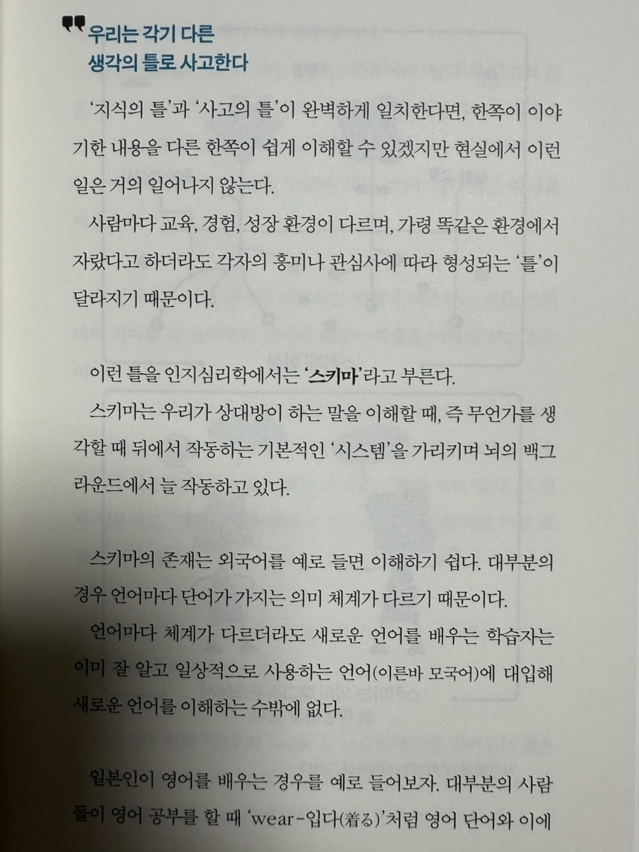 *본 포스팅은 출판사로부터 도서를 제공받아 주관적으로 작성한 리뷰입니다. 우리는 매일 수많은 대화를 나눈다. 직장에서 동료와 업무를 논의하고, 가족과 일상을 공유하며, 친구들과 마음을 터놓는다. 그런데 왜 이렇게 자주 대화하면서도 서로를 이해하지 못하는 일이 반복될까? 왜 분명히 말했다고 생각하는데 상대방은 전혀 다른 방식으로 받아들이는 걸까? 많은 사람들이 소통의 문제를 '표현 방식'의 문제로 여긴다. 더 명확하게 말하면, 더 친절하게 설명하면, 더 많은 시간을 들여 반복하면 상대방이 이해할 것이라고 믿는다. 하지만 인지과학의 관점에서 보면, 이런 접근 방식은 근본적인 해결책이 될 수 없다. 진짜 문제는 우리가 어떻게 상대방의 마음을 읽는가에 있기 때문이다. 이번에 인지과학적 접근을 통해 많은 조언을 해 주는 신간을 읽을 기회가 있었다. 이마이 무쓰미의 <그렇게 말하면 못 알아듣습니다>였다. 책의 제목이 직설적이다. ^.^ 인지과학에서 '스키마'라고 부르는 개념이 있다. 이는 우리가 세상을 이해하고 해석하는 기본적인 틀을 말한다. 예를 들어, 누군가 '개'라는 단어를 말했을 때, 어떤 사람은 자신이 키우는 반려견을, 다른 사람은 무시무시한 맹견을, 또 다른 사람은 만화 속 귀여운 캐릭터를 떠올릴 수 있다. 같은 단어, 하지만 완전히 다른 연상과 감정이 동반되는 것이다. 이런 차이가 생기는 이유는 각자의 경험, 교육, 문화적 배경이 다르기 때문이다. 우리는 자신의 스키마가 마치 보편적인 것처럼 느끼지만, 실제로는 매우 개인적이고 주관적인 것이다. 문제는 우리가 이런 차이를 인식하지 못한 채 대화를 나눈다는 점이다. 상대방과 나의 스키마가 다르다는 것을 이해하는 것이 효과적인 소통의 첫 번째 단계다. 인간의 기억은 우리가 생각하는 것만큼 정확하지 않다. 우리는 경험한 것을 있는 그대로 저장하고 꺼내는 녹음기와 같은 존재가 아니다. 기억은 매번 재구성되며, 그 과정에서 왜곡이 일어난다. 더욱 문제가 되는 것은 우리가 이런 왜곡을 전혀 의식하지 못한다는 점이다. 회의에서 상사가 한 말을 각자 다르게 기억하는 경우, 이는 '잘못 들었다'는 문제가 아니라, 각자의 관심사, 걱정거리, 기대 등이 기억의 형성과 재구성 과정에 영향을 미친 결과다. 같은 말을 들었지만, 서로 다른 맥락에서 해석하고 기억하게 되는 것이다. 이런 현상은 특히 감정이 개입된 상황에서 더욱 심해진다. 스트레스를 받거나 흥분한 상태에서는 선택적 주의가 더욱 강해져서, 자신에게 중요하다고 여기는 부분만 기억하고 나머지는 놓치기 쉽다. 따라서 중요한 대화를 할 때는 상대방의 감정 상태를 고려하고, 핵심 내용을 여러 방식으로 확인하는 것이 필요하다. 인간의 뇌는 효율성을 위해 다양한 '지름길'을 사용한다. 이를 휴리스틱이라고 하는데, 대부분의 경우 유용하지만 때로는 체계적인 오류를 만들어낸다. 이런 오류를 인지 편향이라고 한다. 확증 편향은 그 중에서도 소통에 특히 큰 영향을 미치는 편향이다. 우리는 자신의 기존 믿음이나 의견을 뒷받침하는 정보는 쉽게 받아들이지만, 반대되는 정보는 무시하거나 왜곡해서 해석하는 경향이 있다. 이는 대화 중에도 마찬가지로 작용한다. 상대방의 말 중에서 자신의 생각과 일치하는 부분은 명확하게 들리지만, 다른 부분은 흘려듣거나 자신에게 유리한 방향으로 해석하게 된다. 또 다른 중요한 편향은 '저주받은 지식의 편향'이다. 어떤 지식을 알고 있는 사람은 그 지식을 모르는 상태가 어떤 것인지 상상하기 어려워한다. 전문가가 초보자에게 설명할 때 자주 발생하는 문제가 바로 이것이다. 자신에게는 너무나 당연하고 기본적인 것이 상대방에게는 전혀 새로운 개념일 수 있다는 점을 놓치게 되는 것이다. 우리가 많이 접하고 있는 메타인지는 '인지에 대한 인지', 즉 자신이 무엇을 알고 있고 무엇을 모르는지, 자신의 사고 과정이 어떻게 작동하는지를 아는 능력이다. 소통에서 메타인지가 중요한 이유는 자신의 한계와 편향을 인식할 수 있게 해주기 때문이다. 메타인지 능력이 높은 사람은 자신이 잘못 이해했을 가능성을 열어두고 대화한다. "내가 제대로 이해한 게 맞나?"라고 확인하고, "내가 놓친 부분이 있을까?"라고 스스로에게 묻는다. 또한 자신의 설명이 상대방에게 제대로 전달되었는지 확인하는 것을 게을리하지 않는다. 반면 메타인지 능력이 부족한 사람은 자신의 이해나 설명에 대해 과신하는 경향이 있다. "내가 이렇게 쉽게 설명했는데 왜 이해하지 못하지?"라고 생각하거나, "내 말이 틀릴 리 없어"라고 확신한다. 이런 태도는 소통의 장벽을 높인다. 또한 감정은 소통에서 매우 중요한 역할을 한다. 긍정적인 감정은 상대방에 대한 호감과 신뢰를 높여 소통을 원활하게 만든다. 하지만 부정적인 감정은 인지 능력을 저하시키고 편향을 강화시켜 소통을 어렵게 만든다. 스트레스나 분노 상태에서는 뇌의 편도체가 활성화되면서 전전두엽의 기능이 억제된다. 전전두엽은 논리적 사고, 계획, 판단 등을 담당하는 부위이므로, 이 기능이 저하되면 상대방의 말을 객관적으로 듣고 분석하는 능력이 떨어진다. 대