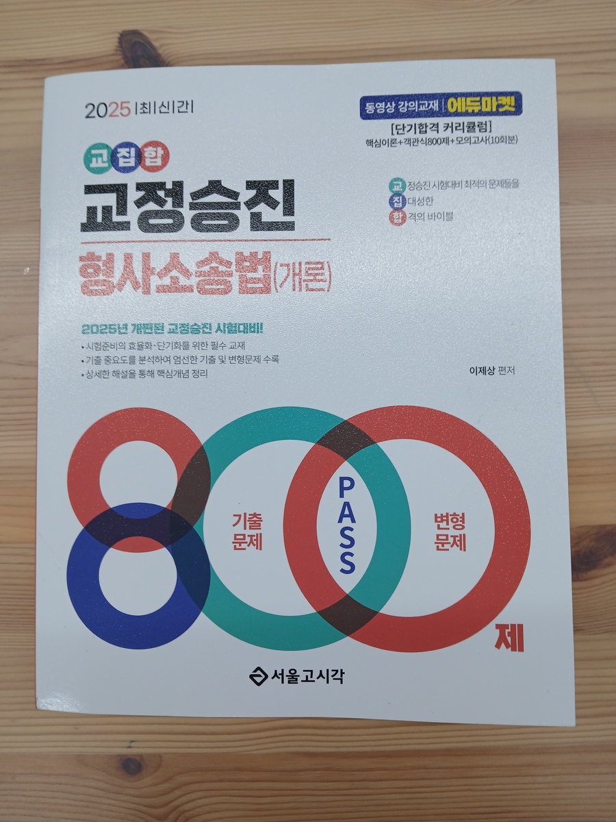 이번에 교정 승진시험이 부활되어 발등에 불이 떨어진 상황인데 어떻게 공부할지 막막하던차에 교정승진 형사소송법 800제를 구입해서 형소법 공부를 하고 있습니다. 800제 교재를 보니 각종 시험에서 기출된 기출문제와 기출 변형된 문제를 수록하고 있어 시험경향도 파악하고 예전의 기억을 되살려 볼까도 생각중~~ 공부할 시간도 부족하고 무엇보다 공무에 시달려 공부하기도 귀찮고 하지만 승진을 위해 800제 문제만 열심히 공부해서 승진 해볼까 합니다 ㅎㅎ