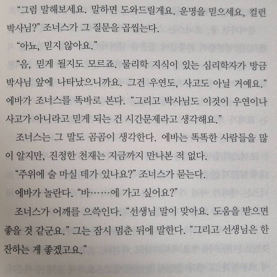 #도서협찬 노벨상을 받은 주인공 조너스는 시상식날 사랑하는 아내 어맨다와 배 속의 아이를 교통사고로 잃게 된다. 어맨다를 그리워하며 수많은 평행우주들 속에서 어맨다가 살아있는 우주를 찾으려고 자신이 증명한 수학 공식을 이용해서 여행을 떠나려고 하는데,, 양자역학, 강입자 충돌기, 양자에너지 등등 과학용어들은 생소했지만 사랑하는 여자를 찾기 위해 온 우주를 찾아다닌다는 설정은 뭔가 로맨틱했음…!ㅋㅋ 현실에선 절대 일어날 수 없는 이야기라서 더 좋았다고 해야 할까?! ㅋㅋ 평행우주들 속에서 어맨다를 찾기 위해 고군분투하고 목숨을 잃을 뻔하면서도 끝까지 포기하지 않고 어맨다를 만나려고 하는 조너스의 모습을 응원하며 읽었다. 중간에 빌런도 나오기 때문에 조너스가 더 영웅처럼 느껴지기도 했고..! 넷플에서 영화로 만들어도 재밌을 것 같음..!! 🌸P.92 "자기를 찾아서 온 우주를 뒤지겠다는 남자가 있으면 누구나 기쁠 거예요. 그분에겐 무한한 수의 세상을 뒤지겠다는 남자가 있잖아요." 🌸P.220 조너스는 언제나 그렇듯이 어맨다의 꿈을 꾼다. 매일 밤 어맨다는 똑같은 말을, 파도처럼 규칙적으로 전한다. '당신은 날 찾아낼 거야. 아무것도 당신을 막지 못해. 우주조차도. 사람들이 뭐라고 하는지, 당신 자신이 뭐라고 하는지 알아. 불가능하다고 하지. 하지만 난 알아. 확실히 알아. 불가능하지 않다는 것을.' 어맨다의 온몸이 확신에 가득 차있다. ‘당신이 하니까 불가능하지 않아. 당신은 다중우주를 믿지만, 난 당신을 믿어.' #다른우주에서우리만나더라도 #마크구겐하임 #북스타그램 #책스타그램 #책추천 #책리뷰 #책 #도서추천 #도서리뷰 #장편소설 #bookstagram |
