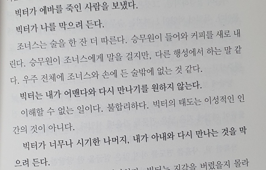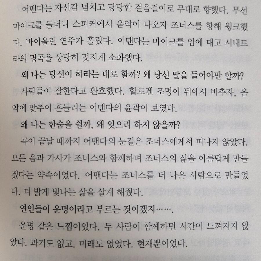 * 해당 도서는 서평 작성을 위해 출판사로부터 무상으로 제공 받았습니다. 주인공 '조너스'는 노벨상을 수상한 물리학자이지만, 사랑하는 사람을 찾기 위해 다중우주를 연구한다. 그는 자신을 양자화해 다른 우주로 가고자 했다. 과연 주인공 조너스가 사랑하는 '어맨다'를 만나 목표를 이룰 수 있을지 궁금해지는 소설이었다. 따뜻하다. 배 속에 경이가 차오른다. 한희가. 온갖 질문과 의문이 마음속에 떠오른다. 어맨다가 여기 있을까? 어떤 현실에 온 것일까? 어맨다가 여기 있을까? 이 우주가 맞을까? 어맨다가 여기 있을까? 조너스가 얼마나 간절한지 알 수 있는 대목이었다. 그리고 특정 문장과 단어가 볼드체되어 있었는데, 이런 글씨체가 뭔가 몰입들 더하는 느낌이었다. 공감되는 부분들도 많았다. 우리 삶 속에서의 간절한 순간들과 기쁨의 순간들을 회상해 보게 된다. 내 이야기라고 생각하면서 읽어보게 된다. "음, 믿게 될지도 모르죠. 물리학 지식이 있는 심리학자가 방금 박사님 앞에 나타났으니까요. 그건 우연도, 사고도 아닐 거예요." '그건 우연도 사고도 아닐 거예요.' 라는 문장이 이 소설의 핵심 문장이라고 생각한다. 우연과 사고. 조너스가 어맨다를 만나러 가는데는 얼마나 많은 우연이 필요하고 사고가 필요했을까... SF와 사랑 이야기가 합쳐지니 흥미진진하고 몰입력 있는 소설로 독자들을 빠지게 하는 것 같다. SF 이야기는 정말 무궁무진하고 왜인지 따뜻하다. 결코 내가 참을 수 없는 이야기의 책이었다. #다른우주에서우리만나더라도 #마크구겐하임 #문학수첩