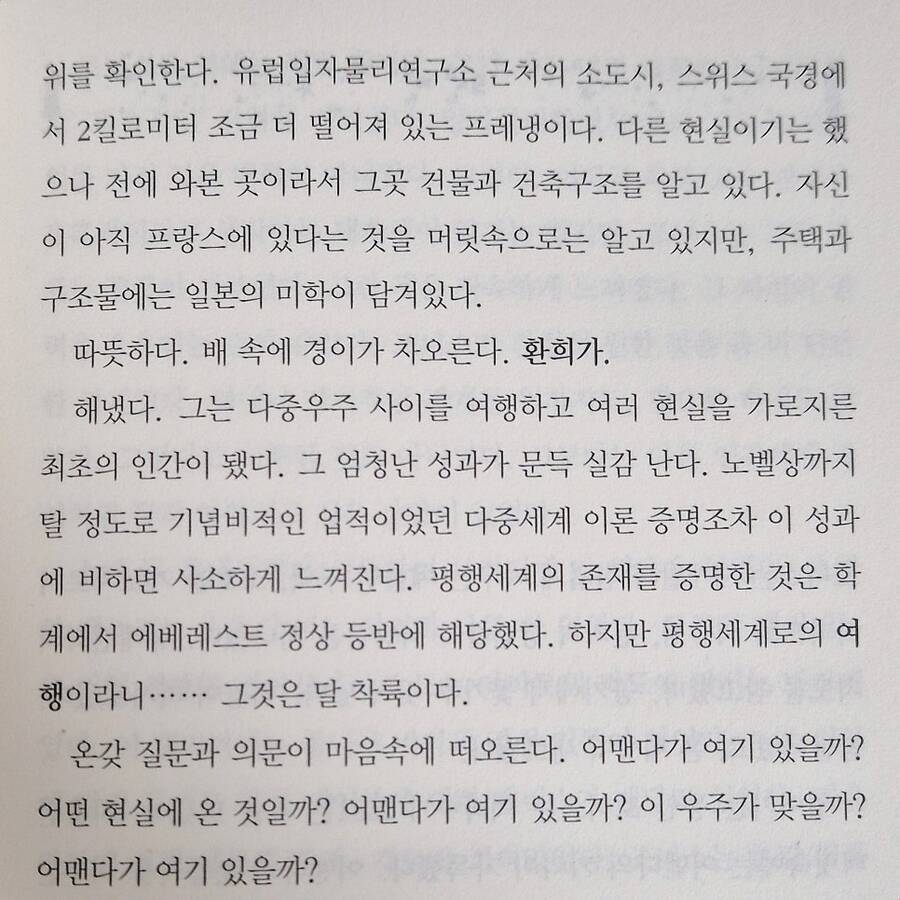 * 네이버 책과 콩나무 카페 서평단 자격으로 작성한 주관적인 리뷰입니다. 의도치 않게 멀티버스 관련 작품을 연달아 읽게 되었다. 멀티버스라는 개념이 아직은 온전히 상상 속의 개념인지라 작가마다 그 모습이 다른데, 이번 작품에서는 히어로 영화에서 흔히 보던 형식의 멀티버스가 등장한다. 즉 우리가 지금 사는 세상과 비슷하지만, 조금씩 다른 우주들이 존재하고 그 우주들을 오갈 수 있는 세계를 그려내고 있는 것이다. 작품은 물리학자인 '조너스'의 시각에서 전개된다. 그는 하나의 가설로만 존재하던 멀티버스의 존재를 수학적으로 증명하는데 성공하면서 노벨상의 영예를 얻는다. 동시에 임신이 불가능할 줄 알았던 아내가 임신에 성공했다는 반가운 소식도 듣는다. 그렇게 직업적인 성공과 개인적인 행복 모두를 손에 넣은 듯싶었지만, 수상 직후 교통사고로 아내가 세상을 뜨게 된다. 사랑하는 아내가 없으면 자신의 삶도 아무런 의미가 없었던 그는 자신이 밝혀낸 멀티버스 이론을 실제로 적용하기로 마음먹고 무려 용병까지 고용해서 CERN 입자가속기에 침입, 아내가 살아 있는 우주를 찾아 떠나게 된다는 이야기다.