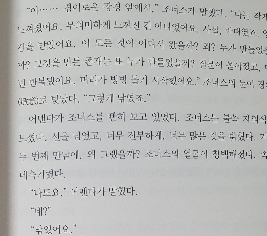이런 여러 설정들 덕분에 피상적인 줄거리만 보면 멀티버스를 종횡무진 헤매며 사랑을 찾는 로맨틱한 이야기 같지만, 생각보다 스펙터클하고 긴장감 있는 이야기가 펼쳐진다. 당연히 우주가 달라지는 것이기에 새로운 세상에서는 자신의 신분도, 돈도, 아는 사람도, 연락 방식도 모두 없는 것과 같기에 맨손으로 부딪혀야 하며, 끝까지 조너스를 쫓는 열등감 덩어리 빌런도 있어서 끝까지 페이지가 술술 넘어갔다. 우리의 삶과는 전혀 다른 세계를 다루면서도 지금 우리의 삶과 그리 다르지 않은 사람들의 이야기를 녹여냈다는 점도 인상적이었다. 누구나 상실을 겪고 그리움에 힘든 시기가 있다. 그랬던 경험이 있다면, 그러한 상실을 되돌릴 수 있는 우주가 있다면 기꺼이 찾아 떠나고 싶은 심정을 이해할 수 있을 것이다.