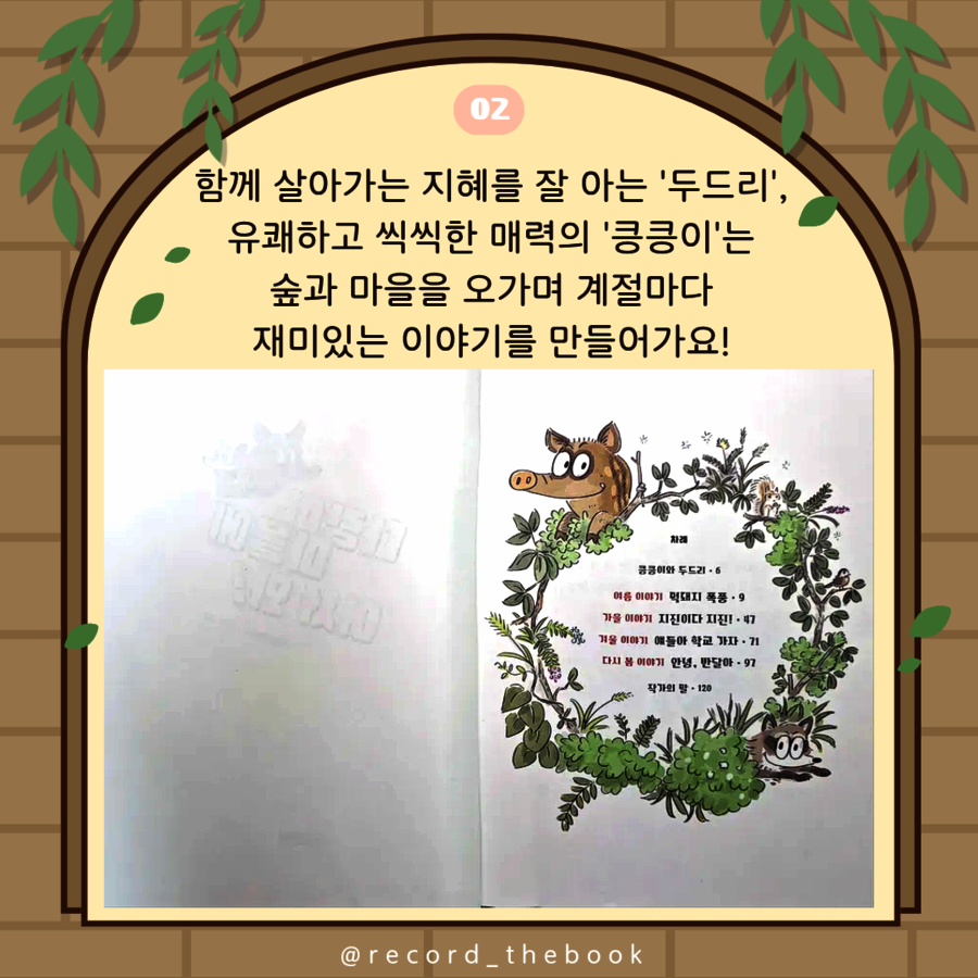 너구리 두드리와 맷돼지 킁킁이의 여름, 가을, 겨울, 다시 봄의 시간 동안에 펼쳐지는 좌충우돌 숲속 생활 이야기다.