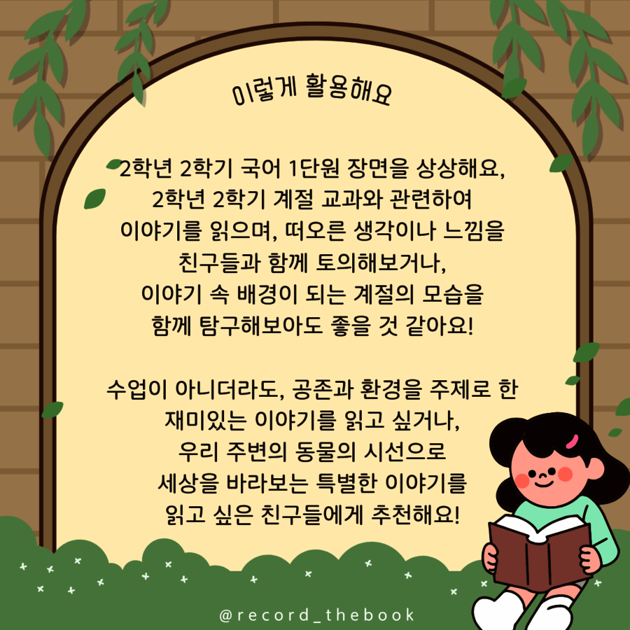 수업이 아니더라도, 공존과 환경을 주제로 한 재미있는 이야기를 읽고 싶거나, 우리 주변의 동물의 시선으로 세상을 바라보는 특별한 이야기를 읽고 싶은 친구들에게 추천해요! |