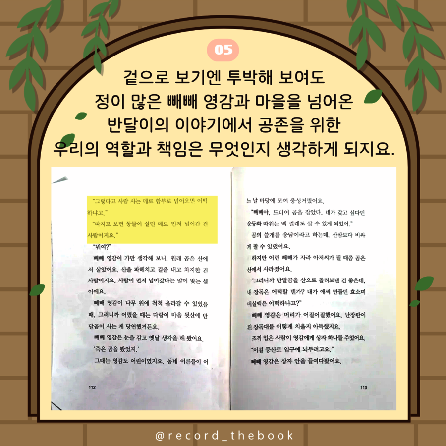 곰, 고라니, 토끼, 다람쥐 등 다양한 동물들과 사람들은 과연 어떻게 함께 살아가면 좋을까? 밝고 명랑한 이야기들로 안미란 작가님은 질문을 던지신다. 아이들과 이 책 함께 읽고 가볍지만 진지하게 답해 보면 어떨까?