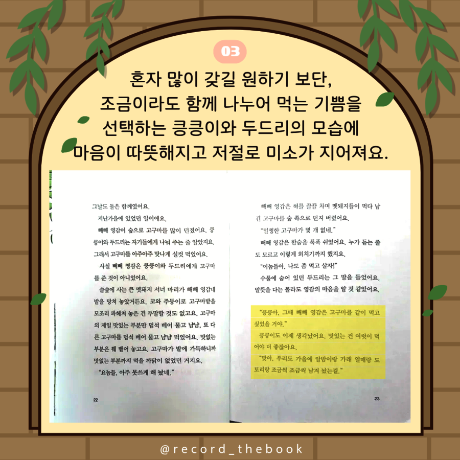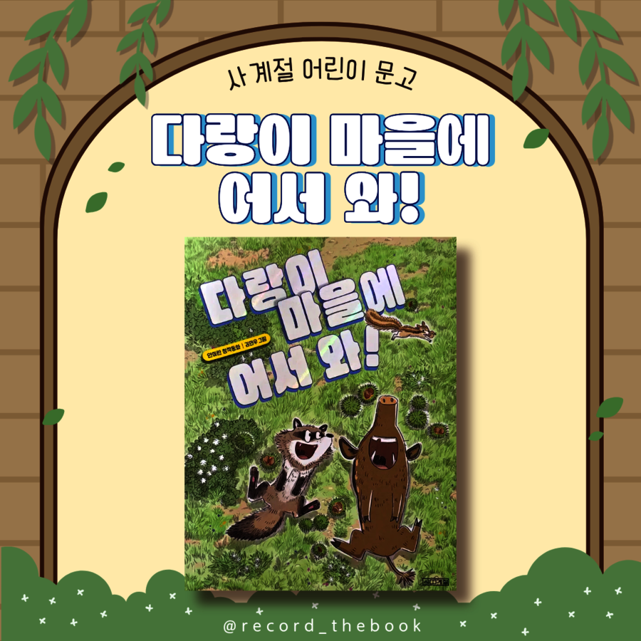 '다랑이 마을에 어서와!'가 새로 나왔어요. 혼자 많이 갖길 원하기보단, 조금이라도 함께 나누어 먹는 기쁨을 선택하는 킁킁이와 두드리의 모습에 마음이 따뜻해지고 저절로 미소가 지어져요. 많이 갖기 위해 욕심을 부리기보다 함께 나눠 오래 행복하게 지내길 원하는 킁킁이와 두드리의 이야기를 읽다 보면 생태계에 진정으로 위협이 되는 존재가 누구인지 돌아보게 되요. 겉으로 보기엔 투박해 보여도 정이 많은 빼빼 영감과 마을을 넘어온 반달이의 이야기에서 공존을 위한 우리의 역할과 책임은 무엇인지 생각하게 되지요.