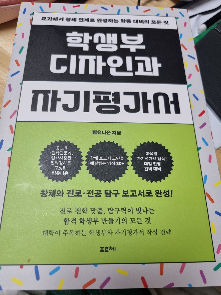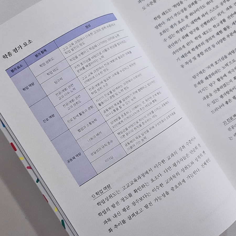 자기평가서 어떻게 써야 할지 진짜 감이 안 잡혔는데 이 책 한 권 사서 보니까 꽤 괜찮음. 책이 좀 두꺼워서 솔직히 다 읽진 않았고, 필요한 부분만 골라서 읽는 중임. 예시도 많고 설명도 잘 돼 있어서 참고하기 좋음. 학종 준비 중이거나 자기평가서 써야 하는 상황이면 이거 하나쯤 사두는 거 추천함. 처음 쓸 때 방향 잡는 데 도움 많이 됨. 학종 생각 중이면 구매 ㄱㄱㄱ |