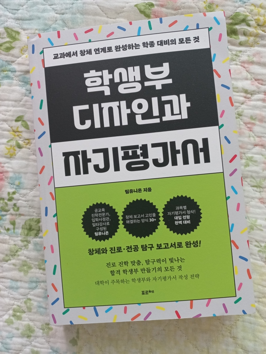 "교과에서 창체 연계로 완성되는 학종 대비의 모든 것" 학생부 디자인과 자기평가서 책을 보자마자 이건 꼭 소장해야한다고 생각했던 책입니다. 고교학점제가 전면시행되는 09년생 아들을 둔 엄마입니다. 첫 학기가 끝난 지금 정말 멘붕 상태에요.ㅠㅠ 특히 아들 학교는 자기평가서를 정말 직접 한글자부터 다 써가지고 오라는데.. 처음에 정말 막막했습니다. 정말 하나도 모르겠더라구요. 그때 만나게 된 책이 이 책입니다. 받지 않는 과목이 있더라구요. 그것 또한 신기하기도 했구여. 자기평가서 형식을 보자마자 정말 어떻게 해야하는지 막막했는데요. 이 책을 통해서 정말 큰 도움 받았습니다. 주변에 자기평가서와 생기부때문에 어려움을 겪는 친구가 있다면 이 책을 꼭 추천하고 싶을 정도에요. 정말 찐 도움 받은 책, 정말 강추합니다. 협찬받은 도서이지만, 정말 내돈내산해서라도 정말 추천하고픈 도서입니다. |
