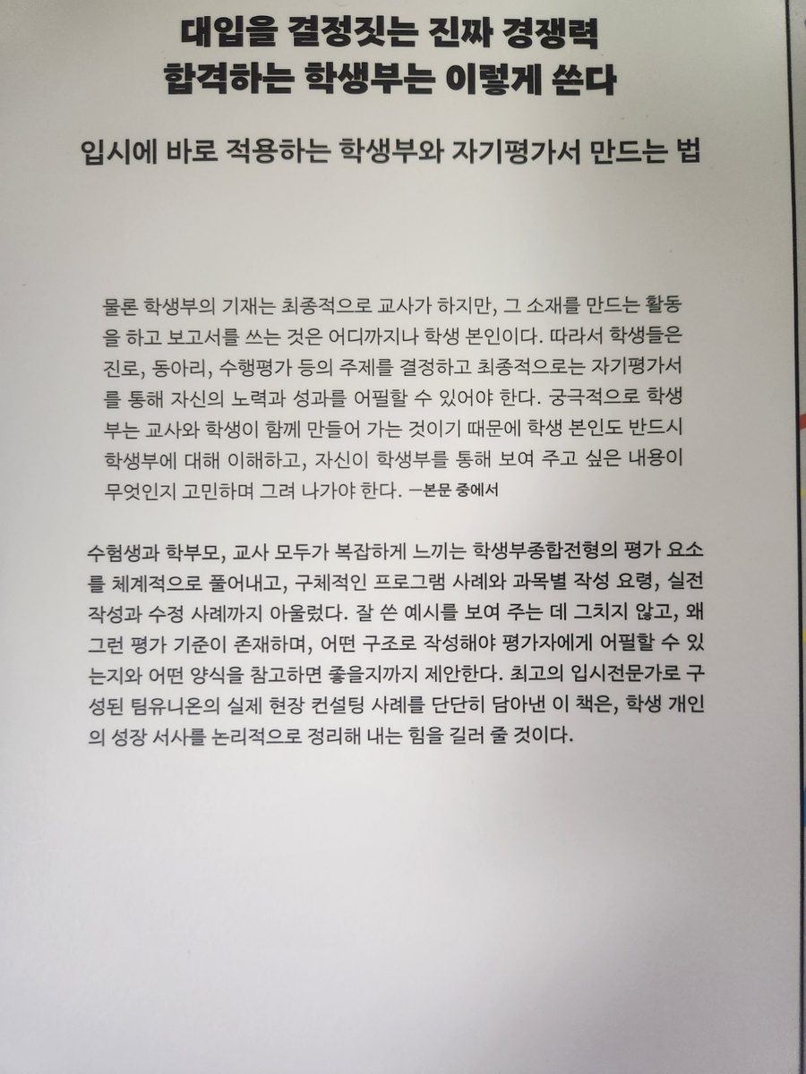 이 책이 학생부와 자기평가서에 대해 올바른 시각과 관점을 정립하고 대입 합격의 가능성을 열어주는 좋은 책으로 오랫동안 수험생, 학부모, 선생님들과 함께하길 바랍니다. 감사합니다^^*