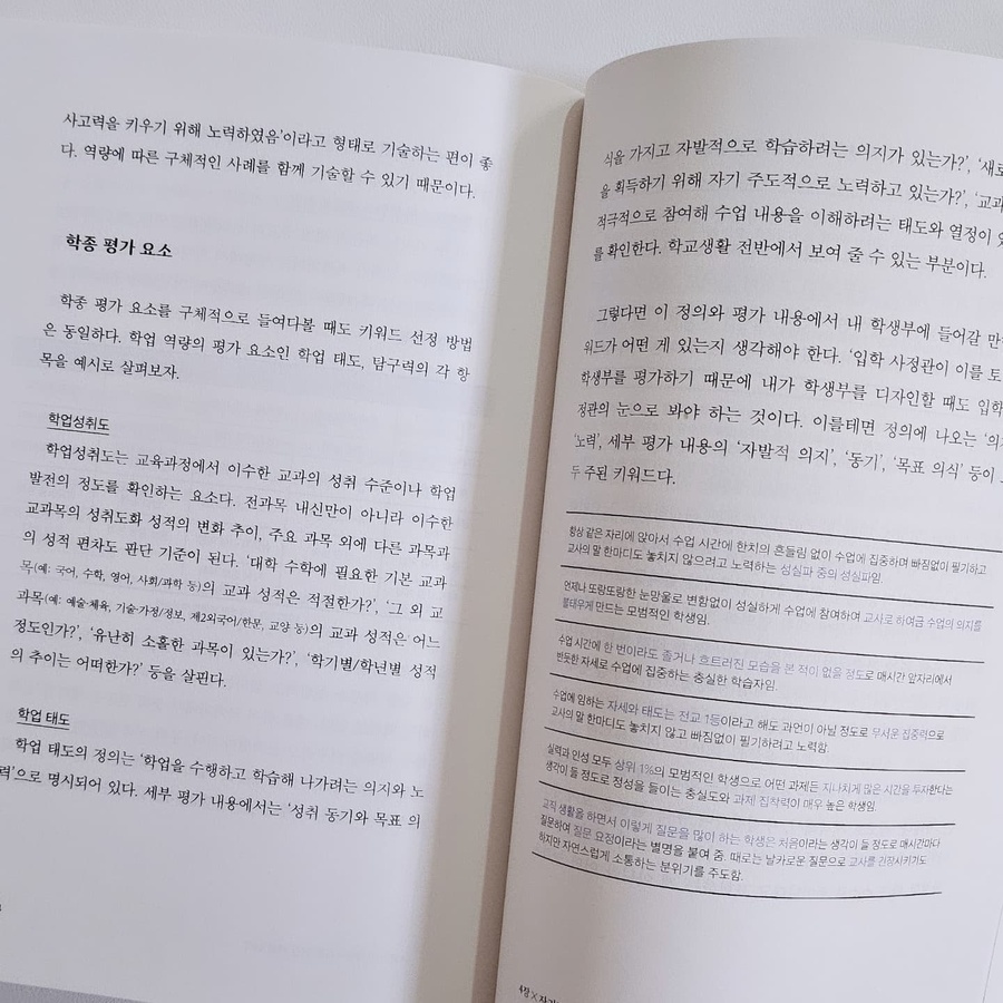 이 책은 “대학이 주목하는 학생부와 자기평가서의 작성전략”을 표방하고 있습니다. 그래서 저자들이 학교 현장에서 쌓은 노하우를 기반으로, 변화하는 대입 패러다임을 “대학에서 요구하는 포인트”를 잡아 구체적인 방향을 제시하며 실제 전략을 보여주고 있는 장점과 매력을 갖고 있는 좋은 책이라 생각됩니다.