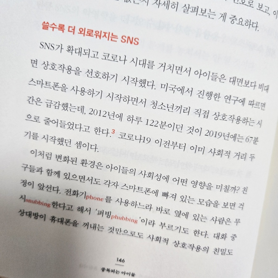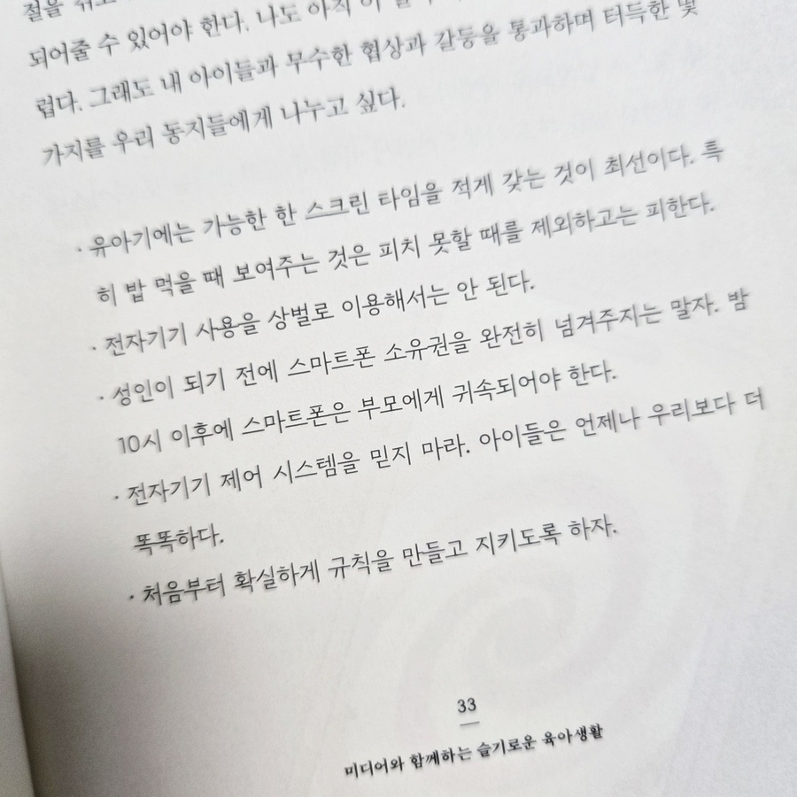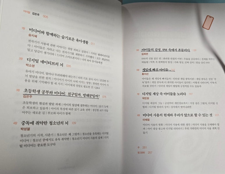 책을 받을 때 도서와 함께 온 편집장님의 하고싶은 말씀이 편지로 함께 받을 수 있었다. 이 책의 구성에는 저는 특히 목차에서 제가 중요하게 생각하던 주제에 대해서는 체크를 하고 더 집중해서 읽었네요... 본문으로 들어가기 전에 머리말에서 중요하게 생각했던 글귀가 있어 적어봅니다. -디지털 미디어와 아이의 관계에 대한 부모님들의 이해를 돕고 실질적으로 보탬이 되는 정보들을 제공하고자 기획하고 집필 할 것이다. -학령기: 디지털 콘텐츠의 자극 및 몰입 문제를 중심. 청소년기: 아이들의 심리와 정신 건강에 나타나는 영향을 복잡적으로 설명했다. -아이가 그것을 어떻게 사용하고 있고 거기에 어떤 의미를 부여하고 있는지를 이해하는 데서 시작된다. -아이들은 디지털 세상에서 현명하게 살아갈 방법을, 부모님들은 좀더 여유롭게 아이들을 이해하고 도울 지혜를 얻어갈 수 있을 것이다. 이 책에서는 미디어를 끊는 것이 아닌 어떻게 하면 효율적인 방법으로 다스릴 것인지를 알려주는 도서라 더 의미가 있을 것입니다.. 본문으로 들어가보면 p. 33 성인이 되기 전에 스마트폰 소유권을 완전히 넘겨주지는 말자. 밤10시 이후에 스마트폰은 부모에게 귀속되어야 한다. p. 70 부모가 명확히 원칙을 갖고 현명하게 이용한다면 미디어는 아이나 부모 모두에게 도움이 될 수 있다. p. 79 특정 시기의 발달적 특징은 아이들이 디지털 미디어를 사용하는 방식과 그 영향을 결정짓는 중요한 요소다. 부모는 각 발달단계의 특성과 아동의 욕구 및 디지털 미디어에 대한 반응 특성을 잘 이해해야 한다. 초등학생 때의 발달 과제가 자기 조절 능력의 습득인 만큼. '디지털 미디어 사용 조절력을 키우는데 매우 중요하다.' p. 81 초등학생들은 어른의 명확한 지시와 절차가 있을 때 안정감을 느낀다. 규칙이나 절제를 가르치기 매우 적합한 시기다. p. 84 디지털 미디어는 요즘 아이들의 생각과 상호작용, 성장 방식에 큰 영향을 미치고 있다. 이 시기의 아이들은 전두엽 발달이 미숙해 정서적으로 불안정하고, 만족 지연 능력도 부족해 미디어 사용을 스스로 조절하기 어렵다. 어른들의 관리와 지도가 꼭 필요하다. 디지털 미디어의 과도한 사용은 초등학생들의 신체적, 정신적, 사회적 발달에 부정적인 영향을 미칠 수 있다. 심하면 의존이나 행위 중독과 비슷한 문제를 겪을 수도 있다. p. 106 초등학생때는 자율과 감독의 균형으로 자기 조절 능력을 향상시키는 게 중요하므로 그러기 위해 규칙을 지키는 훈련을 해야 한다. 이런 과정을 통해 확립한 건강한 습관은 향후 청소년기에 더 큰 유혹을 이기게해줄 튼튼한 도태가 될 것이다. 특히 미디어 사용과 기타 활동의 균형을 모델링하는 데 부모의 역할이 크다는 걸 인식하는게 중요하다. 아이의 특성을 고려해 개별화된 미디어 사용 계획을 세우는 것도 중요하다. p. 135 아이들이 디지털 기술의 발전 과정에서 발생하는 부작용을 겪지 않고 긍정적인 면을 활용하면서 발전의 흐름에 함께하도록 도와주려면 상황을 정확히 판단하고 지도하는 능력이 필요하다. p. 142 sns를 줄이라는 지침에서 그치지 않고 아이들이 처한 환경을 깊이 있게 이해하며 건강하게 변화시킬 수 있는 방향을 모색해보고자 한다. p. 165 sns는 이제 아이들의 삶을 구성하는 중요한 환경이 되었다. sns는 친구를 사귀고 위로를 받는 공간이 되기도 하고 비교와 소외 과몰입 속에서 상처를 키우는 공간이 되기도 했다. sns를 못하게 하는 것보다 더 중요한 것은 아이가 그 안에서 어떤 경험을 하고 있는지를 호기심 가득한 눈으로 들여다보는 것이다. sns 세상은 완벽하게 안전한 공간은 아니다. 하지만 부모와 아이가 꾸준히 대화하고 조율해나간다면 그 속에서 건강한 성장은 가능한 것이다. p. 171 디지털 기기와 기술에 익숙한 세대애게 게임은 단순한 여가 활동을 넘어 디지털 문화의 핵심 요소가 됐다.아이들이 게임에 빠져드는 것은 게임이 펼쳐지는 인터넷 가상 공간을 '자신만의 공간'으로 여기기 때문이다 청소년기는 인간 생애에서 가장 불안정하고 변화가 많은 시기로 이때 아이들은 종종 반항적인 태도를 보이기도 한다. 현실 적응에 어려움이 따를 때는 가상의 세계를 넘나들면 자신을 위로하고 욕구를 분출한다. 제 나름의 자기, 즉 '정체성'을 확립해나가는 것이다. p. 172 사회적 상호작용도 큰 매력이다. 게임 중에서도 멀티플레이어 게임은 친구들과 함께 놀 수 있는 장소가 된다. 어떤 아이들에게 게임은 스트레스를 해소할 구멍이다. p. 194 게임이 전두엽의 인지 기능을 활성화하며, 그중에서도 빠르게 변하는 자극에 반응하는 능력에 기여한다. 게임은 사회적 기술에도 도움이 된다. 가상 세계에서 여러 사회적 상황을 경험할 수 있기 때문이다. 온라인 멀티플레이어 게임은 협업과 의사소통, 리더십 등을 경험할 기회가 된다. 공통의 목표를 위해 다른 사용자들과 함께하는 경험은 사회적 기술을 발달시키고 실제 대인관계와 사회적 상호작용에서도 도움이 된다. 시뮬레이션 게임에서는 창의력 발달도 노릴 수 있다. 또한 정신건강에도 긍정적인 영향을 준다. 청소년은 일상의 스트레스를 안전하게 해소할 수 