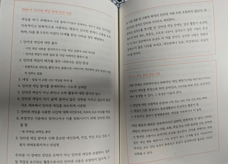 p. 223 미디어는 우리 생활 곳곳에 스며들어 있다. 어떤 미디어를 어떻게 볼 것인지를 선택해야 할 때다. p. 247 미디어 사용은 점점 늘어나고 있다. 이는 막을 수 없는 흐름이다. 발달단계별로 미디어가 미칠 수 있는 영향을 파악해둬야 한다. 미디어의 파도 속에서 아이들의 배가 올바른 방향으로 나아갈 수 있도록 돕는 것이 부모의 역할이다. 부모와 아이가 하는 가정에서의 노력에 더해 사회 차원의 보다 큰 틀에서 안전한 환경을 만들어주려는 시도 또한 필수적이다. 중요하게 짚고 넘어가고자 하는 인터넷 중독에 대해서는 따로 서술하겠습니다. p. 173 '인터넷 중독'개념- 1990년대 중반에 처음 등장. 인터넷이 급격히 확산되며 과도한 인터넷 사용의 부작용이 나타나기 시작하던 시기이다. 이에 '정신질환 진단 및 통계 편람'5판에 인터넷 게임 장애가 조건부 진단으로 포함됐으며 국제질병진단분류의 11번째 개정판에는 '게임장애'라는 진단이 공식 등재되었다. 인터넷 게임 중독의 치료 p. 190 게임 사용자의 문제에 집중해 통합적으로 접근해야 한다. 경미 증상- 게임 몰입 : 중독에 대한 인식 제고와 예방적 접근이 필요함. 자녀와 부모가 협의해 게임 이요 규칙 정하기, 게임이 아닌 다른 활동 장려하기, 사회적 관계 형성 지원하기, 게임을 무조건 금지하는 대신 교육적 게임 활용하기 등이 도움. 중등도 이상증상-인터넷 게임 중독: 진료 현장의 청소년은 대게 이 단계 이상에 속함. 의사, 임상심리사,사회사업가 등이 협력해 치료적으로 접근해야 함. 치료방법: 1) 인지 행동 치료: 게임에 몰두하게 만드는 왜곡된 생각을 바로잡고 현실의 삶에서 만족감을 찾는 방법을 배우도록 돕는 것. 2) 변증법적 행동 치료: 감정 및 충동 조절 문제를 다룸. 감정을 인식, 조절하고 스트레스에 대처하는 기술을 가르침으로써 게임 의존도를 낮추고 정서를 안정시키는 방법임. 이외에도 체육이나 음악 등 예체능 치료가 즐거움과 성취감을 주는 데 효과적이라는 연구 결과가 있다. 이런 활동들은 게임의 대안이 되며 건강한 취미를 만드는데 도움을 준다. 이 책을 읽으면서 느낀 점은 미디어는 우리 일상생활에 깊숙이 들어와 있기에 그것을 끊으려 하지말고 유용한 점은 취하고 나쁜 점은 제거해 나가는 방법을 써야 한다는 것이다. 그리고 애들마다 각자의 특성이 있는데 이런 애들은 정보의 바다와 책에서 알려주는데로 일괄적인 방법을 써서 통제하려 하지말고 우리 아이를 먼저 살펴봐서 우리아이에게 맞는 방법을 찾기를 바란다. 다른 아이가 하니깐 우리 아이도...이런 마인드는 또한번의 우리 아이를 상처 주는 방법인 것 같다... |