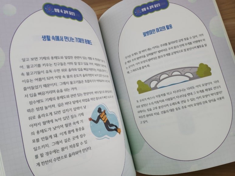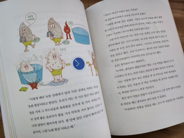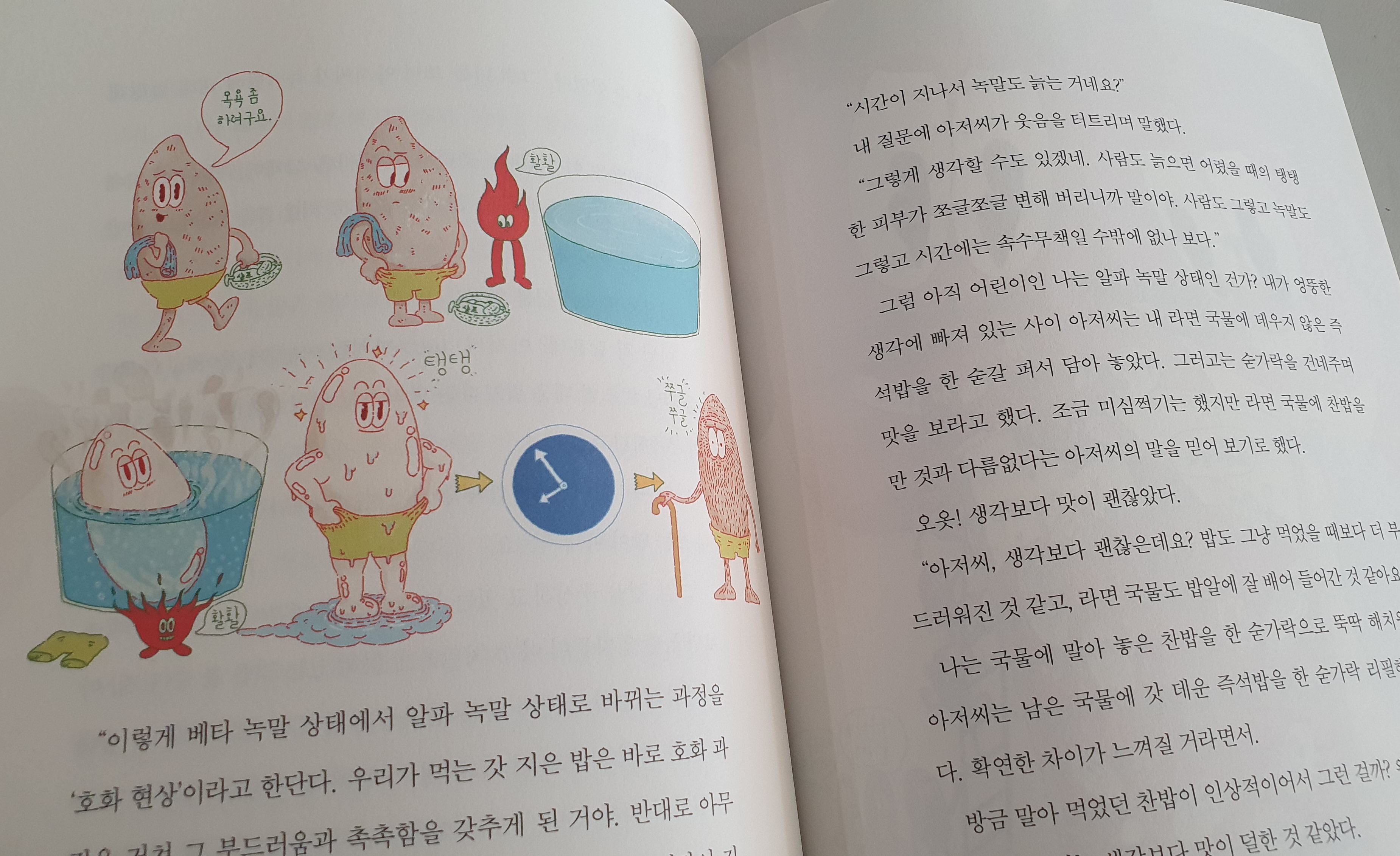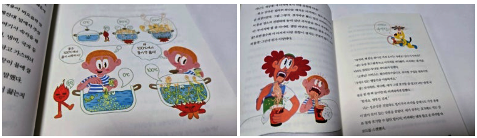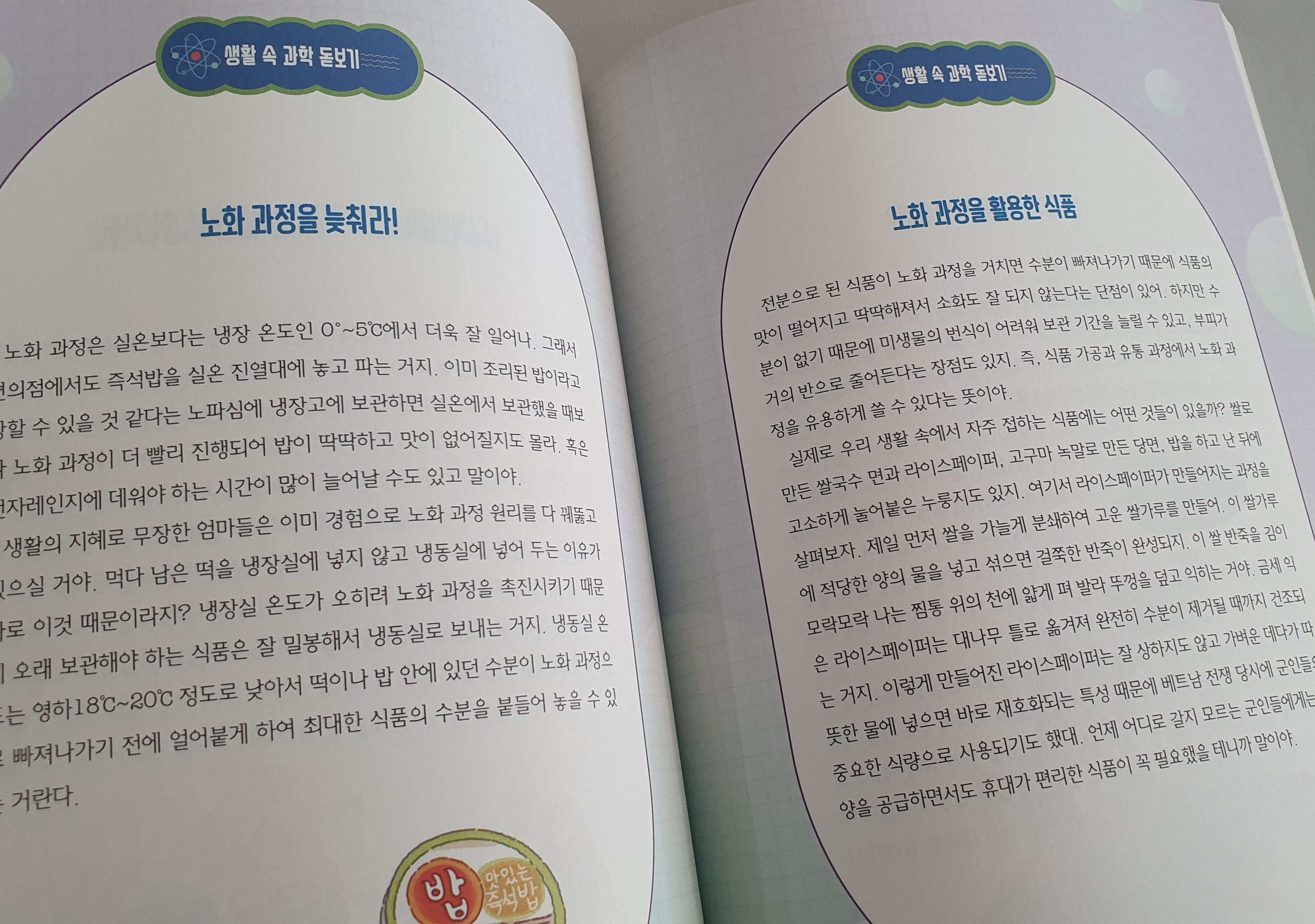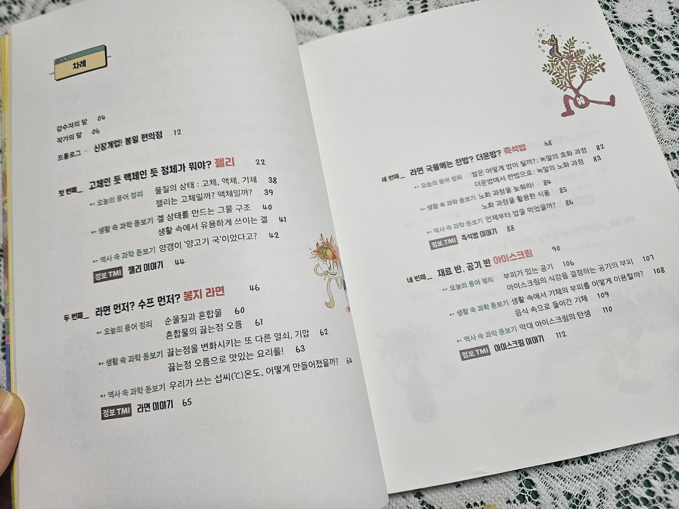 요즘 과학, 화학에 관심을 가지고 있는 우리 둘째에게 좋은 책을 추천해 주었어요. 바로 북멘토에서 나온 '편의점을 털어라! 화학편' 인데요. 우리의 일상에서 접하는 편의점의 음식들이 우리 생활과 얼마나 밀접하게 연관되어 있고 우리 생활에 얼마나 큰 도움이 되는지 알려주는 책이랍니다. ![]() 학교나 집 가까이에 있는 편의점 편의점은 요즘 아이들에게 매우 익숙한 곳인데요. 아이들이 편의점에 가서 음식을 자주 사 먹기도 하죠. 이러한 편의점 음식들을 먹으면서 화학 지식도 쌓을 수 있도록 만든 '편의점을 털어라! 화학편'입니다. ![]() 이 책을 출간하신 고은지 작가님은 초등학교에서 아이들을 가르치고 계세요. 교과서 속 지식이 어린이들의 생활에 살아 숨 쉴 있도록 재미있게 글을 쓰셨답니다. ![]() 목차 첫 번째 고체인 듯 액체인 듯 정체가 뭐야? 젤리 오늘의 용어 정리_ 물질의 상태 : 고체, 액체, 기체/ 젤리는 고체일까? 액체일까? 생활 속 과학 돋보기_ 겔 상태를 만드는 그물 구조/ 생활 속에서 유용하게 쓰이는 겔 역사 속 과학 돋보기_ 양갱이 ‘양고기 국’이었다고? 정보 TMI_ 젤리 이야기 두 번째 라면 먼저? 수프 먼저? 봉지 라면 오늘의 용어 정리_ 순물질과 혼합물/ 혼합물의 끓는점 오름 생활 속 과학 돋보기_ 끓는점을 변화시키는 또 다른 열쇠, 기압/ 끓는점 오름으로 맛있는 요리를! 역사 속 과학 돋보기_ 우리가 쓰는 섭씨(℃) 온도, 어떻게 만들어졌을까? 정보 TMI_ 라면 이야기 세 번째 라면 국물에는 찬밥? 더운 밥? 즉석밥 오늘의 용어 정리_ 쌀은 어떻게 밥이 될까? : 녹말의 호화 과정/ 더운밥에서 찬밥으로 : 녹말의 노화 과정 생활 속 과학 돋보기_ 노화 과정을 늦춰라!/ 노화 과정을 활용한 식품 역사 속 과학 돋보기_ 언제부터 밥을 먹었을까? 정보 TMI_ 즉석밥 이야기 네 번째 재료 반, 공기 반 아이스크림 오늘의 용어 정리_ 부피가 있는 공기/ 아이스크림의 식감을 결정하는 공기의 부피 생활 속 과학 돋보기 _ 생활 속에서 기체의 부피를 어떻게 이용할까?/ 음식 속으로 들어간 기체 역사 속 과학 돋보기_ 막대 아이스크림의 탄생 정보 TMI_ 아이스크림 이야기 다섯 번째 포장지 속 기체의 정체 감자칩 오늘의 용어 정리_ 반응성이 낮은 기체, 질소/ 반응성이 높은 기체, 산소 생활 속 과학 돋보기_ 질소의 이용 역사 속 과학 돋보기_ 질소의 뜻이 ‘질식시키는 물질’이라고? 정보 TMI_ 감자칩 이야기 여섯 번째 이산화탄소의 압력을 견뎌라! 탄산음료 오늘의 용어 정리_ 이산화탄소를 많이 녹이려면 : 기체의 용해도/ 이산화탄소의 압력을 견뎌라 : 아치 모양 생활 속 과학 돋보기_ 생활 속에서 만나는 기체의 용해도/ 팔방미인 아치의 활용 역사 속 과학 돋보기 _ 왕관 병뚜껑의 발견 정보 TMI_ 탄산음료 이야기 일곱 번째 엄청난 수증기 압력 팝콘 오늘의 용어 정리_ 압력이란?/ 팝콘 튀기기 : 기체의 압력 생활 속 과학 돋보기_ 모든 옥수수가 팝콘이 되는 것은 아니야/ 팝콘을 만드는 수증기의 힘이 증기 기관차를 움직였다고? 역사 속 과학 돋보기_ 팝콘, 인디언들의 발명품 정보 TMI _ 팝콘 이야기 ![]() 신장개업! 봉일 편의점 학원 맞은편 골목에 있는 새 간판의 편의점에 들어선 주인공 나도명과 봉일 편의점 주인이자 20년차 과학자 봉일 박사의 만남으로 편의점에 숨겨진 화학을 찾아내며 이야기가 시작되는데요. 물질의 상태 : 고체, 액체. 기체를 알아보며 젤리는 고체일까? 액체일까를 알아봅니다. ?????? 이렇게 편의점을 털어라 화학편은 이야기만 있는 것이 아닌 용어정리, 생활 속 과학 돋보기, 역사 속 과학 돋보기, 정보 TMI라고 해서 그 편에 관련된 이야기가 가득하답니다. 이 책 한 권으로도 얻어 가는 지식이 얼마나 많은지 알게 되는데요 화학을 접할 수 있는 기회가 편의점을 통해 더욱더 재미있게 다가와 아이들이 가까운 편의점에 가서 책을 통해 알게 된 지식들을 서로 이야기하기 바쁘답니다. 즐겁게 화학을 배우게 되는 편의점을 털어라 '화학편' 추천합니다. |