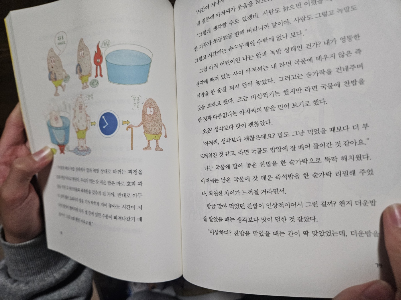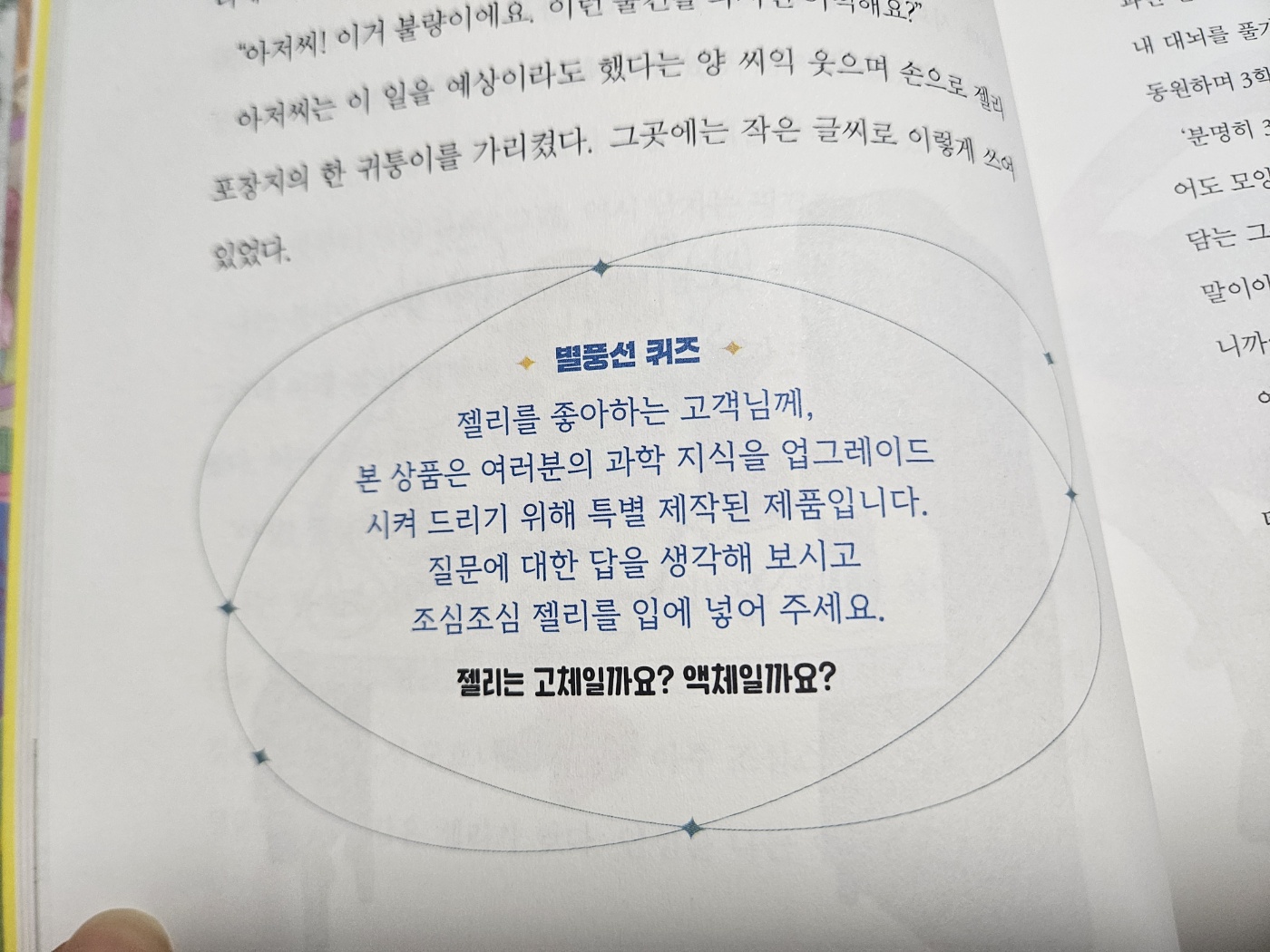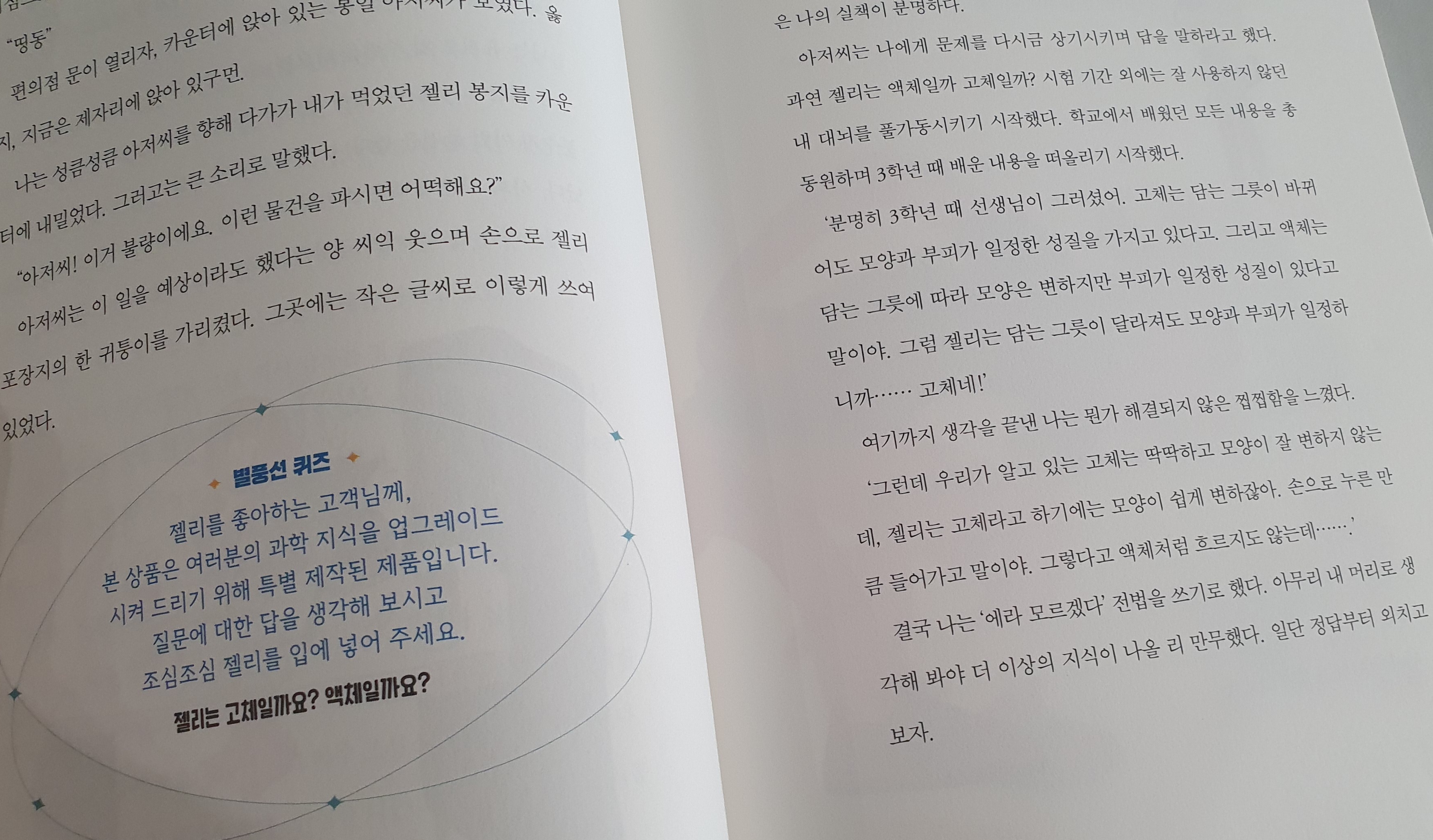 * 출판사로부터 도서를 제공받아 작성한 서평입니다.![]() '편의점을 털어라'라는 제목이 재미있어 보여 읽어보게 된 책이랍니다. 요즘 곳곳에 편의점이 참 많죠? 제가 사는 아파트 단지 안에도 편의점이 들어와 있어요~ 그러다보니 아이 하원 후에 오다가다 들르는 곳이 바로 편의점이 되었죠~ 뭔가 참새방앗간 느낌의 편의점.. 어른이나 아이 모두 사랑받는 친숙한 공간이지요. 대체 이 편의점에서 어떤 과학적 원리를 발견할 수 있을까요? 이 책은 편의점에서 파는 다양한 먹거리를 가지고 화학의 여러가지 원리들을 알려준답니다. 일단 과학적 지식에 대한 책을 읽는다는 느낌보다는 한 편의 재미있는 창작 동화를 읽는 느낌이라 과학에 대해 어렵게 생각하거나 부담을 느끼는 아이들도 편한하게 읽을 수 있다는 장점이 있어요. ![]() 이 책의 기본 구성은 편의점에서 물건을 사고 포장을 꼼꼼하게 살펴보면 별풍선 퀴즈가 있어요. 이 퀴즈를 맞히면 다음에 사는 물건은 어떤 물건이든 공짜랍니다. 참 독특한 편의점이지요? 처음으로 주인공이 산 것은 젤리였는데 젤리 포장지에 있던 별풍선 문제는 '젤리는 고체인가? 액체인가?'라는 물질의 상태를 묻는 문제였어요. 저는 이 문제를 보고 '당연히 고체 아니야?'라고 생각했는데 웬걸요... 고체도 액체도 아닌 '반고체'라네요. 이 '반고체'를 '겔'이라고 한대요. 뭔가 물질의 상태는 '고체, 액체, 기체'이렇게 3개가 머릿속에 콱 박혀있던 저로서는 처음부터 신선한 충격이었답니다. 그러면서 젤리가 어떻게 만들어지는지도 봉일 편의점 주인아저씨가 주인공에게 재미있게 설명해주지요. ![]() 이렇듯 편의점의 다양한 먹거리 중에서도 아이들이 편의점에서 주로 사먹는 먹거리인 젤리, 라면, 탄산음료, 밥, 아이스크림, 과자 등으로 이야기를 풀어내니 더 흥미로웠던 것 같아요. 먹거리를 통해 자연스럽게 화학적 개념을 끌어내는 것이 신선하다는 생각을 했어요. 과학 중에서 화학의 가장 기초적인 용어들 즉 초등학교에서 배우게 되는 끓는점, 물질의 상태, 기체의 용해도, 부피 등의 개념을 쉽고 재미있게 익힐 수 있게 알려주는 책이라는 생각이 들었어요. ![]() ![]() 각 주제가 끝나면 이야기를 통해 알게 된 화학적 용어에 대해 잘 정리해서 설명해주고 '생활 속 돋보기', '역사 속 돋보기', 정보TMI코너를 통해 관련 지식을 더 확장해주며 과학적인 지식을 알려주는 것에도 충실하답니다. 어른인 저도 잘 몰랐던 개념, 어설프게 알았던 것들을 이 책을 통해 알게 되었어요. 이 책을 읽고 나니 '편의점을 털어라' 의 다른 시리즈도 읽어보고 싶더라구요. 한 편의 재미있는 동화를 읽는다 생각하고 부담없이 읽어보면 좋을 과학 동화라고 생각합니다. #북멘토 #편의점을털어라화학편 #편의점을털어라 #화학 #과학 #책세상 #맘수다 #편의점 #책세상맘수다카페 |