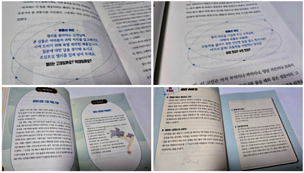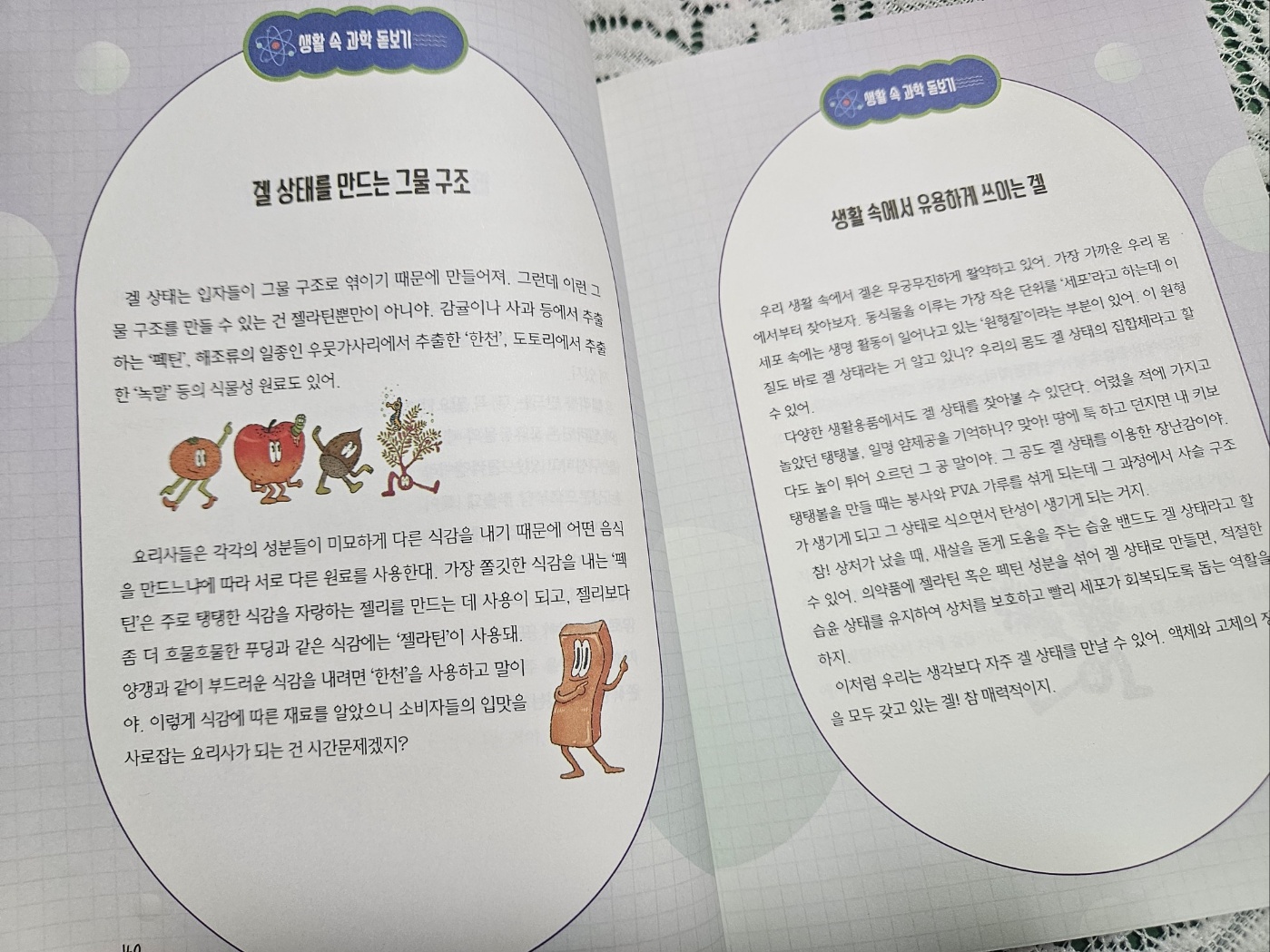![]() ![]() 아이들에게 익숙한 편의점에서 화학지식을얻는 즐거움까지 발견할수 있는책!! 엄마도 몰랐던 과학상식을 알아가는 재미로 아이와 함께 읽었어요 ㅎㅎ 아이는 화학이 아직 무엇인지 모르지만 책을 통해 재미나게 상식을 키웠다고 좋아하네요^^ 젤리는 액체일까요?고체일까요? 퀴즈형태로 되어있어 빨리 답을 찾고 싶어집니다 과연 두둥~~ 젤리는 푸딩,도토리묵처럼 GEL 상태라는 것!! 하나의 퀴즈를 풀고나면 <오늘의 용어정리>코너가 있어 이야기로 읽은 것을 정리해 보아요. 또 <생활 속 과학 돋보기> 코너로 배운 내용이 어디에서 또 활용되는지 보고 <역사속 과학 돋보기>에서는 역사에서 활용되었던 과학을 들여다 볼수 있어요. 많은 정보들이 한권안에 담겨 있는데 체계적으로 과학지식을 쌓을수 있어서 좋았답니다 |