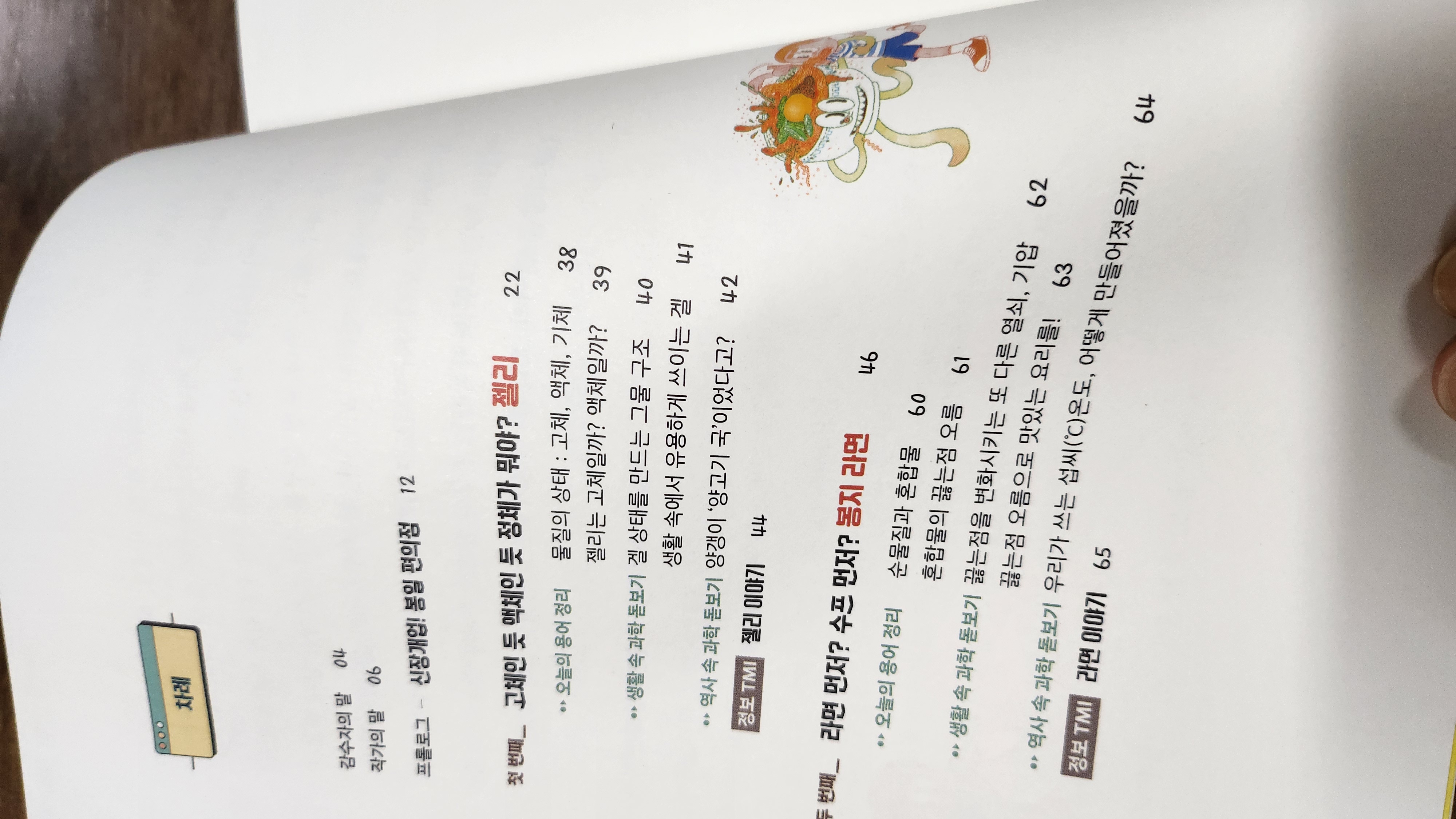 과학을 좋아하는 아인데, 특히나 화학부분의 실험이 이뤄지는것들을 좋아해서 이번편이 아이에게도 특별했나봐요. 젤리의 형태가 어떤것인지 묻기도 하고 특히나 라면끓일때 스프먼저, 라면먼저 하면서 어떤게 맛있냐고 했을때 스프먼저!였던 이유에서 순물질과 혼합물, 끓는점에 대해서 알아보고 라면에 말아먹는 국룰 찬밥!이 왜 좋은 선택인지 녹말의 노화과정을 통해 이야기해요. 아이스크림이 어떤건 샤벳같고 어떤건 딱딱하고~ 아이가 궁굼했었다는데 이유를 정확히 알게되었다며 설명도 해주었어요. 과자를 지켜주는 빵빵함! 질소와 산소도요~~