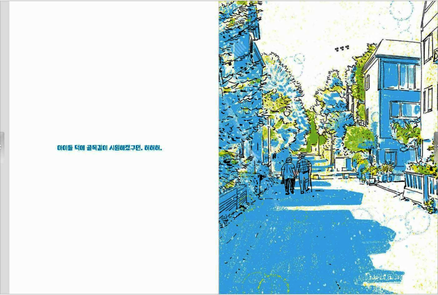 뒷면지엔 앞면지에 나왔던 아파트 단지 골목이 시원해져 있는 거로 끝납니다. 나무랑 식물들도 살아나 있고 그림자를 보니 해도 서쪽으로 가서서 하루가 지고 있어요. 물총 삼총사 덕분에 모두 시원한 하루를 보낸 하루~가 담겨 있는 그림책입니다. 요샌 젊은이들이 물총 놀이를 더 즐기는 거 같아요. 워터밤도 가고 에버랜드에서 워터페스티벌도 하고 말이죠. 하지만 뭐라해도 물총놀이는 아이들이 여름에 젤 기대하는 놀이죠~~~ 여름의 끝자락에 들어선 8월 말. <물총팡팡>읽고 아이들이랑 마지막 물총 놀이 어떤가요? 덥고 지루한 하루가 신나고 즐겁게 변하는 마법이 펼쳐질 겁니다~ |