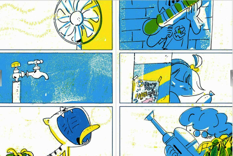 표지를 여니 앞면지에서부터 이야기가 시작됩니다. 선풍기가 돌아가는 여름날. 고양이가 늘어지게 하품을 합니다. 그런데 물총을 든 아이들이 전봇대, 담, 풀 뒤에 숨어 있어요. 수도꼭지에선 물방울이 떨어지고 있고요. 무언가 긴장감이 느껴지는 면지에요. 맴맴맴 매미가 우는 아파트 단지 장면입니다. 초록 나무들도 흐물흐물 화단의 초록이들도 흐물흐물 여름날 뜨거운 태양빛 아래 흐물흐물한 식물들입니다. 책 속의 더위가 어떤 더위일지 이번 여름 우리 제대로 느껴봤기에 그림만 봐도 숨이 턱턱 막힙니다 다다다 잎을 축 늘어뜨린 화분 옆으로 달려가는 발걸음 쥐를 잡던 고양이가 깜짝 놀라 눈동자가 왕방울만해졌어요. 왜냐구요? 바로 다음 장을 보니 아하~~~~ 아이들이 물총 놀이를 하고 있네요. 물총을 맞고 고양이는 놀라서 쥐를 놓치고 아이들은 '촤아아~찍찍찍~찌이이익~' 물총을 쏩니다.