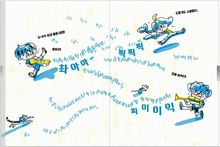 올 여름 무더위는 기록적이었죠. 해마다 무더위의 위세는 거세지기만 할 것 같아요. 이런 무더위가 계속 될 때 뜨거운 열기를 한 방에 날려버릴 놀이라면 바로바로 물총 싸움이지 않을까요? <물총 팡팡>은 우주 최강 물총 삼총사들의 활약으로 무더위를 즐겁게 이겨내는 유쾌한 그림책입니다. 묵직한 주제의 그림책으로 만나 봤던 장선환 작가님이 이렇게 귀엽고 산뜻한 그림책을 만드신 걸 보니 역시 작가님들은 대단하시다는 생각을 했지요.