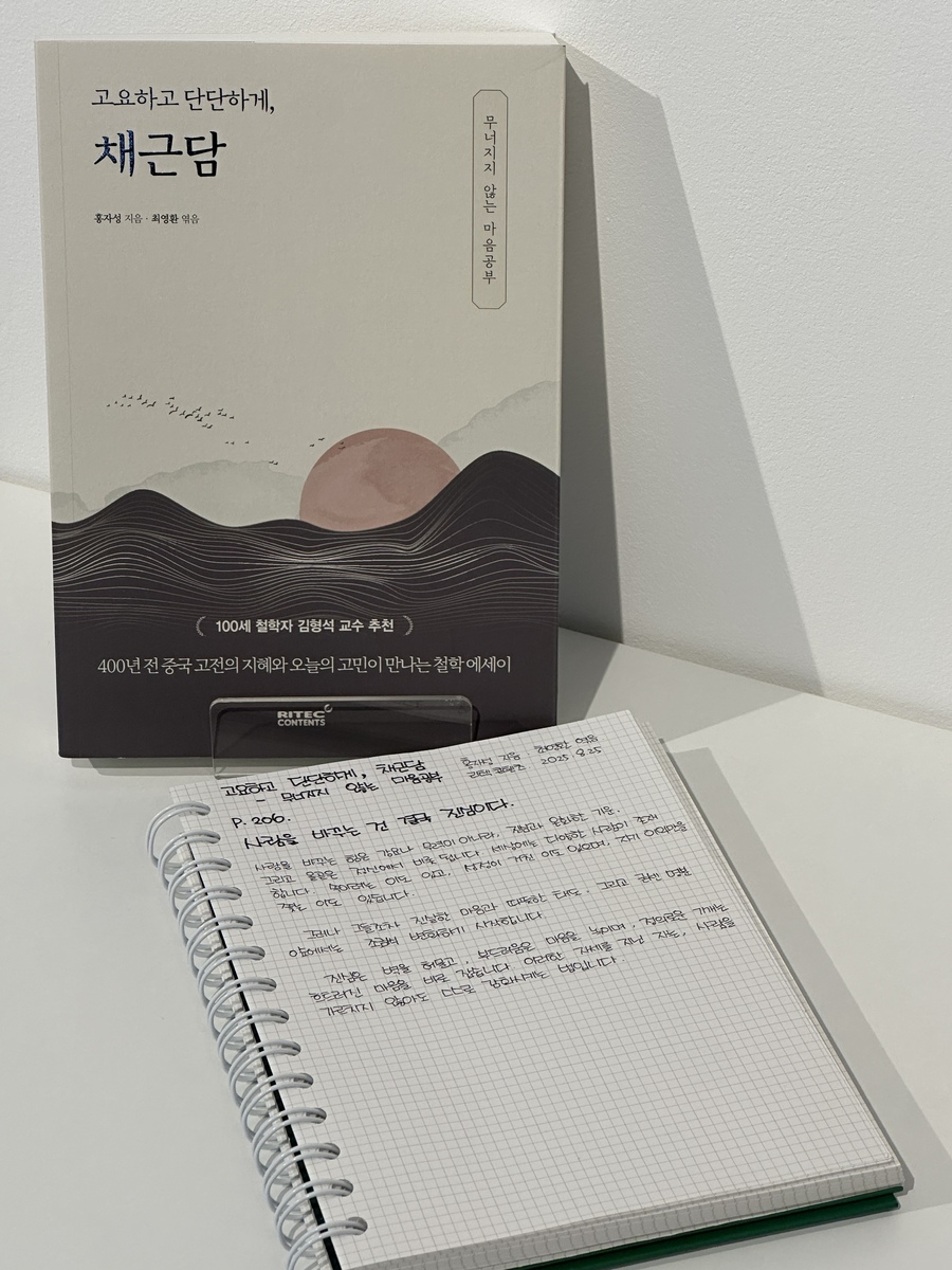 #출판사 #책선물 #고요하고단단하게채근담 #리텍콘텐츠 . . *내용: 중국 고전의 지혜를 담은 철학 에세이 엮음 *감상: 마음의 결과 뿌리가 중요해! *추천대상: 채근담 들어본 분 *이미지: 뿌리 *내면화: 내 내면의 뿌리는? . . '채근담'은 채소 뿌리의 이야기라는 뜻입니다. 우리 삶의 근간, 기본 마음 자세에 대해서 다룬다는 의미와 굉장히 잘 어울리는 의미입니다. 뿌리가 튼튼해야 이 격변의 시대를 잘 헤쳐나갈 수 있으니까요. 우울과 불안이 많은 현대인들, 각자도생의 시대, 개인주의가 심한 현대인들, AI 시대, 변화의 시대에 적응하기 바쁜 현대인들, 물질주의와 소비주의가 중심인 현대인들, 풍요로운 사회에서 점점 더 나약해지는 현대인들. 이 현대인들에게 꼭 필요한 내용을 담고 있는 책입니다. 아무리 세상이 달라져도 결국은 마음과 태도가 중요하니까요. 어떤 태도로 살아가는지가 삶을 결정합니다. 제목과 연결되어 가장 의미 있던 부분! 항상 지속가능성을 고민하는 입장에서 좋았어요. 마음의 결을 잘 챙기기! 뿌리가 없으면 꽃은 오래 피지 못한다. 결국 우리가 추구해야 할 것은 뿌리 깊은 삶입니다. 진정한 존경은 권위가 아니라 인품에서 피어난다는 사실을 잊지 말아야 합니다. 맑게 살아가는 단단한 품격 무엇을 버리고, 무엇을 지킬지를 스스로 선택해야 합니다. 진정한 삶은 외형이 아니라 마음의 결에 달려 있습니다. |