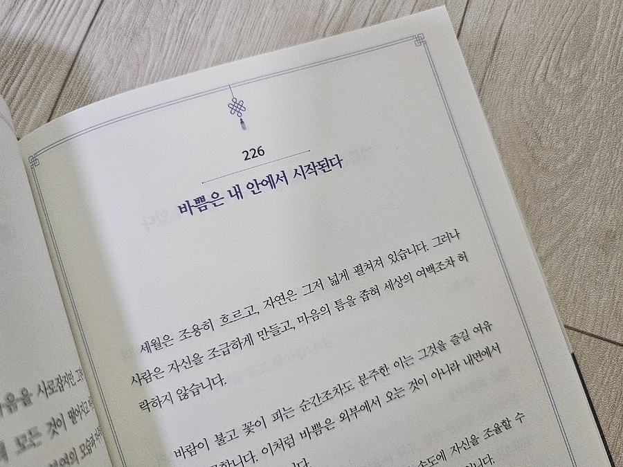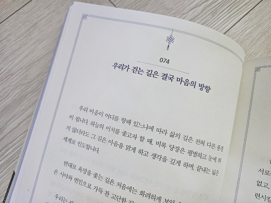 《채근담》은 명나라 말기 학자 홍자성이 남긴 글을 엮은 고전으로, 인간의 삶과 마음을 다스리는 지혜를 담고 있습니다. 책을 읽으며 가장 크게 느낀 건, ‘고요함 속에서 단단해지는 마음의 힘’ 이었어요. 바쁜 일상 속에서 잠시 멈춰 앉아 글귀를 따라 필사하다 보면, 오늘의 시끄러운 마음이 차분히 가라앉습니다. 어떤 날은 누군가에게 상처 준 내 마음을 돌아보게 되고, 또 어떤 날은 미처 보지 못한 고마움에 눈물이 나기도 했습니다. 책을 덮은 후에도 오래 마음에 남아, 마치 조용히 흐르는 강물처럼 삶을 지탱해주는 힘이 됩니다. 균형과 성찰이 필요한 모든 이들에게, 고요하지만 강한 울림을 전하는 책입니다 |