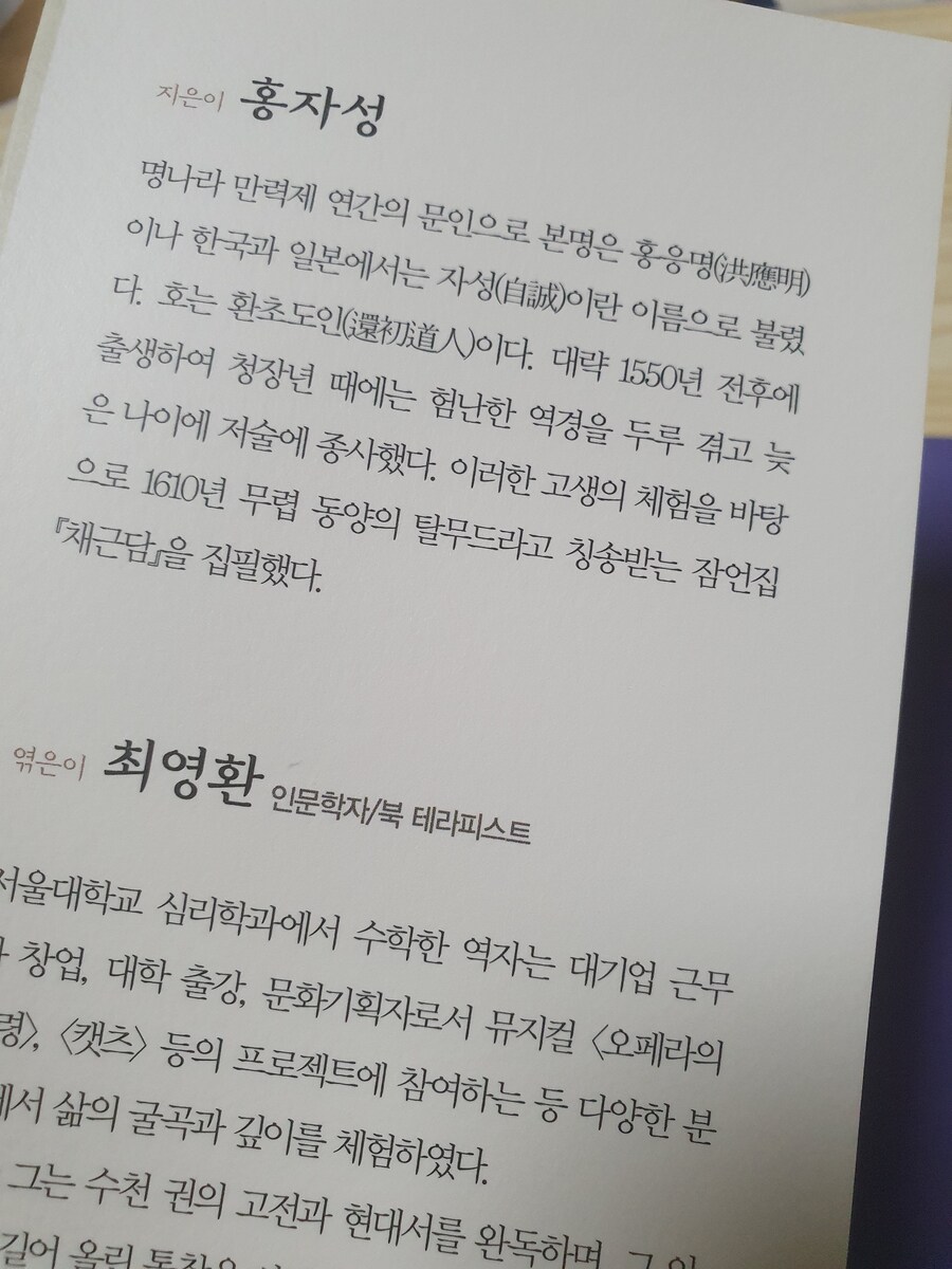 고요하고 단단하게, 채근담 이 책의 부제는 "무너지지 않는 마음공부" 이다. 고요하고 단단하게, 채근담 저자 홍자성은 명나라 만력제 연간의 문인이다. 본명은 홍응명(洪應明)이나 한국과 일본에서는 자성(自誠)이란 자(字)로 불렸다. 호는 환초도인(還初道人)이다. 대략 1550년 전후한 시기에 출생하여 청장년 때에는 험난한 역경을 두루 겪고 늦은 나이에는 저술에 종사했다. 1602년에는 도사와 고승의 행적 및 명언을 인물 판화와 곁들여 편집한 『선불기종(仙佛奇?)』 4권을 간행했고, 1610년 무렵에는 청언집 『채근담』을 간행했다.