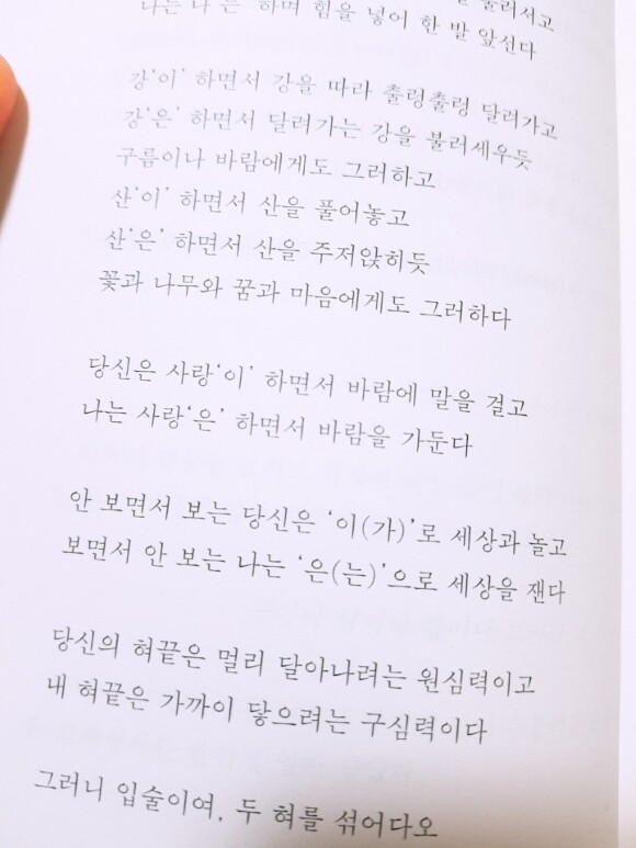 당신은 사랑'이' 하면서 바람에 말을 걸고 나는 사랑'은' 하면서 바람을 가둔다