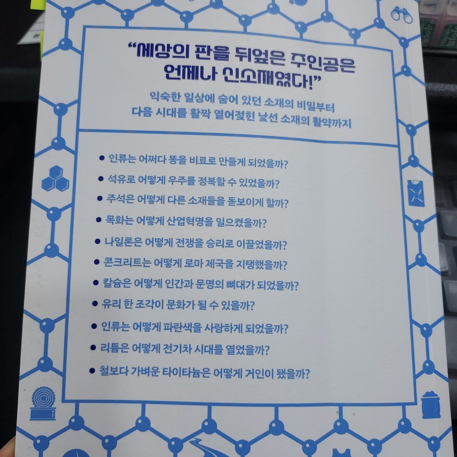 이 리뷰는 컬처블룸을 통해 출판사에서 도서를 제공받아, 직접 읽고 작성한 리뷰입니다. 지금 우리가 입고 있는 옷 그리고 사는 집 등 수많은 것들은 인류가 발견하거나 발명한 신소재를 사용하여 만들어진 것이라고 할수 있습니다. 말 그대도 신소재가 없었다면 지금의 인류도 존재하지 못했다고 말할수 있을 정도로 인류는 자신들의 편리한 생활을 위해 새로운 것을 늘 찾았다고 할수 있습니다.