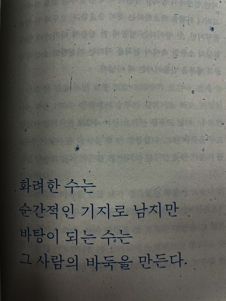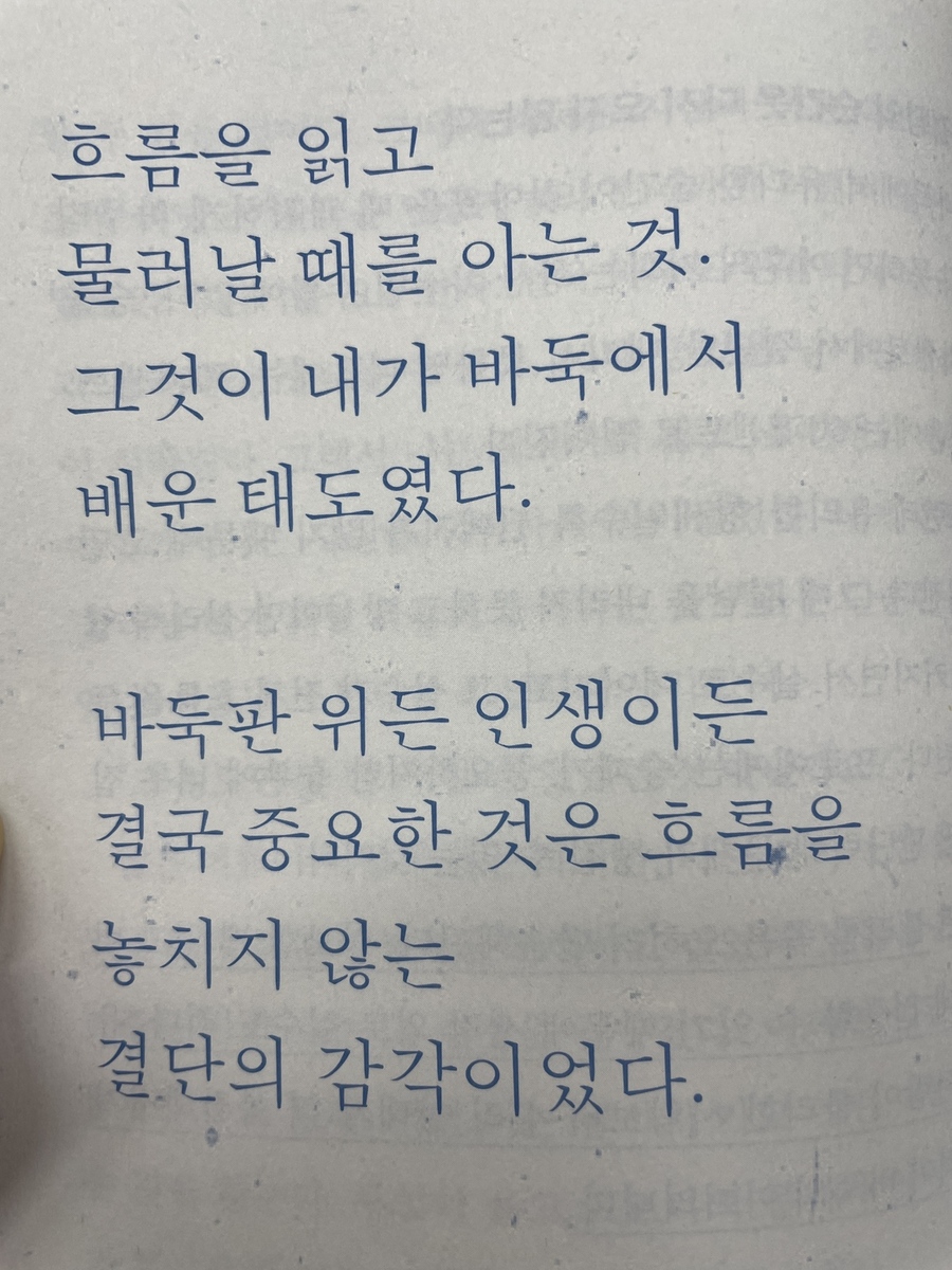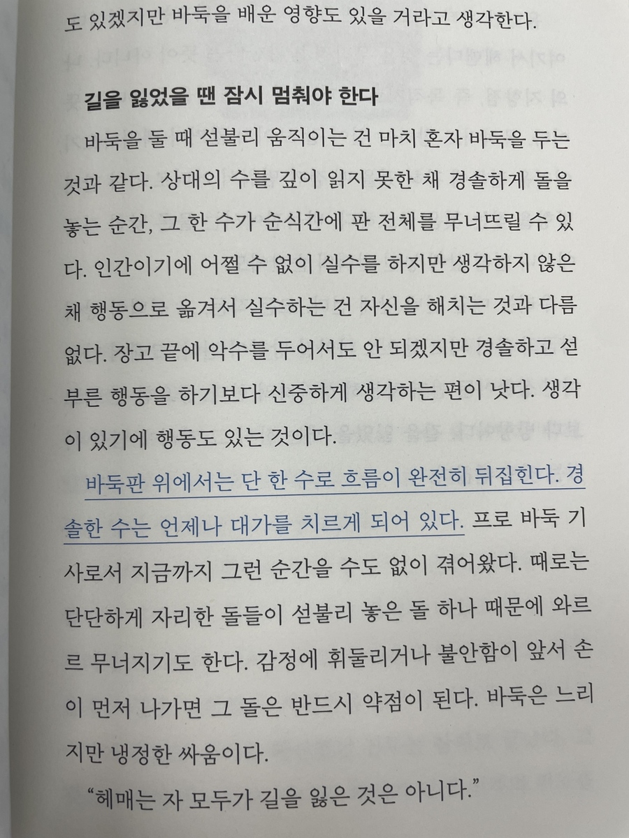 이세돌 9단은 프로기사로 활동하는 동안 총 1903번 대국을 치렀다고 한다. 치열한 전투의 한복판에서 25년을 산 것이다. 그 기간 동안 얼마나 많은 수읽기와 복기와 형세판단을 해왔을지 일반인으로서는 감히 상상조차 할 수 없다. 그런 그가 생각하는 인생에 대해 엿볼 수 있어서 좋았다. "바둑이란 정답 없는 세계에서 나만의 답을 찾아가는 것"이라는 말이 인상적이었다. 아무리 프로라도 이기느냐 지느냐보다 나만의 길을 찾고 나만의 예술을 완성하는 것이 더 우선이었다고 한다. 인생에도 꼭 필요한 태도라고 생각된다. 답이 없는 인생에서 누가 뭐라 해도 나만의 길을 찾는 자신감, 때로는 승부수를 던지는 과감함이 필요한 것 같다. 진짜 자신만의 전투를 해본 승부사만이 꺼낼 수 있는 문장들이 많았다. 인생을 대하는 좋은 태도를 얻었다. - 흐름을 읽고 물러날 때를 아는 것. 그것이 내가 바둑에서 배운 태도였다. 바둑판 위든 인생이든 결국 중요한 거은 흐름을 놓치지 않는 감각이었다. (22쪽) - 바둑판 위에서는 단 한 수로 흐름이 완전히 뒤집힌다. 경솔한 수는 언제나 대가를 치르게 되어 있다. (143쪽) - 바둑에서 가장 위험한 순간은 언제일까? 바로 이기고 있을 때다. 승리가 눈앞에 보일 때 우리는 자주 스스로를 의심한다. 더 확실한 길을 찾으려 하고, 더 완벽한 판단을 내리려 애쓴다. 하지만 신중함이 때로는 가장 큰 독이 되기도 한 다. (169쪽)- 화려한 수는 순간적인 기지로 남지만 바탕이 되는 수는 그 사람의 바둑을 만든다. (229쪽) - 수없이 복기하고 고뇌하며 매 순간 선택을 반복한 끝에 내 안에 기준이 세워졌다. (255쪽) |