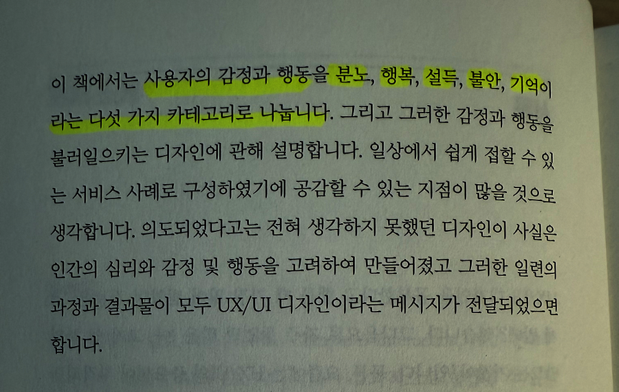 고객, 또는 독자가 UX를 보고 어떤 감정을 일으키는지를 기준으로 분류하고 있어 호불호가 어떻게 작용하는지, 우리가 왜 돈을 쓰는지를 이해할 수 있어서 좋았습니다. 바이오필릭, 녹색 갈증처럼 인간이 긍정적인 감정을 불러일으키는 디자인이라든지, 가치실현 시간 최소화 개념. 138쪽에 있는 UX디자인에서 꼭 필요한 5가지 체크리스트등의 정보를 담고 있어 어느날 UX디자인업무라는 이상한세계에 떨어진 디자이너들에게 유용합니다.