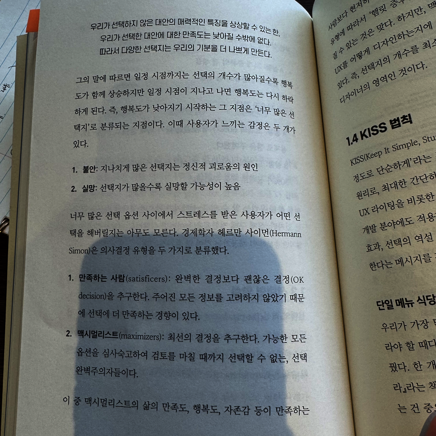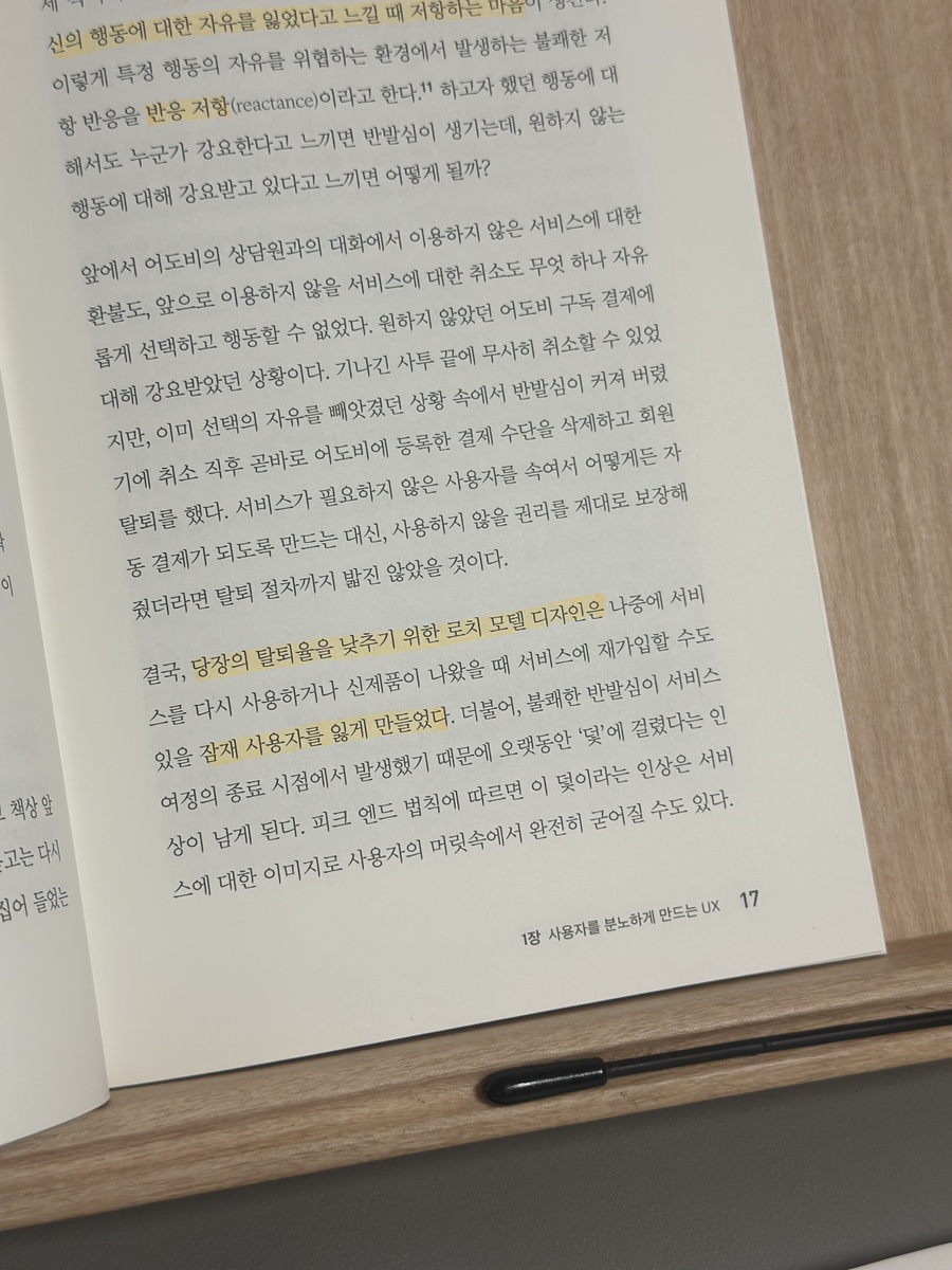 도서 정보 제목 : 30가지 심리학 이야기로 풀어보는 UX 이야기 저자 : 윤하린 출판사 : 비제이 퍼블릭 전체 감상 후기 심리학을 배우고, 콘텐츠로 눈을 돌린 뒤 가장 먼저 눈에 들어온 것이 UX, UI였습니다. 최근에는 콘텐츠뿐만 아니라 어디를 가도 UX, UI를 알고 있는 것이 좋았기에 공부하고 싶었습니다. 하지만, 낯선 디자인의 영역에 어려움만 가중되고 있었죠. 그때 마주한 책이 '30가지 심리학 이야기로 풀어보는 UX 이야기'였습니다. 도서는 시간을 쪼개서 읽어도 이틀이면 다 읽을 정도로 잘 읽히는 책입니다. 무엇보다 어려운 심리학 용어가 아닌, 어디서 들어본 이론이 많았기 때문에 누구나 쉽게 읽을 수 있다고 생각되는 책이었습니다. 기억에 남는 내용 및 감상 주의 편향 이론 특정 자극에만 주의를 기울이고 다른 것들을 배제하는 것 문장 유튜브에서 무료로 영상을 보는 것, 넷플릭스를 저렴하게 구독하는 것, 그리고 다운로드 비용 없이 게임을 하는 것 모두 광고 의뢰 기업에 우리의 집중력과 관심을 지불하고 서비스를 이용하는 거래 이유 평소 숏폼을 보다 보면 시간을 지불하고 있다는 생각이 들었다. 이 문장을 보며, 시간과 집중력을 돈 대신에 제공하고 있다는 생각이 들었고, '무료니까 괜찮아'가 아닌 그 이면을 생각해야겠다고 느꼈다. 또한 기업으로서는 일종의 거래로 느끼는 소비자를 어떻게 만족하게 할 있을지 고민해 볼 수 있다고 생각하였다. 스토리텔링 효과 이론 어떤 사실 정보가 나열된 수치나 개념으로 전달될 때보다 하나의 이야기로 전달될 때 좀 더 주목하고 그 사실을 기억할 확률이 높다. 이유 무언가를 구매할 때 '이거 사야 한다.'라는 생각이 아닌 이상 스토리로 인한 관심 -> 조사 -> 구매로 이어지는 경우가 많고 필요로 구매하더라도, 여러 제품군을 비교할 때 스토리를 보는 경우가 많기 때문에 중요하다고 생각된다. 죄책감과 관련하여 다양한 앱, 웹페이지 등을 사용하다 보면 죄책감이 유발되는 경우가 있다. 단지, 앱을 사용하는 것인데 죄책감이 들 때는 기분이 상하곤 한다. 도서를 읽으며 기업에서 왜 죄책감을 유발하는지 알 수 있었으며, 죄책감이 아닌 다른 방법으로 소비자를 유지할 방법의 필요성을 느꼈다. 단기 이익과 장기 이익 최근 광고를 보며 많이 느낀 이야기가 담겨 있었다. 소비자를 '유지'하기 위한 것이 아닌, 그저 '클릭 수'만 올리겠다는 광고를 자주 만난다. 이렇게 단기적인 성과를 보여주기 위한 광고에 들어가는 방법을 알 수 있었고, 장기 이익으로 이어질 수 없는 방법을 사용하는 기업 심리에 대한 궁금증도 생겼다. 마무리 UX에 관심이 있거나 심리학 - 디자인 연결에 관심이 있다면 추천하는 책입니다. 책을 읽으며 중간중간에 꽤 많은 생각을 필기하며 읽은 만큼 어렵지 않은 이야기로 생각할 거리를 많이 던져 주는 책이기에 디자인 뿐만 아니라, 가벼운 심리 서적을 읽고 싶을 때도 좋은 책입니다.