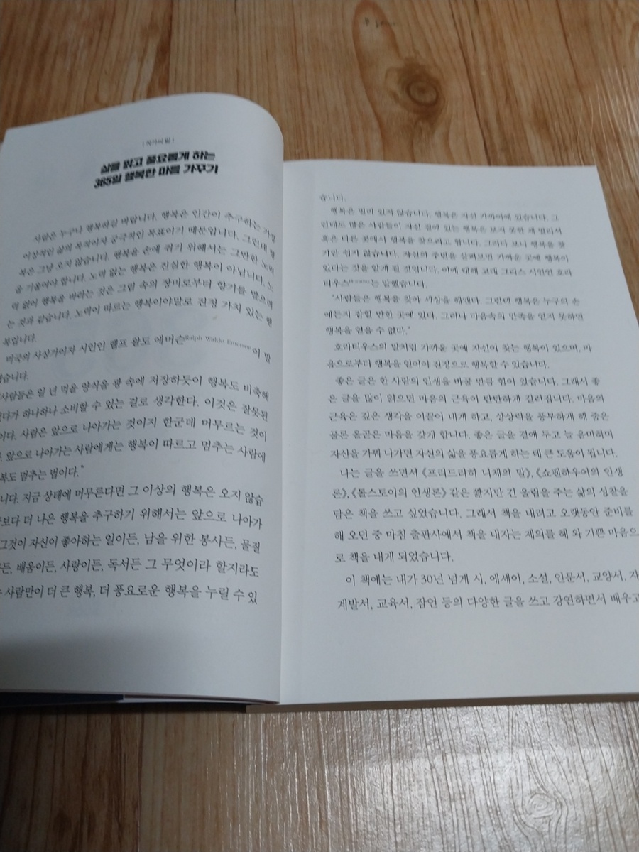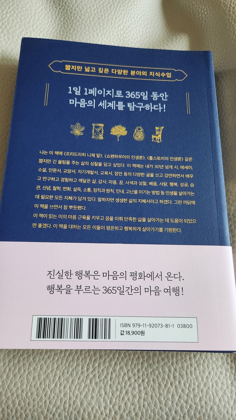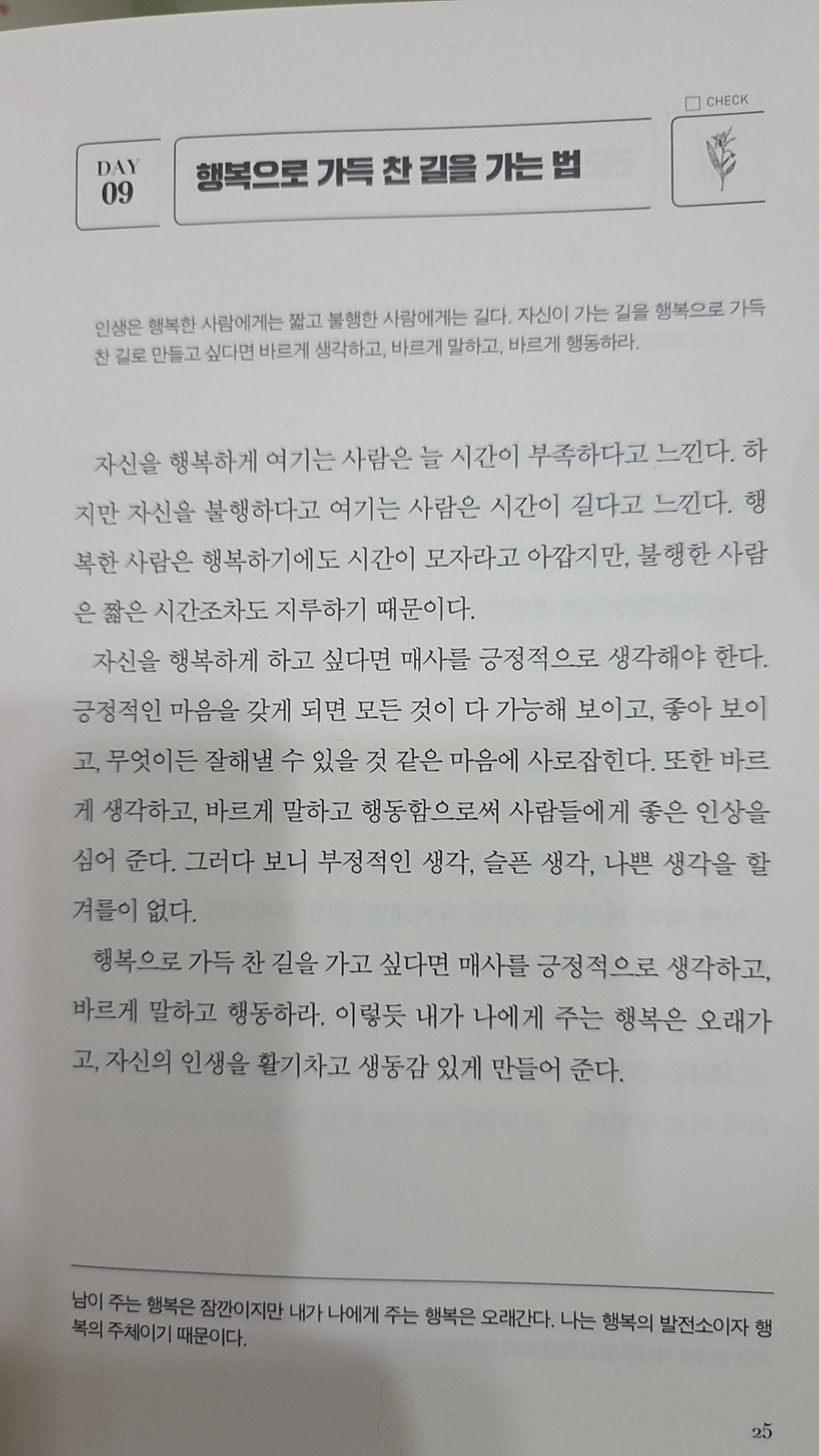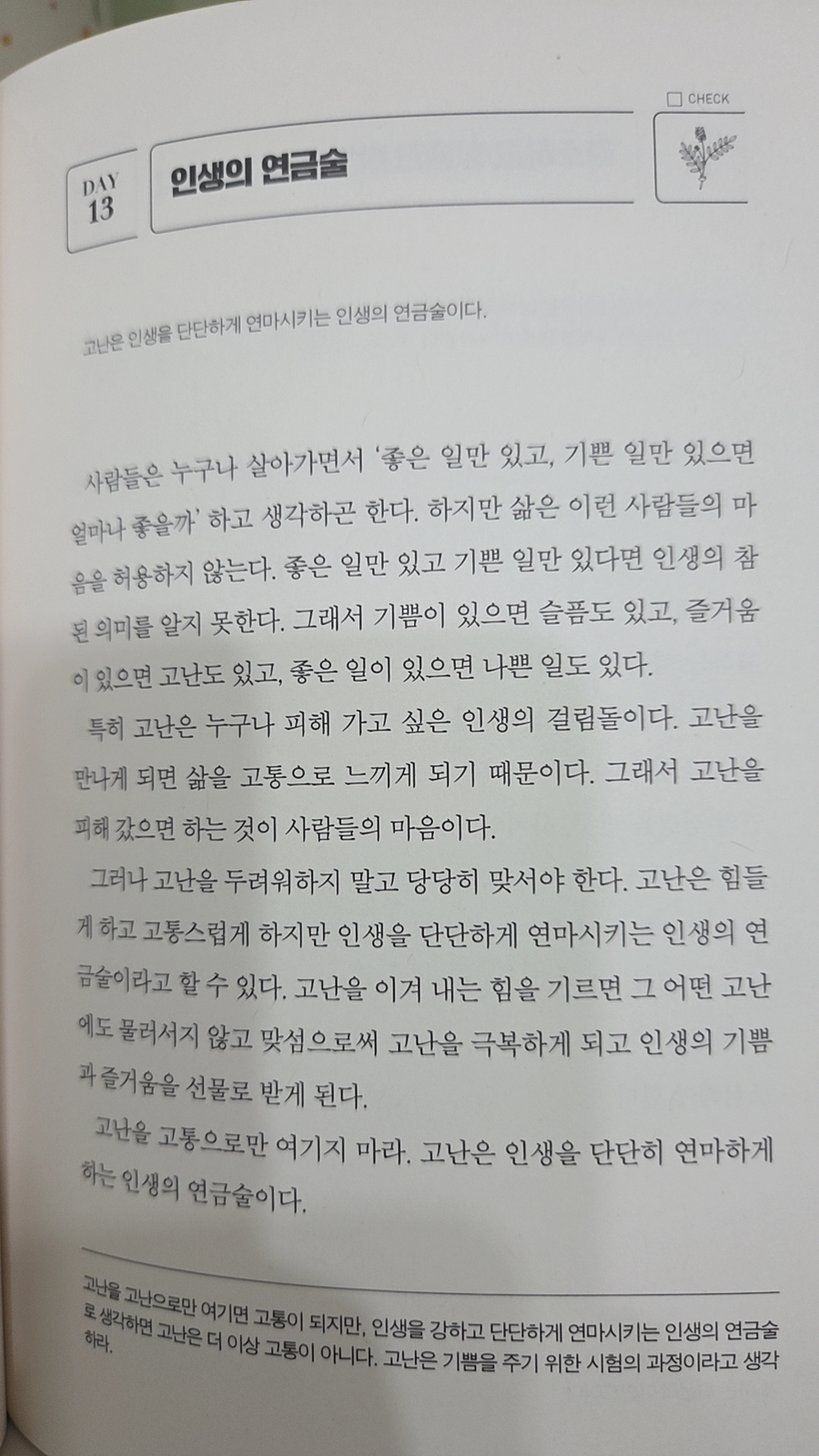'이 리뷰는 컬처블룸을 통해 출판사에서 도서를 제공 받아, 직접 읽고 작성한 리뷰입니다.' 1일 1페이지 시리즈 책은 익히 알고 있었고, 예전에 교양편을 읽어보았었다. 하지만 처음부터 끝까지 다 읽은 것은 아니고, 읽고 싶은 부분이나 알고 싶은 내용만 선별해서 읽었다. 이번 책은 마음편이라 지식쌓기보다는 마음수양에 가깝기에 부분적으로 선별해서 읽기보다는 차례대로 하나씩 읽으면 될 것 같고, 필사에도 적합해보인다. 1월 1일부터 12월 31일까지 글들이 날짜별로 순번이 매겨져 매일매일 명상타임이나 필사타임으로 딱이다. 주말빼고 읽다보면 2년이면 다 읽지않을까? 이 책이 손에 들어온 날, 9월 15일. 그 날에 쓰여진 글구는,