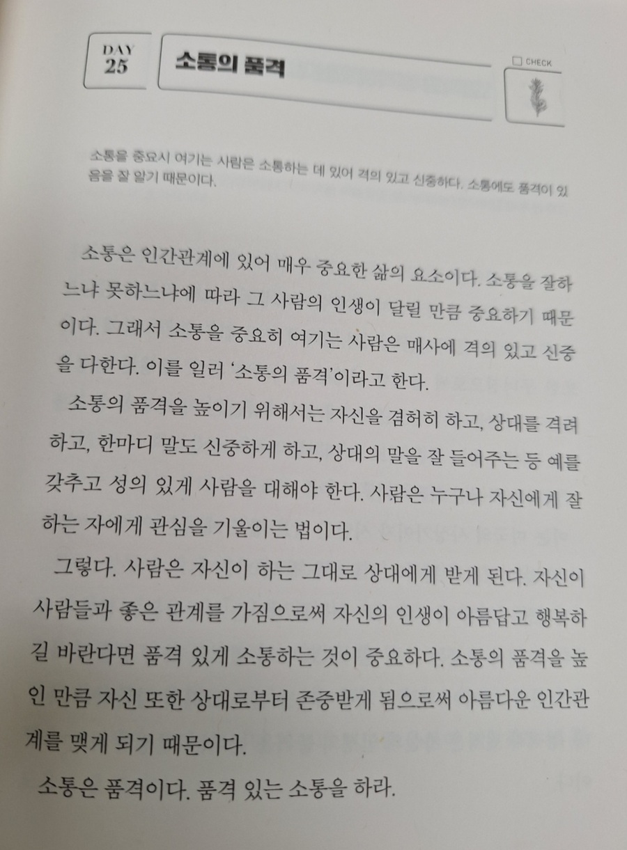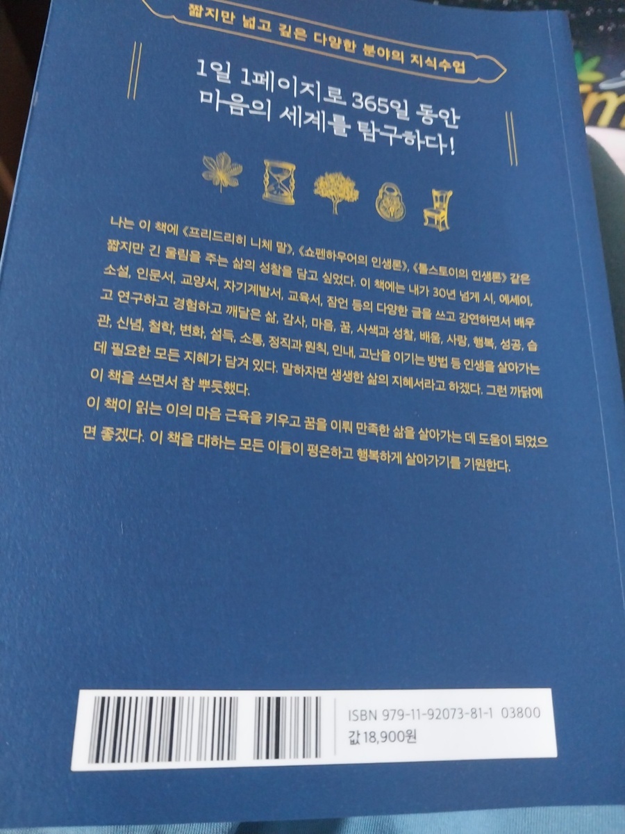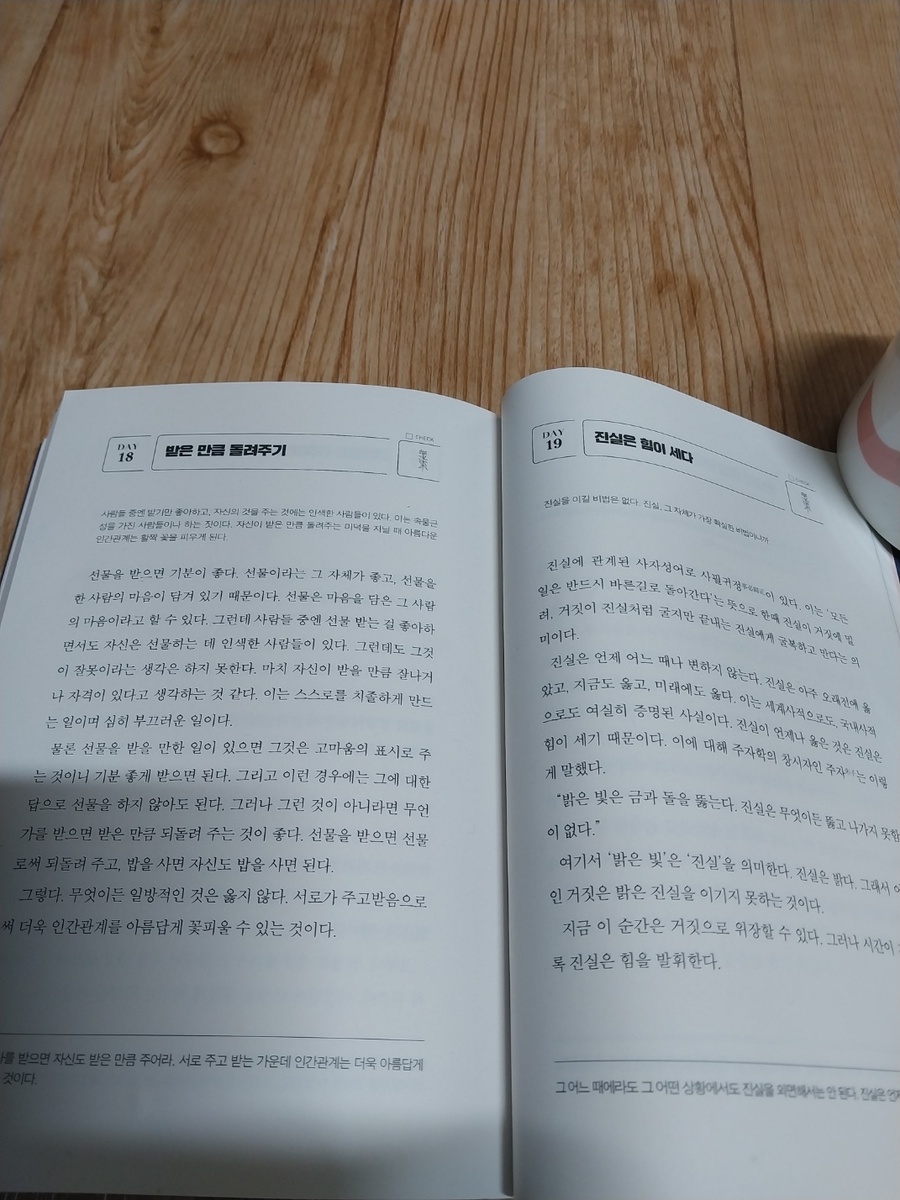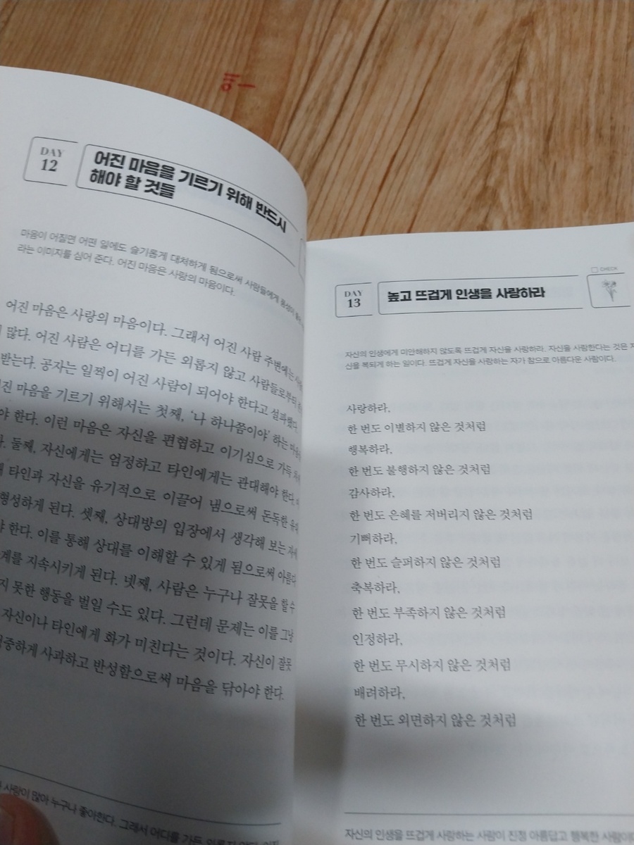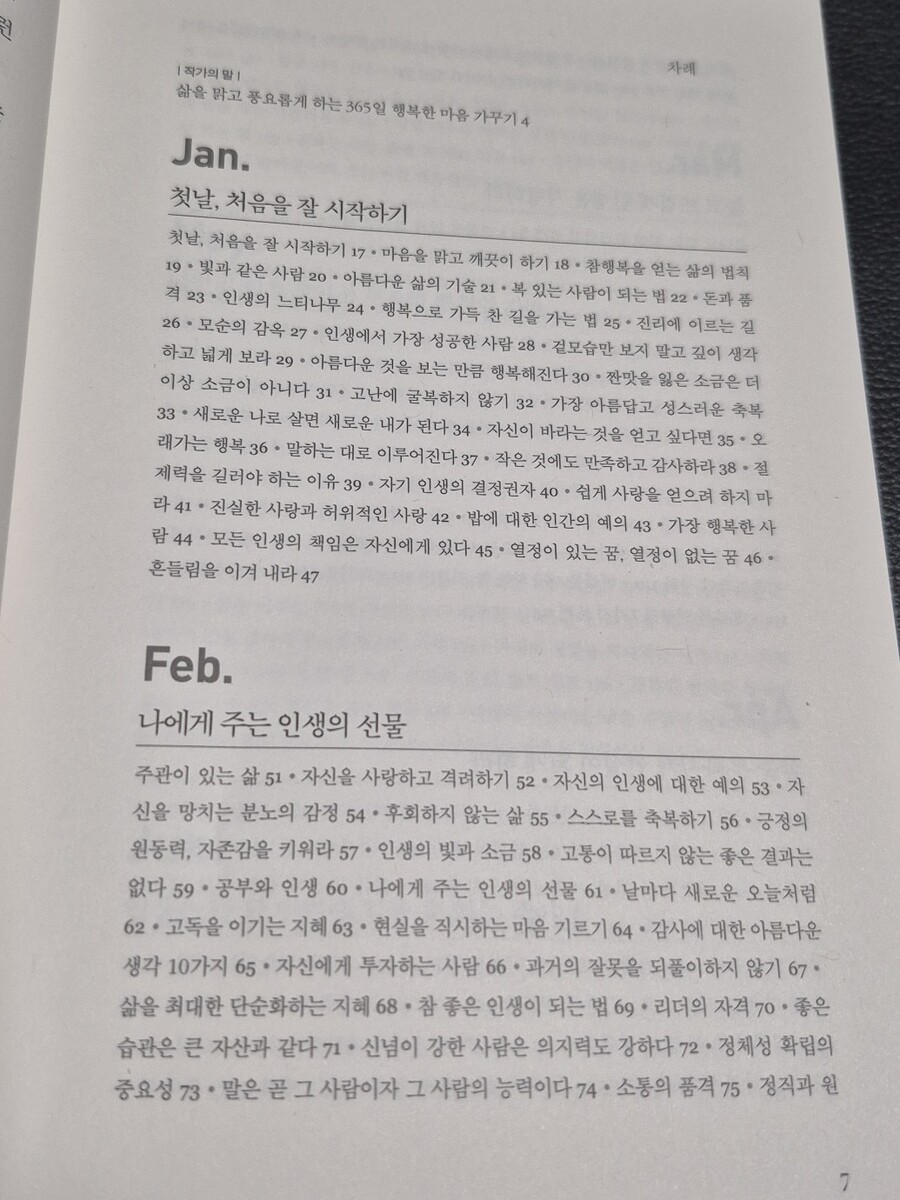 '이 리뷰는 컬처블룸을 통해 출판사에서 도서를 제공 받아, 직접 읽고 작성한 리뷰입니다.' 1일 1페이지 시리즈 책은 익히 알고 있었고, 예전에 교양편을 읽어보았었다. 하지만 처음부터 끝까지 다 읽은 것은 아니고, 읽고 싶은 부분이나 알고 싶은 내용만 선별해서 읽었다. 이번 책은 마음편이라 지식쌓기보다는 마음수양에 가깝기에 부분적으로 선별해서 읽기보다는 차례대로 하나씩 읽으면 될 것 같고, 필사에도 적합해보인다. 1월 1일부터 12월 31일까지 글들이 날짜별로 순번이 매겨져 매일매일 명상타임이나 필사타임으로 딱이다. 주말빼고 읽다보면 2년이면 다 읽지않을까? 이 책이 손에 들어온 날, 9월 15일. 그 날에 쓰여진 글구는,