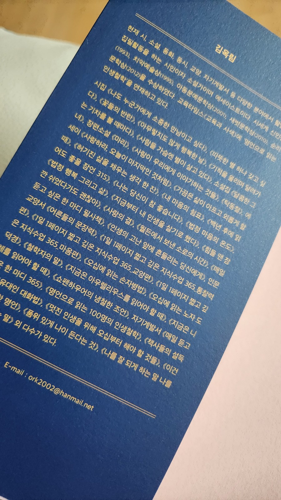 중년이 되면서 부터는 마음이 참 복잡하다. 생각할 것도 많고 이러저러한 일들도 많이 벌어지고 있다. 어떤때는 마음 한구석이 텅 빈듯한 느낌이 들기도 한다. 가을은 독서의 계절이라 그런지 역시 책과 함께 하기에 너무도 좋다. 특히나 올해처럼 더운 여름이 가고 제법 서늘한 기운이 도니 조용한 밤에 책을 읽기에 안성마춤이다. 1일 1페이지 짧고 깊은 지식 수업이란 책을 통해 많은 것을 배웠다. 책표지부터 깊은 마음속을 들여다 보는 느낌이다. 이책을 한페이지 한페이지 넘기면서 그동안 쌓여있던 마음속의 짐을 내려놓은듯한 느낌마저 든다. 그동안 쓸모없는 많은 것들을 무겁게 등에 지고 살아온 느낌이라고 할까? 이책을 통해 내삶의 방향이 긍정적으로 변화되었음을 깨닫게 되었다. 작가의 말처럼 삶을 맑고 풍요롭게 하여 스스로 행복을 찾아가는 것 같다. 자연스레 행복이 스며드는 느낌이 든다. 마음의 평화가 함께 하는 듯 하여 너무 좋다. 작가의 긴 글속에서 많은 교훈을 얻을 수 있음은 물로 중간중간 시도 함께 수록되어 있어 잠지 쉬어가는 맘으로 책을 읽을 수있다. 이 글 속에서 내가 배워야 할 것들을 많이 찾은 느낌이다. 내 마음속에 욕심들을 조금씩 내려놔야 한다는걸 알게 되었다. 알면서도 버리지 못했던 것들을 조금씩 버려야 겠다. 내 마음속을 깨긋이 가볍게 청소한 듯 하다. 언제나 처럼, 세상의 진리는 맞는것 같다. 거짓과 욕심으로 가득찬 요즘도 진실보다 강한건 없는것 같다. 현실이 괴롭고 힘들더라도 삶에 있어 진실되게 살아가야 겠다고 다짐을 한다. 한장 한장 길지는 않아도 작으면서도 큰 울림을 주는 작가의 말에 깊이 공감하고 고개가 끄덕여 진다. 이 책을 읽으면서 외면을 꾸미는것도 중요하겠지만 스스로 마음을 예쁘게 다스리는 것도 참 중요하다란 생각이 든다. 경제적으로 아무리 풍족하고 사회적으로 성공했다 해도 때때로 불행한 사람이 있다. 이들도 진정한 행복한 삶을 살기 위해서는 이처럼 마음 근육을 키워야 하지 않을까 생각한다. 우리 모두가 따뜻한 마음을 가지고 행복하기 위해서는 많은 노력이 필요한 것 같다. 행복한 삶을 추구하는 많은 분들께 이 책을 추천하고 싶다. #1일1페이지짧고깊은지식수업 #미르북#김옥림#컬쳐블룸#컬쳐블룸서평단 |