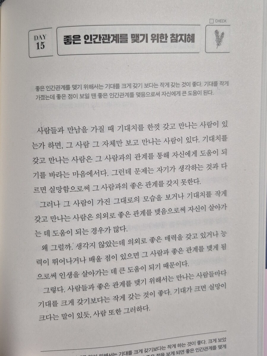 작가의 말처럼 기대가 크면 실망이 크다는 게 사물에 한해서가 아닌 사람에게도 적용가능함을 알려준다. 대상이 무엇이든 기대치를 작게 가지거나 편견이나 선입견이 없이 대한다면 나쁠 것은 없다는 것인데, 머리로는 아는 것을 행동으로 옮기는 게 쉽지는 않다는 게 슬플 뿐... 그리고 이런 책을 읽게 되면 꼭 확인하게 된다. 내 생일에는 어떤 글이 있는지ㅋ