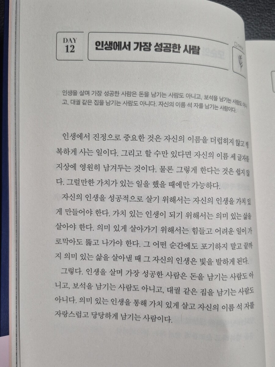 처음에 읽는데 거창한 의미처럼 느껴져 부담이 되는 글구로 받아들여졌다. 이름을 남긴다는 것은 우리가 흔히 아는 세종대왕이나 이순신처럼 위인과 동일하게 생각하는 경향이 있다. 하지만 작가는 이름을 남기는 행위가 포기하지 않고 의미있는 삶을 살아가라는 의미라고 설명하고 있다. 내일이 아닌 지금 이 순간을 열심히 살아야겠다며 다짐해본다. 알고는 있지만 잊고 있던 생각들을 이 책을 읽으면서 다시 한번 곱씹을 수 있는 기회가 되었고, 마음으로 닿는 글구들이 앞으로의 나의 삶에 자양분이 되길 바래본다. |